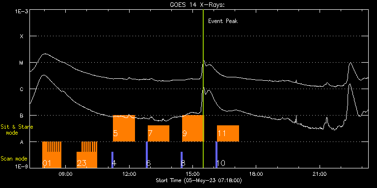 EIS Observation timeline overlay to GOES-Xray curve Code 1" 2" 40" 266" EIS Observations list for this event: STUDY ACRONYM ID DATE OBSERVED DESCRIPTION NOAA# TARGET 0 HH_AR+FLR_RAS_N03 | 86116 | 2023/05/05 07:54:19 | HOP 401 - dynamics of flux cancellatio | 3296 | Active Region TIMELINE ID DATE OBSERVED FITS FILE XCEN (+W/-E) YCEN (+N/-S) DUR ----------------------------------------------------------------------------------------------------------------- 86116 | 2023/05/05 07:54:19.000 | eis_l0_20230505_075419.fits.gz | -306.40 | 218.51 | 13m18s 1 HH_Flare_60x152f | 86117 | 2023/05/05 08:07:42 | HOP 401 - dynamics of flux cancellatio | 3296 | Flare TIMELINE ID DATE OBSERVED FITS FILE XCEN (+W/-E) YCEN (+N/-S) DUR ----------------------------------------------------------------------------------------------------------------- 86117 | 2023/05/05 08:07:42.000 | eis_l0_20230505_080742.fits.gz | -307.79 | 262.43 | 2m48s 86117 | 2023/05/05 08:10:33.000 | eis_l0_20230505_081033.fits.gz | -307.33 | 262.36 | 2m48s 86117 | 2023/05/05 08:13:24.000 | eis_l0_20230505_081324.fits.gz | -306.95 | 262.43 | 2m48s 86117 | 2023/05/05 08:16:15.000 | eis_l0_20230505_081615.fits.gz | -306.64 | 262.43 | 2m47s 86117 | 2023/05/05 08:19:05.000 | eis_l0_20230505_081905.fits.gz | -306.25 | 262.36 | 2m48s 86117 | 2023/05/05 08:21:56.000 | eis_l0_20230505_082156.fits.gz | -305.79 | 262.43 | 2m48s 86117 | 2023/05/05 08:24:47.000 | eis_l0_20230505_082447.fits.gz | -305.40 | 262.51 | 2m48s 86117 | 2023/05/05 08:27:38.000 | eis_l0_20230505_082738.fits.gz | -305.01 | 262.43 | 2m48s 86117 | 2023/05/05 08:30:28.000 | eis_l0_20230505_083028.fits.gz | -304.63 | 262.43 | 2m48s 86117 | 2023/05/05 08:33:19.000 | eis_l0_20230505_083319.fits.gz | -304.24 | 262.51 | 2m48s 86117 | 2023/05/05 08:36:10.000 | eis_l0_20230505_083610.fits.gz | -303.78 | 262.43 | 2m48s 86117 | 2023/05/05 08:39:00.000 | eis_l0_20230505_083900.fits.gz | -303.39 | 262.51 | 2m48s 86117 | 2023/05/05 08:41:51.000 | eis_l0_20230505_084151.fits.gz | -302.93 | 262.43 | 2m48s 86117 | 2023/05/05 08:44:42.000 | eis_l0_20230505_084442.fits.gz | -302.46 | 262.36 | 2m48s 2 HH_AR+FLR_RAS_N03 | 86118 | 2023/05/05 09:32:13 | HOP 401 - dynamics of flux cancellatio | 3296 | Active Region TIMELINE ID DATE OBSERVED FITS FILE XCEN (+W/-E) YCEN (+N/-S) DUR ----------------------------------------------------------------------------------------------------------------- 86118 | 2023/05/05 09:32:13.000 | eis_l0_20230505_093213.fits.gz | -292.50 | 218.82 | 13m19s 3 HH_Flare_60x152f | 86119 | 2023/05/05 09:45:36 | HOP 401 - dynamics of flux cancellatio | 3296 | Flare TIMELINE ID DATE OBSERVED FITS FILE XCEN (+W/-E) YCEN (+N/-S) DUR ----------------------------------------------------------------------------------------------------------------- 86119 | 2023/05/05 09:45:36.000 | eis_l0_20230505_094536.fits.gz | -293.81 | 262.59 | 2m49s 86119 | 2023/05/05 09:48:28.000 | eis_l0_20230505_094828.fits.gz | -293.43 | 262.59 | 2m47s 86119 | 2023/05/05 09:51:18.000 | eis_l0_20230505_095118.fits.gz | -293.04 | 262.59 | 2m48s 86119 | 2023/05/05 09:54:09.000 | eis_l0_20230505_095409.fits.gz | -292.58 | 262.59 | 2m48s 86119 | 2023/05/05 09:57:00.000 | eis_l0_20230505_095700.fits.gz | -292.19 | 262.59 | 2m48s 86119 | 2023/05/05 09:59:51.000 | eis_l0_20230505_095951.fits.gz | -291.80 | 262.59 | 2m48s 86119 | 2023/05/05 10:02:41.000 | eis_l0_20230505_100241.fits.gz | -291.42 | 262.67 | 2m48s 86119 | 2023/05/05 10:05:32.000 | eis_l0_20230505_100532.fits.gz | -291.03 | 262.67 | 2m48s 86119 | 2023/05/05 10:08:23.000 | eis_l0_20230505_100823.fits.gz | -290.64 | 262.67 | 2m48s 86119 | 2023/05/05 10:11:14.000 | eis_l0_20230505_101114.fits.gz | -290.18 | 262.67 | 2m48s 86119 | 2023/05/05 10:14:04.000 | eis_l0_20230505_101404.fits.gz | -289.80 | 262.67 | 2m49s 86119 | 2023/05/05 10:16:56.000 | eis_l0_20230505_101656.fits.gz | -289.41 | 262.59 | 2m47s 86119 | 2023/05/05 10:19:46.000 | eis_l0_20230505_101946.fits.gz | -288.95 | 262.67 | 2m48s 86119 | 2023/05/05 10:22:37.000 | eis_l0_20230505_102237.fits.gz | -288.56 | 262.59 | 2m49s 86119 | 2023/05/05 10:25:28.000 | eis_l0_20230505_102528.fits.gz | -288.10 | 262.67 | 2m48s 4 PRY_slot_context_v4 | 86133 | 2023/05/05 11:10:20 | Major flare watch | 3293 | Active Region TIMELINE ID DATE OBSERVED FITS FILE XCEN (+W/-E) YCEN (+N/-S) DUR ----------------------------------------------------------------------------------------------------------------- 86133 | 2023/05/05 11:10:20.000 | eis_l0_20230505_111020.fits.gz | -278.88 | 88.90 | 4m11s 5 Flare_SNS_v2 | 86134 | 2023/05/05 11:14:56 | Major flare watch | | Flare TIMELINE ID DATE OBSERVED FITS FILE XCEN (+W/-E) YCEN (+N/-S) DUR ----------------------------------------------------------------------------------------------------------------- 86134 | 2023/05/05 11:14:56.000 | eis_l0_20230505_111456.fits.gz | -278.74 | 256.74 | 1h0m21s 6 PRY_slot_context_v4 | 86141 | 2023/05/05 12:48:19 | Major flare watch | 3293 | Active Region TIMELINE ID DATE OBSERVED FITS FILE XCEN (+W/-E) YCEN (+N/-S) DUR ----------------------------------------------------------------------------------------------------------------- 86141 | 2023/05/05 12:48:19.000 | eis_l0_20230505_124819.fits.gz | -264.82 | 89.13 | 4m11s 7 Flare_SNS_v2 | 86142 | 2023/05/05 12:52:56 | Major flare watch | | Flare TIMELINE ID DATE OBSERVED FITS FILE XCEN (+W/-E) YCEN (+N/-S) DUR ----------------------------------------------------------------------------------------------------------------- 86142 | 2023/05/05 12:52:56.000 | eis_l0_20230505_125256.fits.gz | -264.68 | 256.98 | 1h0m19s 8 PRY_slot_context_v4 | 86143 | 2023/05/05 14:26:19 | Major flare watch | 3293 | Active Region TIMELINE ID DATE OBSERVED FITS FILE XCEN (+W/-E) YCEN (+N/-S) DUR ----------------------------------------------------------------------------------------------------------------- 86143 | 2023/05/05 14:26:19.000 | eis_l0_20230505_142619.fits.gz | -250.68 | 89.28 | 4m11s 9 Flare_SNS_v2 | 86144 | 2