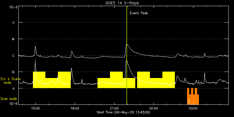 EIS Observation timeline overlay to GOES-Xray curve Code 1" 2" 40" 266" EIS Observations list for this event: STUDY ACRONYM ID DATE OBSERVED DESCRIPTION NOAA# TARGET 0 Flare266_Hunter01 | 86199 | 2023/05/06 14:48:40 | Flare watch | 3296 | Flare TIMELINE ID DATE OBSERVED FITS FILE XCEN (+W/-E) YCEN (+N/-S) DUR ----------------------------------------------------------------------------------------------------------------- 86199 | 2023/05/06 14:48:40.000 | eis_l0_20230506_144840.fits.gz | -230.74 | 211.12 | 56m23s 86199 | 2023/05/06 15:45:55.000 | eis_l0_20230506_154555.fits.gz | -222.55 | 211.04 | 56m22s 86199 | 2023/05/06 16:43:09.000 | eis_l0_20230506_164309.fits.gz | -214.37 | 211.27 | 56m23s 1 Flare266_Hunter01 | 86200 | 2023/05/06 19:44:13 | Flare watch | 3296 | Flare TIMELINE ID DATE OBSERVED FITS FILE XCEN (+W/-E) YCEN (+N/-S) DUR ----------------------------------------------------------------------------------------------------------------- 86200 | 2023/05/06 19:44:13.000 | eis_l0_20230506_194413.fits.gz | -188.18 | 211.50 | 56m22s 86200 | 2023/05/06 20:41:27.000 | eis_l0_20230506_204127.fits.gz | -179.84 | 211.27 | 56m23s 86200 | 2023/05/06 21:38:42.000 | eis_l0_20230506_213842.fits.gz | -171.49 | 211.43 | 56m22s 2 Flare266_Hunter01 | 86201 | 2023/05/06 22:45:13 | Flare watch | 3296 | Flare TIMELINE ID DATE OBSERVED FITS FILE XCEN (+W/-E) YCEN (+N/-S) DUR ----------------------------------------------------------------------------------------------------------------- 86201 | 2023/05/06 22:45:13.000 | eis_l0_20230506_224513.fits.gz | -161.84 | 211.35 | 56m22s 86201 | 2023/05/06 23:42:27.000 | eis_l0_20230506_234227.fits.gz | -153.50 | 211.35 | 56m23s 86201 | 2023/05/07 00:39:42.000 | eis_l0_20230507_003942.fits.gz | -145.08 | 211.43 | 56m22s 3 FlareResponse01 | 86180 | 2023/05/07 02:32:20 | Major Flare watch | 3297 | Flare TIMELINE ID DATE OBSERVED FITS FILE XCEN (+W/-E) YCEN (+N/-S) DUR ----------------------------------------------------------------------------------------------------------------- 86180 | 2023/05/07 02:32:20.000 | eis_l0_20230507_023220.fits.gz | -128.69 | 209.50 | 8m52s 86180 | 2023/05/07 02:41:15.000 | eis_l0_20230507_024115.fits.gz | -127.22 | 209.35 | 8m52s 86180 | 2023/05/07 02:50:11.000 | eis_l0_20230507_025011.fits.gz | -125.98 | 209.35 | 8m52s 86180 | 2023/05/07 02:59:06.000 | eis_l0_20230507_025906.fits.gz | -124.75 | 209.35 | 8m52s 86180 | 2023/05/07 03:08:01.000 | eis_l0_20230507_030801.fits.gz | -123.43 | 209.43 | 8m52s 86180 | 2023/05/07 03:16:56.000 | eis_l0_20230507_031656.fits.gz | -122.12 | 209.50 | 8m52s : Check study information : Download file : View thumbnails For this event, also check for: