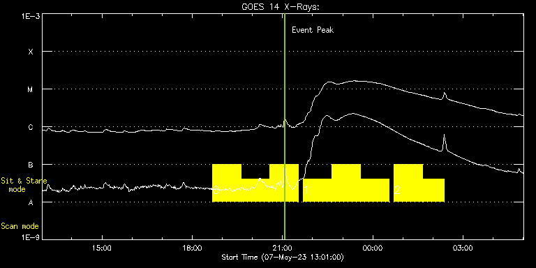 EIS Observation timeline overlay to GOES-Xray curve Code 1" 2" 40" 266" EIS Observations list for this event: STUDY ACRONYM ID DATE OBSERVED DESCRIPTION NOAA# TARGET 0 Flare266_Hunter01 | 86203 | 2023/05/07 18:40:40 | Flare watch | 3296 | Flare TIMELINE ID DATE OBSERVED FITS FILE XCEN (+W/-E) YCEN (+N/-S) DUR ----------------------------------------------------------------------------------------------------------------- 86203 | 2023/05/07 18:40:40.000 | eis_l0_20230507_184040.fits.gz | 13.98 | 210.81 | 56m22s 86203 | 2023/05/07 19:37:54.000 | eis_l0_20230507_193754.fits.gz | 22.40 | 210.50 | 56m22s 86203 | 2023/05/07 20:35:08.000 | eis_l0_20230507_203508.fits.gz | 30.89 | 210.58 | 56m23s 1 Flare266_Hunter01 | 86204 | 2023/05/07 21:41:12 | Flare watch | 3296 | Flare TIMELINE ID DATE OBSERVED FITS FILE XCEN (+W/-E) YCEN (+N/-S) DUR ----------------------------------------------------------------------------------------------------------------- 86204 | 2023/05/07 21:41:12.000 | eis_l0_20230507_214112.fits.gz | 40.55 | 210.19 | 56m23s 86204 | 2023/05/07 22:38:27.000 | eis_l0_20230507_223827.fits.gz | 48.97 | 210.11 | 56m22s 86204 | 2023/05/07 23:35:41.000 | eis_l0_20230507_233541.fits.gz | 57.39 | 210.11 | 56m23s 2 Flare266_Hunter01 | 86205 | 2023/05/08 00:42:12 | Flare watch | 3297 | Flare TIMELINE ID DATE OBSERVED FITS FILE XCEN (+W/-E) YCEN (+N/-S) DUR ----------------------------------------------------------------------------------------------------------------- 86205 | 2023/05/08 00:42:12.000 | eis_l0_20230508_004212.fits.gz | 67.20 | 209.80 | 56m22s 86205 | 2023/05/08 01:39:27.000 | eis_l0_20230508_013927.fits.gz | 76.39 | 209.80 | 43m1s : Check study information : Download file : View thumbnails For this event, also check for: