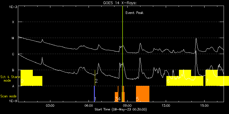 EIS Observation timeline overlay to GOES-Xray curve Code 1" 2" 40" 266" EIS Observations list for this event: STUDY ACRONYM ID DATE OBSERVED DESCRIPTION NOAA# TARGET 0 Flare266_Hunter01 | 86205 | 2023/05/08 00:42:12 | Flare watch | 3297 | Flare TIMELINE ID DATE OBSERVED FITS FILE XCEN (+W/-E) YCEN (+N/-S) DUR ----------------------------------------------------------------------------------------------------------------- 86205 | 2023/05/08 00:42:12.000 | eis_l0_20230508_004212.fits.gz | 67.20 | 209.80 | 56m22s 86205 | 2023/05/08 01:39:27.000 | eis_l0_20230508_013927.fits.gz | 76.39 | 209.80 | 43m1s 1 PRY_slot_contextLITE | 86162 | 2023/05/08 06:25:19 | Pointing Monitoring | 3294 | Active Region TIMELINE ID DATE OBSERVED FITS FILE XCEN (+W/-E) YCEN (+N/-S) DUR ----------------------------------------------------------------------------------------------------------------- 86162 | 2023/05/08 06:25:19.000 | eis_l0_20230508_062519.fits.gz | 0.76 | -194.92 | 2m56s 2 XRT_synop_AIA | 86163 | 2023/05/08 06:28:33 | Pointing Monitoring | 3294 | Quiet Sun TIMELINE ID DATE OBSERVED FITS FILE XCEN (+W/-E) YCEN (+N/-S) DUR ----------------------------------------------------------------------------------------------------------------- 86163 | 2023/05/08 06:28:33.000 | eis_l0_20230508_062833.fits.gz | 0.51 | -206.92 | 10s 3 HH_AR+FLR_RAS_N03 | 86156 | 2023/05/08 08:02:19 | HOP 401 (with SST and IRIS - Dynamics | 3297 | Active Region TIMELINE ID DATE OBSERVED FITS FILE XCEN (+W/-E) YCEN (+N/-S) DUR ----------------------------------------------------------------------------------------------------------------- 86156 | 2023/05/08 08:02:19.000 | eis_l0_20230508_080219.fits.gz | 131.89 | 234.80 | 13m19s 4 HH_Flare_60x152f | 86157 | 2023/05/08 08:15:42 | HOP 401 (with SST and IRIS - Dynamics | | Flare TIMELINE ID DATE OBSERVED FITS FILE XCEN (+W/-E) YCEN (+N/-S) DUR ----------------------------------------------------------------------------------------------------------------- 86157 | 2023/05/08 08:15:42.000 | eis_l0_20230508_081542.fits.gz | 132.74 | 278.88 | 2m9s 86157 | 2023/05/08 08:33:33.000 | eis_l0_20230508_083333.fits.gz | 135.29 | 278.72 | 2m2s 86157 | 2023/05/08 08:35:38.000 | eis_l0_20230508_083538.fits.gz | 135.52 | 278.80 | 2m48s 86157 | 2023/05/08 08:38:28.000 | eis_l0_20230508_083828.fits.gz | 135.99 | 278.72 | 2m48s 86157 | 2023/05/08 08:41:19.000 | eis_l0_20230508_084119.fits.gz | 126.10 | 279.03 | 2m48s 86157 | 2023/05/08 08:44:10.000 | eis_l0_20230508_084410.fits.gz | 126.10 | 279.03 | 2m48s 5 Atlas_60 | 86179 | 2023/05/08 09:40:43 | Active Region Studies | | Quiet Sun TIMELINE ID DATE OBSERVED FITS FILE XCEN (+W/-E) YCEN (+N/-S) DUR ----------------------------------------------------------------------------------------------------------------- 86179 | 2023/05/08 09:40:43.000 | eis_l0_20230508_094043.fits.gz | 145.72 | 274.57 | 1h1m39s 6 Flare266_Hunter01 | 86206 | 2023/05/08 12:03:33 | Flare watch | 3297 | Flare TIMELINE ID DATE OBSERVED FITS FILE XCEN (+W/-E) YCEN (+N/-S) DUR ----------------------------------------------------------------------------------------------------------------- 86206 | 2023/05/08 12:03:33.000 | eis_l0_20230508_120333.fits.gz | 166.39 | 208.10 | 56m22s 86206 | 2023/05/08 13:00:47.000 | eis_l0_20230508_130047.fits.gz | 174.73 | 207.95 | 56m23s 86206 | 2023/05/08 13:58:02.000 | eis_l0_20230508_135802.fits.gz | 182.92 | 207.72 | 56m22s 7 Flare266_Hunter01 | 86207 | 2023/05/08 15:04:39 | Flare watch | 3296 | Flare TIMELINE ID DATE OBSERVED FITS FILE XCEN (+W/-E) YCEN (+N/-S) DUR ----------------------------------------------------------------------------------------------------------------- 86207 | 2023/05/08 15:04:39.000 | eis_l0_20230508_150439.fits.gz | 192.50 | 207.49 | 56m23s 86207 | 2023/05/08 16:01:54.000 | eis_l0_20230508_160154.fits.gz | 200.68 | 207.41 | 56m23s 86207 | 2023/05/08 16:59:09.000 | eis_l0_20230508_165909.fits.gz | 208.87 | 207.10 | 56m22s : Check study information : Download file : View thumbnails For this event, also check for: