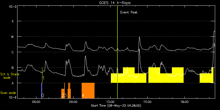 EIS Observation timeline overlay to GOES-Xray curve Code 1" 2" 40" 266" EIS Observations list for this event: STUDY ACRONYM ID DATE OBSERVED DESCRIPTION NOAA# TARGET 0 PRY_slot_contextLITE | 86162 | 2023/05/08 06:25:19 | Pointing Monitoring | 3294 | Active Region TIMELINE ID DATE OBSERVED FITS FILE XCEN (+W/-E) YCEN (+N/-S) DUR ----------------------------------------------------------------------------------------------------------------- 86162 | 2023/05/08 06:25:19.000 | eis_l0_20230508_062519.fits.gz | 0.76 | -194.92 | 2m56s 1 XRT_synop_AIA | 86163 | 2023/05/08 06:28:33 | Pointing Monitoring | 3294 | Quiet Sun TIMELINE ID DATE OBSERVED FITS FILE XCEN (+W/-E) YCEN (+N/-S) DUR ----------------------------------------------------------------------------------------------------------------- 86163 | 2023/05/08 06:28:33.000 | eis_l0_20230508_062833.fits.gz | 0.51 | -206.92 | 10s 2 HH_AR+FLR_RAS_N03 | 86156 | 2023/05/08 08:02:19 | HOP 401 (with SST and IRIS - Dynamics | 3297 | Active Region TIMELINE ID DATE OBSERVED FITS FILE XCEN (+W/-E) YCEN (+N/-S) DUR ----------------------------------------------------------------------------------------------------------------- 86156 | 2023/05/08 08:02:19.000 | eis_l0_20230508_080219.fits.gz | 131.89 | 234.80 | 13m19s 3 HH_Flare_60x152f | 86157 | 2023/05/08 08:15:42 | HOP 401 (with SST and IRIS - Dynamics | | Flare TIMELINE ID DATE OBSERVED FITS FILE XCEN (+W/-E) YCEN (+N/-S) DUR ----------------------------------------------------------------------------------------------------------------- 86157 | 2023/05/08 08:15:42.000 | eis_l0_20230508_081542.fits.gz | 132.74 | 278.88 | 2m9s 86157 | 2023/05/08 08:33:33.000 | eis_l0_20230508_083333.fits.gz | 135.29 | 278.72 | 2m2s 86157 | 2023/05/08 08:35:38.000 | eis_l0_20230508_083538.fits.gz | 135.52 | 278.80 | 2m48s 86157 | 2023/05/08 08:38:28.000 | eis_l0_20230508_083828.fits.gz | 135.99 | 278.72 | 2m48s 86157 | 2023/05/08 08:41:19.000 | eis_l0_20230508_084119.fits.gz | 126.10 | 279.03 | 2m48s 86157 | 2023/05/08 08:44:10.000 | eis_l0_20230508_084410.fits.gz | 126.10 | 279.03 | 2m48s 4 Atlas_60 | 86179 | 2023/05/08 09:40:43 | Active Region Studies | | Quiet Sun TIMELINE ID DATE OBSERVED FITS FILE XCEN (+W/-E) YCEN (+N/-S) DUR ----------------------------------------------------------------------------------------------------------------- 86179 | 2023/05/08 09:40:43.000 | eis_l0_20230508_094043.fits.gz | 145.72 | 274.57 | 1h1m39s 5 Flare266_Hunter01 | 86206 | 2023/05/08 12:03:33 | Flare watch | 3297 | Flare TIMELINE ID DATE OBSERVED FITS FILE XCEN (+W/-E) YCEN (+N/-S) DUR ----------------------------------------------------------------------------------------------------------------- 86206 | 2023/05/08 12:03:33.000 | eis_l0_20230508_120333.fits.gz | 166.39 | 208.10 | 56m22s 86206 | 2023/05/08 13:00:47.000 | eis_l0_20230508_130047.fits.gz | 174.73 | 207.95 | 56m23s 86206 | 2023/05/08 13:58:02.000 | eis_l0_20230508_135802.fits.gz | 182.92 | 207.72 | 56m22s 6 Flare266_Hunter01 | 86207 | 2023/05/08 15:04:39 | Flare watch | 3296 | Flare TIMELINE ID DATE OBSERVED FITS FILE XCEN (+W/-E) YCEN (+N/-S) DUR ----------------------------------------------------------------------------------------------------------------- 86207 | 2023/05/08 15:04:39.000 | eis_l0_20230508_150439.fits.gz | 192.50 | 207.49 | 56m23s 86207 | 2023/05/08 16:01:54.000 | eis_l0_20230508_160154.fits.gz | 200.68 | 207.41 | 56m23s 86207 | 2023/05/08 16:59:09.000 | eis_l0_20230508_165909.fits.gz | 208.87 | 207.10 | 56m22s 7 Flare266_Hunter01 | 86208 | 2023/05/08 19:14:12 | Flare watch | 3296 | Flare TIMELINE ID DATE OBSERVED FITS FILE XCEN (+W/-E) YCEN (+N/-S) DUR ----------------------------------------------------------------------------------------------------------------- 86208 | 2023/05/08 19:14:12.000 | eis_l0_20230508_191412.fits.gz | 228.03 | 206.87 | 56m22s 86208 | 2023/05/08 20:11:26.000 | eis_l0_20230508_201126.fits.gz | 236.22 | 206.48 | 8m41s : Check study information : Download file : View thumbnails For this event, also check for: