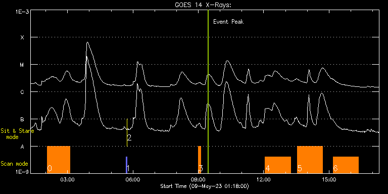 EIS Observation timeline overlay to GOES-Xray curve Code 1" 2" 40" 266" EIS Observations list for this event: STUDY ACRONYM ID DATE OBSERVED DESCRIPTION NOAA# TARGET 0 Atlas_60 | 86182 | 2023/05/09 02:04:19 | Active Region Studies | 3297 | Quiet Sun TIMELINE ID DATE OBSERVED FITS FILE XCEN (+W/-E) YCEN (+N/-S) DUR ----------------------------------------------------------------------------------------------------------------- 86182 | 2023/05/09 02:04:19.000 | eis_l0_20230509_020419.fits.gz | 285.25 | 269.09 | 1h1m39s 1 PRY_slot_contextLITE | 86164 | 2023/05/09 05:40:18 | Pointing Monitoring | 3299 | Active Region TIMELINE ID DATE OBSERVED FITS FILE XCEN (+W/-E) YCEN (+N/-S) DUR ----------------------------------------------------------------------------------------------------------------- 86164 | 2023/05/09 05:40:18.000 | eis_l0_20230509_054018.fits.gz | 0.76 | -195.00 | 2m56s 2 XRT_synop_AIA | 86165 | 2023/05/09 05:43:33 | Pointing Monitoring | 3299 | Quiet Sun TIMELINE ID DATE OBSERVED FITS FILE XCEN (+W/-E) YCEN (+N/-S) DUR ----------------------------------------------------------------------------------------------------------------- 86165 | 2023/05/09 05:43:33.000 | eis_l0_20230509_054333.fits.gz | 0.43 | -207.00 | 10s 3 HH_AR+FLR_RAS_N03 | 86158 | 2023/05/09 09:00:18 | HOP 401 (with SST and IRIS - Dynamics | 3297 | Active Region TIMELINE ID DATE OBSERVED FITS FILE XCEN (+W/-E) YCEN (+N/-S) DUR ----------------------------------------------------------------------------------------------------------------- 86158 | 2023/05/09 09:00:18.000 | eis_l0_20230509_090018.fits.gz | 342.76 | 227.01 | 6m52s 4 HOP81_new_study | 86216 | 2023/05/09 12:04:15 | HOP 81 (Polar Monitoring Campaign duri | | Coronal Hole TIMELINE ID DATE OBSERVED FITS FILE XCEN (+W/-E) YCEN (+N/-S) DUR ----------------------------------------------------------------------------------------------------------------- 86216 | 2023/05/09 12:04:15.000 | eis_l0_20230509_120415.fits.gz | -21.24 | 767.87 | 1h9m44s 5 HOP81_new_study | 86217 | 2023/05/09 13:32:44 | HOP 81 (Polar Monitoring Campaign duri | | Coronal Hole TIMELINE ID DATE OBSERVED FITS FILE XCEN (+W/-E) YCEN (+N/-S) DUR ----------------------------------------------------------------------------------------------------------------- 86217 | 2023/05/09 13:32:44.000 | eis_l0_20230509_133244.fits.gz | -20.91 | 767.95 | 1h9m45s 6 HOP81_new_study | 86218 | 2023/05/09 15:10:44 | HOP 81 (Polar Monitoring Campaign duri | | Coronal Hole TIMELINE ID DATE OBSERVED FITS FILE XCEN (+W/-E) YCEN (+N/-S) DUR ----------------------------------------------------------------------------------------------------------------- 86218 | 2023/05/09 15:10:44.000 | eis_l0_20230509_151044.fits.gz | -20.83 | 767.95 | 1h9m45s : Check study information : Download file : View thumbnails For this event, also check for:
