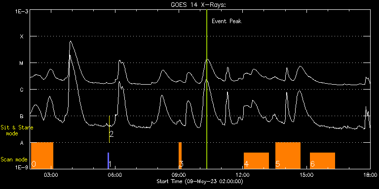 EIS Observation timeline overlay to GOES-Xray curve Code 1" 2" 40" 266" EIS Observations list for this event: STUDY ACRONYM ID DATE OBSERVED DESCRIPTION NOAA# TARGET 0 Atlas_60 | 86182 | 2023/05/09 02:04:19 | Active Region Studies | 3297 | Quiet Sun TIMELINE ID DATE OBSERVED FITS FILE XCEN (+W/-E) YCEN (+N/-S) DUR ----------------------------------------------------------------------------------------------------------------- 86182 | 2023/05/09 02:04:19.000 | eis_l0_20230509_020419.fits.gz | 285.25 | 269.09 | 1h1m39s 1 PRY_slot_contextLITE | 86164 | 2023/05/09 05:40:18 | Pointing Monitoring | 3299 | Active Region TIMELINE ID DATE OBSERVED FITS FILE XCEN (+W/-E) YCEN (+N/-S) DUR ----------------------------------------------------------------------------------------------------------------- 86164 | 2023/05/09 05:40:18.000 | eis_l0_20230509_054018.fits.gz | 0.76 | -195.00 | 2m56s 2 XRT_synop_AIA | 86165 | 2023/05/09 05:43:33 | Pointing Monitoring | 3299 | Quiet Sun TIMELINE ID DATE OBSERVED FITS FILE XCEN (+W/-E) YCEN (+N/-S) DUR ----------------------------------------------------------------------------------------------------------------- 86165 | 2023/05/09 05:43:33.000 | eis_l0_20230509_054333.fits.gz | 0.43 | -207.00 | 10s 3 HH_AR+FLR_RAS_N03 | 86158 | 2023/05/09 09:00:18 | HOP 401 (with SST and IRIS - Dynamics | 3297 | Active Region TIMELINE ID DATE OBSERVED FITS FILE XCEN (+W/-E) YCEN (+N/-S) DUR ----------------------------------------------------------------------------------------------------------------- 86158 | 2023/05/09 09:00:18.000 | eis_l0_20230509_090018.fits.gz | 342.76 | 227.01 | 6m52s 4 HOP81_new_study | 86216 | 2023/05/09 12:04:15 | HOP 81 (Polar Monitoring Campaign duri | | Coronal Hole TIMELINE ID DATE OBSERVED FITS FILE XCEN (+W/-E) YCEN (+N/-S) DUR ----------------------------------------------------------------------------------------------------------------- 86216 | 2023/05/09 12:04:15.000 | eis_l0_20230509_120415.fits.gz | -21.24 | 767.87 | 1h9m44s 5 HOP81_new_study | 86217 | 2023/05/09 13:32:44 | HOP 81 (Polar Monitoring Campaign duri | | Coronal Hole TIMELINE ID DATE OBSERVED FITS FILE XCEN (+W/-E) YCEN (+N/-S) DUR ----------------------------------------------------------------------------------------------------------------- 86217 | 2023/05/09 13:32:44.000 | eis_l0_20230509_133244.fits.gz | -20.91 | 767.95 | 1h9m45s 6 HOP81_new_study | 86218 | 2023/05/09 15:10:44 | HOP 81 (Polar Monitoring Campaign duri | | Coronal Hole TIMELINE ID DATE OBSERVED FITS FILE XCEN (+W/-E) YCEN (+N/-S) DUR ----------------------------------------------------------------------------------------------------------------- 86218 | 2023/05/09 15:10:44.000 | eis_l0_20230509_151044.fits.gz | -20.83 | 767.95 | 1h9m45s : Check study information : Download file : View thumbnails For this event, also check for: