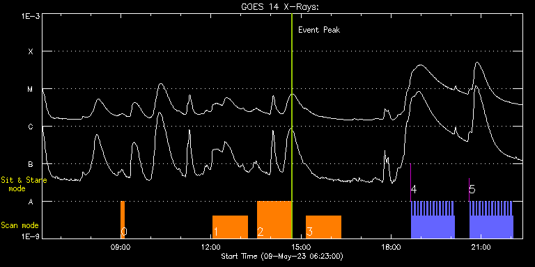 EIS Observation timeline overlay to GOES-Xray curve Code 1" 2" 40" 266" EIS Observations list for this event: STUDY ACRONYM ID DATE OBSERVED DESCRIPTION NOAA# TARGET 0 HH_AR+FLR_RAS_N03 | 86158 | 2023/05/09 09:00:18 | HOP 401 (with SST and IRIS - Dynamics | 3297 | Active Region TIMELINE ID DATE OBSERVED FITS FILE XCEN (+W/-E) YCEN (+N/-S) DUR ----------------------------------------------------------------------------------------------------------------- 86158 | 2023/05/09 09:00:18.000 | eis_l0_20230509_090018.fits.gz | 342.76 | 227.01 | 6m52s 1 HOP81_new_study | 86216 | 2023/05/09 12:04:15 | HOP 81 (Polar Monitoring Campaign duri | | Coronal Hole TIMELINE ID DATE OBSERVED FITS FILE XCEN (+W/-E) YCEN (+N/-S) DUR ----------------------------------------------------------------------------------------------------------------- 86216 | 2023/05/09 12:04:15.000 | eis_l0_20230509_120415.fits.gz | -21.24 | 767.87 | 1h9m44s 2 HOP81_new_study | 86217 | 2023/05/09 13:32:44 | HOP 81 (Polar Monitoring Campaign duri | | Coronal Hole TIMELINE ID DATE OBSERVED FITS FILE XCEN (+W/-E) YCEN (+N/-S) DUR ----------------------------------------------------------------------------------------------------------------- 86217 | 2023/05/09 13:32:44.000 | eis_l0_20230509_133244.fits.gz | -20.91 | 767.95 | 1h9m45s 3 HOP81_new_study | 86218 | 2023/05/09 15:10:44 | HOP 81 (Polar Monitoring Campaign duri | | Coronal Hole TIMELINE ID DATE OBSERVED FITS FILE XCEN (+W/-E) YCEN (+N/-S) DUR ----------------------------------------------------------------------------------------------------------------- 86218 | 2023/05/09 15:10:44.000 | eis_l0_20230509_151044.fits.gz | -20.83 | 767.95 | 1h9m45s 4 Alignment_modify_v2 | 86214 | 2023/05/09 18:38:27 | Co-alignment N. Pole | | Quiet Sun TIMELINE ID DATE OBSERVED FITS FILE XCEN (+W/-E) YCEN (+N/-S) DUR ----------------------------------------------------------------------------------------------------------------- 86214 | 2023/05/09 18:38:27.000 | eis_l0_20230509_183827.fits.gz | 0.51 | 752.83 | 1m 86214 | 2023/05/09 18:39:53.000 | eis_l0_20230509_183953.fits.gz | 0.36 | 752.98 | 2m33s 86214 | 2023/05/09 18:43:00.000 | eis_l0_20230509_184300.fits.gz | 0.51 | 752.83 | 2m34s 86214 | 2023/05/09 18:46:08.000 | eis_l0_20230509_184608.fits.gz | 0.43 | 752.83 | 2m34s 86214 | 2023/05/09 18:49:15.000 | eis_l0_20230509_184915.fits.gz | 0.43 | 752.91 | 2m34s 86214 | 2023/05/09 18:52:23.000 | eis_l0_20230509_185223.fits.gz | 0.43 | 752.91 | 2m34s 86214 | 2023/05/09 18:55:30.000 | eis_l0_20230509_185530.fits.gz | 0.43 | 752.83 | 2m34s 86214 | 2023/05/09 18:58:38.000 | eis_l0_20230509_185838.fits.gz | 0.51 | 752.83 | 2m34s 86214 | 2023/05/09 19:01:45.000 | eis_l0_20230509_190145.fits.gz | 0.43 | 752.91 | 2m34s 86214 | 2023/05/09 19:04:53.000 | eis_l0_20230509_190453.fits.gz | 0.43 | 752.91 | 2m34s 86214 | 2023/05/09 19:08:00.000 | eis_l0_20230509_190800.fits.gz | 0.43 | 752.91 | 2m34s 86214 | 2023/05/09 19:11:08.000 | eis_l0_20230509_191108.fits.gz | 0.51 | 752.91 | 2m34s 86214 | 2023/05/09 19:14:15.000 | eis_l0_20230509_191415.fits.gz | 0.43 | 752.91 | 2m34s 86214 | 2023/05/09 19:17:23.000 | eis_l0_20230509_191723.fits.gz | 0.51 | 752.83 | 2m34s 86214 | 2023/05/09 19:20:30.000 | eis_l0_20230509_192030.fits.gz | 0.43 | 752.83 | 2m34s 86214 | 2023/05/09 19:23:38.000 | eis_l0_20230509_192338.fits.gz | 0.43 | 752.91 | 2m34s 86214 | 2023/05/09 19:26:45.000 | eis_l0_20230509_192645.fits.gz | 0.51 | 752.91 | 2m34s 86214 | 2023/05/09 19:29:53.000 | eis_l0_20230509_192953.fits.gz | 0.51 | 752.91 | 2m34s 86214 | 2023/05/09 19:33:00.000 | eis_l0_20230509_193300.fits.gz | 0.51 | 752.83 | 2m34s 86214 | 2023/05/09 19:36:08.000 | eis_l0_20230509_193608.fits.gz | 0.51 | 752.83 | 2m34s 86214 | 2023/05/09 19:39:15.000 | eis_l0_20230509_193915.fits.gz | 0.43 | 752.83 | 2m34s 86214 | 2023/05/09 19:42:23.000 | eis_l0_20230509_194223.fits.gz | 0.43 | 752.83 | 2m34s 86214 | 2023/05/09 19:45:30.000 | eis_l0_20230509_194530.fits.gz | 0.43 | 752.98 | 2m34s 86214 | 2023/05/09 19:48:38.000 | eis_l0_20230509_194838.fits.gz | 0.43 | 753.06 | 2m34s 86214 | 2023/05/09 19:51:45.000 | eis_l0_20230509_195145.fits.gz | 0.51 | 752.98 | 2m34s 86214 | 2023/05/09 19:54:53.000 | eis_l0_20230509_195453.fits.gz | 0.51 | 752.83 | 2m34s 86214 | 2023/05/09 19:58:00.000 | eis_l0_20230509_195800.fits.gz | 0.43 | 752.83 | 2m34s 86214 | 2023/05/09 20:01:08.000 | eis_l0_20230509_200108.fits.gz | 0.43 | 753.06 | 2m34s 86214 | 2023/05/09 20:04:15.000 | eis_l0_20230509_200415.fits.gz | 0.51 | 752.98 | 2m34s 5 Alignment_modify_v2 | 86215 | 2023/05/09 20:35:21 | Co-alignment E. Limb | | Quiet Sun TIMELINE ID DATE OBSERVED FITS FILE XCEN (+W/-E) YCEN (+N/-S) DUR ----------------------------------------------------------------------------------------------------------------- 86215 | 2023/05/09 20:35:21.000 | eis_l0_20230509_203521.fits.gz | -9829.03 | -10169.70 | 1m 86215 | 2023/05/09 20:36:46.000 | eis_l0_20230509_203646.fits.gz | -9858.98 | -10169.70 | 2m34s 86215 | 2023/05/09 20:39:54.000 | eis_l0_20230509_203954.fits.gz | -9858.98 | -10169.70 | 2m34s 86215 | 2023/05/09 20:43:01.000 | eis_l0_20230509_204301.fits.gz | -9858.98 | -10169.70 | 2m34s 86215 | 2023/05/09 20:46:09.000 | eis_l0_20230509_204609.fits.gz | -9858.98 | -10169.70 | 2m34s 86215 | 2023/05/09 20:49:16.000 | eis_l0_20230509_204916.fits.gz | -9858.98 | -10169.70 | 2m34s 86215 | 2023/05/09 20:52:24.000 | eis_l0_20230509_205224.fits.gz | -9858.98 | -10169.70 | 2m34s 86215 | 2023/05/09 20:55:31.000 | eis_l0_20230509_205531.fits.gz | -9858.98 | -10169.70 | 2m34s 86215 | 2023/05/09 20:58:39.000 | eis_l0_20230509_205839.fits.gz | -9858.98 | -10169.70 | 2m34s 86215 | 2023/05/09 21:01:46.000 | eis_l0_20230509_210146.fits.gz | -9858.98 | -10169.70 | 2m34s 86215 | 2023/05/09 21:04:54.000 | eis_l0_20230509_210454.fits.gz | -9858.98 | -10169.70 | 2m33s 86215 | 2023/05/09 21:08:01.000 | eis_l0_20230509_210801.fits.gz | -9858.98 | -10169.70 | 2m34s 86215 | 2023/05/09 21:11:09.000 | eis_l0_2023050