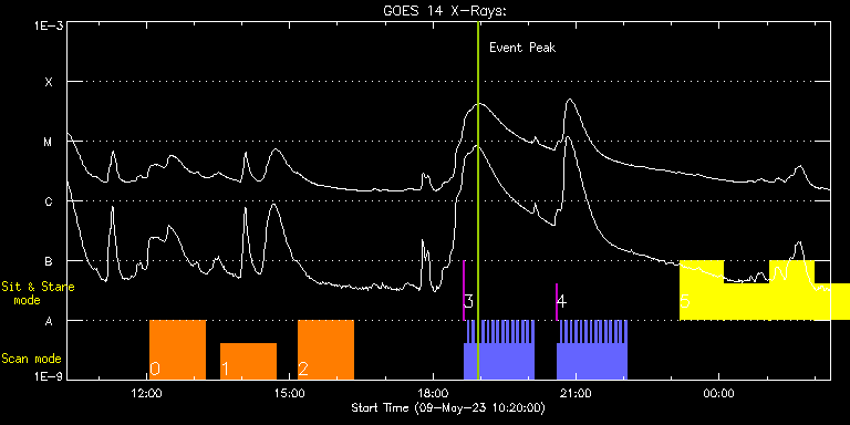 EIS Observation timeline overlay to GOES-Xray curve Code 1" 2" 40" 266" EIS Observations list for this event: STUDY ACRONYM ID DATE OBSERVED DESCRIPTION NOAA# TARGET 0 HOP81_new_study | 86216 | 2023/05/09 12:04:15 | HOP 81 (Polar Monitoring Campaign duri | | Coronal Hole TIMELINE ID DATE OBSERVED FITS FILE XCEN (+W/-E) YCEN (+N/-S) DUR ----------------------------------------------------------------------------------------------------------------- 86216 | 2023/05/09 12:04:15.000 | eis_l0_20230509_120415.fits.gz | -21.24 | 767.87 | 1h9m44s 1 HOP81_new_study | 86217 | 2023/05/09 13:32:44 | HOP 81 (Polar Monitoring Campaign duri | | Coronal Hole TIMELINE ID DATE OBSERVED FITS FILE XCEN (+W/-E) YCEN (+N/-S) DUR ----------------------------------------------------------------------------------------------------------------- 86217 | 2023/05/09 13:32:44.000 | eis_l0_20230509_133244.fits.gz | -20.91 | 767.95 | 1h9m45s 2 HOP81_new_study | 86218 | 2023/05/09 15:10:44 | HOP 81 (Polar Monitoring Campaign duri | | Coronal Hole TIMELINE ID DATE OBSERVED FITS FILE XCEN (+W/-E) YCEN (+N/-S) DUR ----------------------------------------------------------------------------------------------------------------- 86218 | 2023/05/09 15:10:44.000 | eis_l0_20230509_151044.fits.gz | -20.83 | 767.95 | 1h9m45s 3 Alignment_modify_v2 | 86214 | 2023/05/09 18:38:27 | Co-alignment N. Pole | | Quiet Sun TIMELINE ID DATE OBSERVED FITS FILE XCEN (+W/-E) YCEN (+N/-S) DUR ----------------------------------------------------------------------------------------------------------------- 86214 | 2023/05/09 18:38:27.000 | eis_l0_20230509_183827.fits.gz | 0.51 | 752.83 | 1m 86214 | 2023/05/09 18:39:53.000 | eis_l0_20230509_183953.fits.gz | 0.36 | 752.98 | 2m33s 86214 | 2023/05/09 18:43:00.000 | eis_l0_20230509_184300.fits.gz | 0.51 | 752.83 | 2m34s 86214 | 2023/05/09 18:46:08.000 | eis_l0_20230509_184608.fits.gz | 0.43 | 752.83 | 2m34s 86214 | 2023/05/09 18:49:15.000 | eis_l0_20230509_184915.fits.gz | 0.43 | 752.91 | 2m34s 86214 | 2023/05/09 18:52:23.000 | eis_l0_20230509_185223.fits.gz | 0.43 | 752.91 | 2m34s 86214 | 2023/05/09 18:55:30.000 | eis_l0_20230509_185530.fits.gz | 0.43 | 752.83 | 2m34s 86214 | 2023/05/09 18:58:38.000 | eis_l0_20230509_185838.fits.gz | 0.51 | 752.83 | 2m34s 86214 | 2023/05/09 19:01:45.000 | eis_l0_20230509_190145.fits.gz | 0.43 | 752.91 | 2m34s 86214 | 2023/05/09 19:04:53.000 | eis_l0_20230509_190453.fits.gz | 0.43 | 752.91 | 2m34s 86214 | 2023/05/09 19:08:00.000 | eis_l0_20230509_190800.fits.gz | 0.43 | 752.91 | 2m34s 86214 | 2023/05/09 19:11:08.000 | eis_l0_20230509_191108.fits.gz | 0.51 | 752.91 | 2m34s 86214 | 2023/05/09 19:14:15.000 | eis_l0_20230509_191415.fits.gz | 0.43 | 752.91 | 2m34s 86214 | 2023/05/09 19:17:23.000 | eis_l0_20230509_191723.fits.gz | 0.51 | 752.83 | 2m34s 86214 | 2023/05/09 19:20:30.000 | eis_l0_20230509_192030.fits.gz | 0.43 | 752.83 | 2m34s 86214 | 2023/05/09 19:23:38.000 | eis_l0_20230509_192338.fits.gz | 0.43 | 752.91 | 2m34s 86214 | 2023/05/09 19:26:45.000 | eis_l0_20230509_192645.fits.gz | 0.51 | 752.91 | 2m34s 86214 | 2023/05/09 19:29:53.000 | eis_l0_20230509_192953.fits.gz | 0.51 | 752.91 | 2m34s 86214 | 2023/05/09 19:33:00.000 | eis_l0_20230509_193300.fits.gz | 0.51 | 752.83 | 2m34s 86214 | 2023/05/09 19:36:08.000 | eis_l0_20230509_193608.fits.gz | 0.51 | 752.83 | 2m34s 86214 | 2023/05/09 19:39:15.000 | eis_l0_20230509_193915.fits.gz | 0.43 | 752.83 | 2m34s 86214 | 2023/05/09 19:42:23.000 | eis_l0_20230509_194223.fits.gz | 0.43 | 752.83 | 2m34s 86214 | 2023/05/09 19:45:30.000 | eis_l0_20230509_194530.fits.gz | 0.43 | 752.98 | 2m34s 86214 | 2023/05/09 19:48:38.000 | eis_l0_20230509_194838.fits.gz | 0.43 | 753.06 | 2m34s 86214 | 2023/05/09 19:51:45.000 | eis_l0_20230509_195145.fits.gz | 0.51 | 752.98 | 2m34s 86214 | 2023/05/09 19:54:53.000 | eis_l0_20230509_195453.fits.gz | 0.51 | 752.83 | 2m34s 86214 | 2023/05/09 19:58:00.000 | eis_l0_20230509_195800.fits.gz | 0.43 | 752.83 | 2m34s 86214 | 2023/05/09 20:01:08.000 | eis_l0_20230509_200108.fits.gz | 0.43 | 753.06 | 2m34s 86214 | 2023/05/09 20:04:15.000 | eis_l0_20230509_200415.fits.gz | 0.51 | 752.98 | 2m34s 4 Alignment_modify_v2 | 86215 | 2023/05/09 20:35:21 | Co-alignment E. Limb | | Quiet Sun TIMELINE ID DATE OBSERVED FITS FILE XCEN (+W/-E) YCEN (+N/-S) DUR ----------------------------------------------------------------------------------------------------------------- 86215 | 2023/05/09 20:35:21.000 | eis_l0_20230509_203521.fits.gz | -9829.03 | -10169.70 | 1m 86215 | 2023/05/09 20:36:46.000 | eis_l0_20230509_203646.fits.gz | -9858.98 | -10169.70 | 2m34s 86215 | 2023/05/09 20:39:54.000 | eis_l0_20230509_203954.fits.gz | -9858.98 | -10169.70 | 2m34s 86215 | 2023/05/09 20:43:01.000 | eis_l0_20230509_204301.fits.gz | -9858.98 | -10169.70 | 2m34s 86215 | 2023/05/09 20:46:09.000 | eis_l0_20230509_204609.fits.gz | -9858.98 | -10169.70 | 2m34s 86215 | 2023/05/09 20:49:16.000 | eis_l0_20230509_204916.fits.gz | -9858.98 | -10169.70 | 2m34s 86215 | 2023/05/09 20:52:24.000 | eis_l0_20230509_205224.fits.gz | -9858.98 | -10169.70 | 2m34s 86215 | 2023/05/09 20:55:31.000 | eis_l0_20230509_205531.fits.gz | -9858.98 | -10169.70 | 2m34s 86215 | 2023/05/09 20:58:39.000 | eis_l0_20230509_205839.fits.gz | -9858.98 | -10169.70 | 2m34s 86215 | 2023/05/09 21:01:46.000 | eis_l0_20230509_210146.fits.gz | -9858.98 | -10169.70 | 2m34s 86215 | 2023/05/09 21:04:54.000 | eis_l0_20230509_210454.fits.gz | -9858.98 | -10169.70 | 2m33s 86215 | 2023/05/09 21:08:01.000 | eis_l0_20230509_210801.fits.gz | -9858.98 | -10169.70 | 2m34s 86215 | 2023/05/09 21:11:09.000 | eis_l0_20230509_211109.fits.gz | -9858.98 | -10169.70 | 2m33s 86215 | 2023/05/09 21:14:16.000 | eis_l0_20230509_211416.fits.gz | -9858.98 | -10169.70 | 2m34s 86215 | 2023/05/09 21:17:24.000 | eis_l0_20230509_211724.fits.gz | -9858.98 | -10169.70 | 2m34s 86215 | 2023/05/09 21:20:31.000 | eis_l0_20230509_212031.fits.gz | -9858.98 | -10169.70 | 2m34s 86215 | 2023/05/09 21:23:39.000 | eis_l0_2023050
