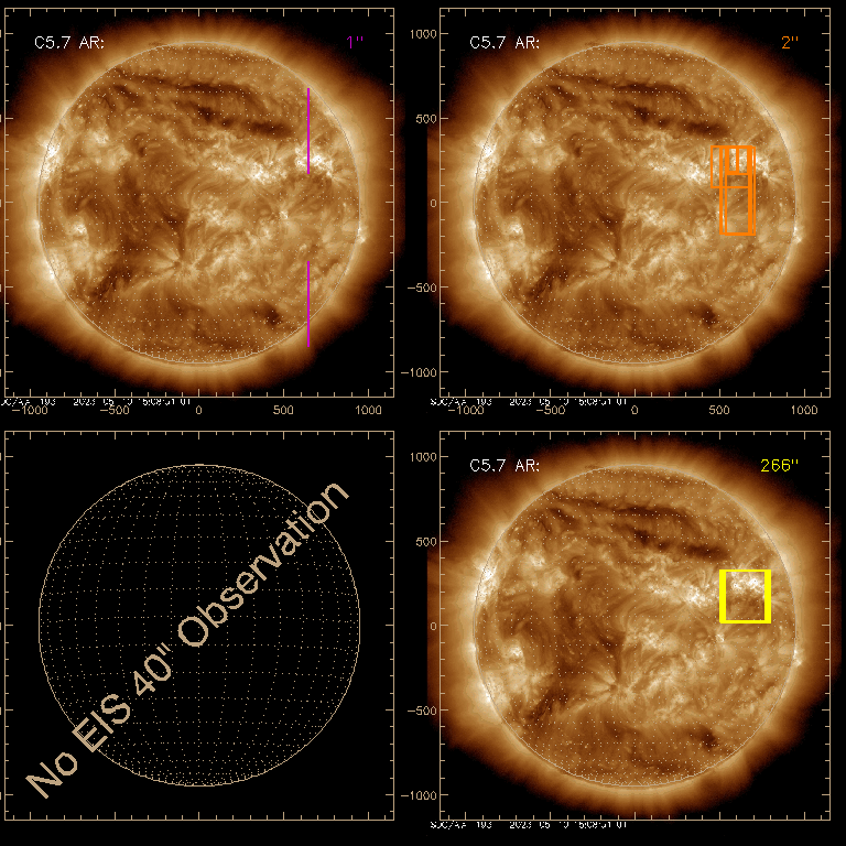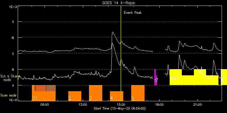 EIS Observation timeline overlay to GOES-Xray curve Code 1" 2" 40" 266" EIS Observations list for this event: STUDY ACRONYM ID DATE OBSERVED DESCRIPTION NOAA# TARGET 0 HH_AR+FLR_RAS_N03 | 86219 | 2023/05/10 08:00:21 | HOP 401 (with SST and IRIS - Dynamics | 3297 | Active Region TIMELINE ID DATE OBSERVED FITS FILE XCEN (+W/-E) YCEN (+N/-S) DUR ----------------------------------------------------------------------------------------------------------------- 86219 | 2023/05/10 08:00:21.000 | eis_l0_20230510_080021.fits.gz | 572.70 | 207.07 | 13m18s 1 HH_Flare_60x152f | 86220 | 2023/05/10 08:14:11 | HOP 401 (with SST and IRIS - Dynamics | | Flare TIMELINE ID DATE OBSERVED FITS FILE XCEN (+W/-E) YCEN (+N/-S) DUR ----------------------------------------------------------------------------------------------------------------- 86220 | 2023/05/10 08:14:11.000 | eis_l0_20230510_081411.fits.gz | 573.92 | 251.07 | 2m48s 86220 | 2023/05/10 08:17:02.000 | eis_l0_20230510_081702.fits.gz | 574.30 | 250.99 | 2m48s 86220 | 2023/05/10 08:19:53.000 | eis_l0_20230510_081953.fits.gz | 574.53 | 251.07 | 2m48s 86220 | 2023/05/10 08:22:44.000 | eis_l0_20230510_082244.fits.gz | 574.84 | 251.07 | 2m48s 86220 | 2023/05/10 08:25:35.000 | eis_l0_20230510_082535.fits.gz | 575.15 | 250.99 | 2m48s 86220 | 2023/05/10 08:28:26.000 | eis_l0_20230510_082826.fits.gz | 575.54 | 251.07 | 2m48s 86220 | 2023/05/10 08:31:17.000 | eis_l0_20230510_083117.fits.gz | 575.85 | 251.07 | 2m48s 86220 | 2023/05/10 08:34:07.000 | eis_l0_20230510_083407.fits.gz | 576.23 | 250.92 | 2m49s 86220 | 2023/05/10 08:36:59.000 | eis_l0_20230510_083659.fits.gz | 576.54 | 250.84 | 2m48s 86220 | 2023/05/10 08:39:50.000 | eis_l0_20230510_083950.fits.gz | 576.85 | 250.92 | 2m48s 86220 | 2023/05/10 08:42:40.000 | eis_l0_20230510_084240.fits.gz | 577.08 | 250.99 | 2m49s 86220 | 2023/05/10 08:45:32.000 | eis_l0_20230510_084532.fits.gz | 577.47 | 250.99 | 2m47s 86220 | 2023/05/10 08:48:22.000 | eis_l0_20230510_084822.fits.gz | 577.78 | 250.92 | 2m48s 86220 | 2023/05/10 08:51:12.000 | eis_l0_20230510_085112.fits.gz | 578.01 | 250.76 | 2m48s 86220 | 2023/05/10 08:54:03.000 | eis_l0_20230510_085403.fits.gz | 578.40 | 250.76 | 2m48s 86220 | 2023/05/10 08:56:54.000 | eis_l0_20230510_085654.fits.gz | 578.71 | 250.84 | 2m47s 86220 | 2023/05/10 08:59:44.000 | eis_l0_20230510_085944.fits.gz | 579.02 | 250.68 | 2m48s 86220 | 2023/05/10 09:02:35.000 | eis_l0_20230510_090235.fits.gz | 579.32 | 250.84 | 2m48s 86220 | 2023/05/10 09:05:26.000 | eis_l0_20230510_090526.fits.gz | 579.63 | 250.84 | 2m48s 86220 | 2023/05/10 09:08:17.000 | eis_l0_20230510_090817.fits.gz | 580.10 | 250.84 | 2m47s 86220 | 2023/05/10 09:11:07.000 | eis_l0_20230510_091107.fits.gz | 580.41 | 250.76 | 2m48s 86220 | 2023/05/10 09:13:58.000 | eis_l0_20230510_091358.fits.gz | 580.71 | 250.68 | 2m48s 86220 | 2023/05/10 09:16:48.000 | eis_l0_20230510_091648.fits.gz | 581.10 | 250.61 | 2m49s 86220 | 2023/05/10 09:19:39.000 | eis_l0_20230510_091939.fits.gz | 581.26 | 250.76 | 2m48s 86220 | 2023/05/10 09:22:30.000 | eis_l0_20230510_092230.fits.gz | 581.64 | 250.68 | 2m47s 86220 | 2023/05/10 09:25:20.000 | eis_l0_20230510_092520.fits.gz | 581.95 | 250.61 | 2m49s 86220 | 2023/05/10 09:28:11.000 | eis_l0_20230510_092811.fits.gz | 582.26 | 250.61 | 2m48s 86220 | 2023/05/10 09:31:02.000 | eis_l0_20230510_093102.fits.gz | 582.57 | 250.53 | 2m48s 86220 | 2023/05/10 09:33:53.000 | eis_l0_20230510_093353.fits.gz | 582.95 | 250.53 | 2m48s 86220 | 2023/05/10 09:36:43.000 | eis_l0_20230510_093643.fits.gz | 583.19 | 250.53 | 2m48s 86220 | 2023/05/10 09:39:34.000 | eis_l0_20230510_093934.fits.gz | 583.49 | 250.61 | 2m48s 86220 | 2023/05/10 09:42:25.000 | eis_l0_20230510_094225.fits.gz | 583.73 | 250.61 | 2m48s 86220 | 2023/05/10 09:45:16.000 | eis_l0_20230510_094516.fits.gz | 584.19 | 250.45 | 2m48s 86220 | 2023/05/10 09:48:07.000 | eis_l0_20230510_094807.fits.gz | 584.42 | 250.53 | 2m48s 2 HPW021VEL260x512v2 | 86226 | 2023/05/10 10:51:14 | Active Region Studies | 3294 | Active Region TIMELINE ID DATE OBSERVED FITS FILE XCEN (+W/-E) YCEN (+N/-S) DUR ----------------------------------------------------------------------------------------------------------------- 86226 | 2023/05/10 10:51:14.000 | eis_l0_20230510_105114.fits.gz | 591.78 | 70.14 | 1h0m44s 3 HPW021VEL260x512v2 | 86227 | 2023/05/10 12:29:14 | Active Region Studies | 3294 | Active Region TIMELINE ID DATE OBSERVED FITS FILE XCEN (+W/-E) YCEN (+N/-S) DUR ----------------------------------------------------------------------------------------------------------------- 86227 | 2023/05/10 12:29:14.000 | eis_l0_20230510_122914.fits.gz | 602.59 | 67.45 | 1h0m44s 4 Atlas_60 | 86228 | 2023/05/10 14:07:44 | Active Region Studies | | Quiet Sun TIMELINE ID DATE OBSERVED FITS FILE XCEN (+W/-E) YCEN (+N/-S) DUR ----------------------------------------------------------------------------------------------------------------- 86228 | 2023/05/10 14:07:44.000 | eis_l0_20230510_140744.fits.gz | 613.25 | 242.75 | 1h1m39s 5 HPW021VEL260x512v2 | 86229 | 2023/05/10 15:48:13 | Active Region Studies | 3294 | Active Region TIMELINE ID DATE OBSERVED FITS FILE XCEN (+W/-E) YCEN (+N/-S) DUR ----------------------------------------------------------------------------------------------------------------- 86229 | 2023/05/10 15:48:13.000 | eis_l0_20230510_154813.fits.gz | 624.24 | 65.98 | 1h0m45s 6 regcal081 | 86235 | 2023/05/10 17:37:11 | Dark exposures, CCD bottom rows (150s | | Engineering TIMELINE ID DATE OBSERVED FITS FILE XCEN (+W/-E) YCEN (+N/-S) DUR ----------------------------------------------------------------------------------------------------------------- 86235 | 2023/05/10 17:37:11.000 | eis_l0_20230510_173711.fits.gz | 649.99 | -602.79 | 5m2s 7 regcal082 | 86236 | 2023/05/10 17:42:40 | Dark exposures, top CCD rows (150s exp | | Engineering TIMELINE ID DATE OBSERVED FITS FILE XCEN (+W/-E) YCEN (+N/-S) DUR --------------------------------------------------------------------------------