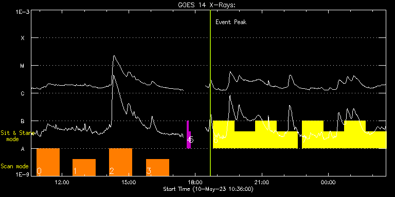 EIS Observation timeline overlay to GOES-Xray curve Code 1" 2" 40" 266" EIS Observations list for this event: STUDY ACRONYM ID DATE OBSERVED DESCRIPTION NOAA# TARGET 0 HPW021VEL260x512v2 | 86226 | 2023/05/10 10:51:14 | Active Region Studies | 3294 | Active Region TIMELINE ID DATE OBSERVED FITS FILE XCEN (+W/-E) YCEN (+N/-S) DUR ----------------------------------------------------------------------------------------------------------------- 86226 | 2023/05/10 10:51:14.000 | eis_l0_20230510_105114.fits.gz | 591.78 | 70.14 | 1h0m44s 1 HPW021VEL260x512v2 | 86227 | 2023/05/10 12:29:14 | Active Region Studies | 3294 | Active Region TIMELINE ID DATE OBSERVED FITS FILE XCEN (+W/-E) YCEN (+N/-S) DUR ----------------------------------------------------------------------------------------------------------------- 86227 | 2023/05/10 12:29:14.000 | eis_l0_20230510_122914.fits.gz | 602.59 | 67.45 | 1h0m44s 2 Atlas_60 | 86228 | 2023/05/10 14:07:44 | Active Region Studies | | Quiet Sun TIMELINE ID DATE OBSERVED FITS FILE XCEN (+W/-E) YCEN (+N/-S) DUR ----------------------------------------------------------------------------------------------------------------- 86228 | 2023/05/10 14:07:44.000 | eis_l0_20230510_140744.fits.gz | 613.25 | 242.75 | 1h1m39s 3 HPW021VEL260x512v2 | 86229 | 2023/05/10 15:48:13 | Active Region Studies | 3294 | Active Region TIMELINE ID DATE OBSERVED FITS FILE XCEN (+W/-E) YCEN (+N/-S) DUR ----------------------------------------------------------------------------------------------------------------- 86229 | 2023/05/10 15:48:13.000 | eis_l0_20230510_154813.fits.gz | 624.24 | 65.98 | 1h0m45s 4 regcal081 | 86235 | 2023/05/10 17:37:11 | Dark exposures, CCD bottom rows (150s | | Engineering TIMELINE ID DATE OBSERVED FITS FILE XCEN (+W/-E) YCEN (+N/-S) DUR ----------------------------------------------------------------------------------------------------------------- 86235 | 2023/05/10 17:37:11.000 | eis_l0_20230510_173711.fits.gz | 649.99 | -602.79 | 5m2s 5 regcal082 | 86236 | 2023/05/10 17:42:40 | Dark exposures, top CCD rows (150s exp | | Engineering TIMELINE ID DATE OBSERVED FITS FILE XCEN (+W/-E) YCEN (+N/-S) DUR ----------------------------------------------------------------------------------------------------------------- 86236 | 2023/05/10 17:42:40.000 | eis_l0_20230510_174240.fits.gz | 650.53 | 419.29 | 5m2s 6 Flare266_Hunter01 | 86239 | 2023/05/10 18:48:33 | Flare Hunter | 3296 | Flare TIMELINE ID DATE OBSERVED FITS FILE XCEN (+W/-E) YCEN (+N/-S) DUR ----------------------------------------------------------------------------------------------------------------- 86239 | 2023/05/10 18:48:33.000 | eis_l0_20230510_184833.fits.gz | 642.40 | 170.82 | 56m23s 86239 | 2023/05/10 19:45:48.000 | eis_l0_20230510_194548.fits.gz | 648.20 | 170.36 | 56m22s 86239 | 2023/05/10 20:43:02.000 | eis_l0_20230510_204302.fits.gz | 653.99 | 170.05 | 56m23s 86239 | 2023/05/10 21:40:17.000 | eis_l0_20230510_214017.fits.gz | 659.71 | 169.51 | 56m22s 7 Flare266_Hunter01 | 86240 | 2023/05/10 22:49:13 | Flare Hunter | 3296 | Flare TIMELINE ID DATE OBSERVED FITS FILE XCEN (+W/-E) YCEN (+N/-S) DUR ----------------------------------------------------------------------------------------------------------------- 86240 | 2023/05/10 22:49:13.000 | eis_l0_20230510_224913.fits.gz | 666.58 | 169.04 | 56m22s 86240 | 2023/05/10 23:46:28.000 | eis_l0_20230510_234628.fits.gz | 672.22 | 168.66 | 56m22s 86240 | 2023/05/11 00:43:42.000 | eis_l0_20230511_004342.fits.gz | 677.86 | 168.27 | 56m22s 86240 | 2023/05/11 01:40:57.000 | eis_l0_20230511_014057.fits.gz | 683.27 | 167.81 | 56m22s : Check study information : Download file : View thumbnails For this event, also check for: