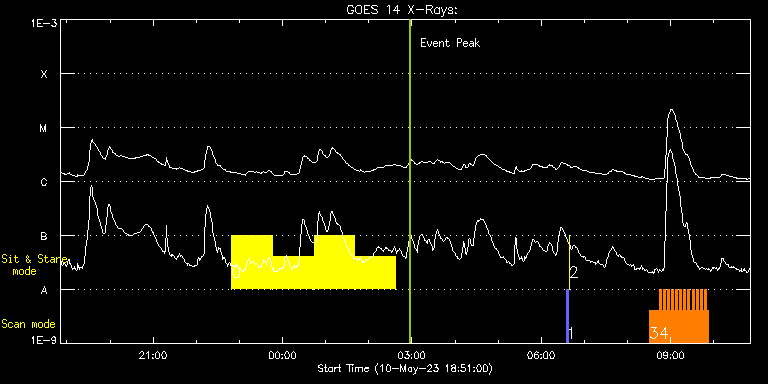 EIS Observation timeline overlay to GOES-Xray curve Code 1" 2" 40" 266" EIS Observations list for this event: STUDY ACRONYM ID DATE OBSERVED DESCRIPTION NOAA# TARGET 0 Flare266_Hunter01 | 86240 | 2023/05/10 22:49:13 | Flare Hunter | 3296 | Flare TIMELINE ID DATE OBSERVED FITS FILE XCEN (+W/-E) YCEN (+N/-S) DUR ----------------------------------------------------------------------------------------------------------------- 86240 | 2023/05/10 22:49:13.000 | eis_l0_20230510_224913.fits.gz | 666.58 | 169.04 | 56m22s 86240 | 2023/05/10 23:46:28.000 | eis_l0_20230510_234628.fits.gz | 672.22 | 168.66 | 56m22s 86240 | 2023/05/11 00:43:42.000 | eis_l0_20230511_004342.fits.gz | 677.86 | 168.27 | 56m22s 86240 | 2023/05/11 01:40:57.000 | eis_l0_20230511_014057.fits.gz | 683.27 | 167.81 | 56m22s 1 PRY_slot_contextLITE | 86212 | 2023/05/11 06:35:27 | Pointing Monitoring | | Active Region TIMELINE ID DATE OBSERVED FITS FILE XCEN (+W/-E) YCEN (+N/-S) DUR ----------------------------------------------------------------------------------------------------------------- 86212 | 2023/05/11 06:35:27.000 | eis_l0_20230511_063527.fits.gz | 0.68 | -194.92 | 2m56s 2 XRT_synop_AIA | 86213 | 2023/05/11 06:38:42 | Pointing Monitoring | | Quiet Sun TIMELINE ID DATE OBSERVED FITS FILE XCEN (+W/-E) YCEN (+N/-S) DUR ----------------------------------------------------------------------------------------------------------------- 86213 | 2023/05/11 06:38:42.000 | eis_l0_20230511_063842.fits.gz | 0.51 | -206.92 | 10s 3 HH_AR+FLR_RAS_N03 | 86221 | 2023/05/11 08:30:19 | HOP 401 (with SST and IRIS - Dynamics | 3296 | Active Region TIMELINE ID DATE OBSERVED FITS FILE XCEN (+W/-E) YCEN (+N/-S) DUR ----------------------------------------------------------------------------------------------------------------- 86221 | 2023/05/11 08:30:19.000 | eis_l0_20230511_083019.fits.gz | 722.07 | 192.72 | 13m19s 4 HH_Flare_60x152f | 86222 | 2023/05/11 08:44:09 | HOP 401 (with SST and IRIS - Dynamics | | Flare TIMELINE ID DATE OBSERVED FITS FILE XCEN (+W/-E) YCEN (+N/-S) DUR ----------------------------------------------------------------------------------------------------------------- 86222 | 2023/05/11 08:44:09.000 | eis_l0_20230511_084409.fits.gz | 723.06 | 236.64 | 2m49s 86222 | 2023/05/11 08:47:00.000 | eis_l0_20230511_084700.fits.gz | 723.29 | 236.64 | 2m48s 86222 | 2023/05/11 08:49:51.000 | eis_l0_20230511_084951.fits.gz | 723.52 | 236.64 | 2m48s 86222 | 2023/05/11 08:52:42.000 | eis_l0_20230511_085242.fits.gz | 723.83 | 236.64 | 2m48s 86222 | 2023/05/11 08:55:32.000 | eis_l0_20230511_085532.fits.gz | 724.06 | 236.49 | 2m48s 86222 | 2023/05/11 08:58:23.000 | eis_l0_20230511_085823.fits.gz | 724.29 | 236.41 | 2m49s 86222 | 2023/05/11 09:01:14.000 | eis_l0_20230511_090114.fits.gz | 724.53 | 236.49 | 2m48s 86222 | 2023/05/11 09:04:05.000 | eis_l0_20230511_090405.fits.gz | 724.76 | 236.56 | 2m48s 86222 | 2023/05/11 09:06:56.000 | eis_l0_20230511_090656.fits.gz | 725.07 | 236.49 | 2m48s 86222 | 2023/05/11 09:09:46.000 | eis_l0_20230511_090946.fits.gz | 725.30 | 236.41 | 2m48s 86222 | 2023/05/11 09:12:37.000 | eis_l0_20230511_091237.fits.gz | 725.53 | 236.41 | 2m49s 86222 | 2023/05/11 09:15:28.000 | eis_l0_20230511_091528.fits.gz | 725.76 | 236.41 | 2m48s 86222 | 2023/05/11 09:18:19.000 | eis_l0_20230511_091819.fits.gz | 725.99 | 236.49 | 2m47s 86222 | 2023/05/11 09:21:09.000 | eis_l0_20230511_092109.fits.gz | 726.22 | 236.41 | 2m48s 86222 | 2023/05/11 09:24:00.000 | eis_l0_20230511_092400.fits.gz | 726.61 | 236.26 | 2m48s 86222 | 2023/05/11 09:26:51.000 | eis_l0_20230511_092651.fits.gz | 726.69 | 236.41 | 2m47s 86222 | 2023/05/11 09:29:41.000 | eis_l0_20230511_092941.fits.gz | 727.00 | 236.33 | 2m48s 86222 | 2023/05/11 09:32:32.000 | eis_l0_20230511_093232.fits.gz | 727.15 | 236.33 | 2m48s 86222 | 2023/05/11 09:35:23.000 | eis_l0_20230511_093523.fits.gz | 727.46 | 236.26 | 2m48s 86222 | 2023/05/11 09:38:14.000 | eis_l0_20230511_093814.fits.gz | 727.61 | 236.33 | 2m48s 86222 | 2023/05/11 09:41:04.000 | eis_l0_20230511_094104.fits.gz | 727.92 | 236.33 | 2m48s 86222 | 2023/05/11 09:43:55.000 | eis_l0_20230511_094355.fits.gz | 728.23 | 236.41 | 2m48s 86222 | 2023/05/11 09:46:46.000 | eis_l0_20230511_094646.fits.gz | 728.47 | 236.33 | 2m48s 86222 | 2023/05/11 09:49:37.000 | eis_l0_20230511_094937.fits.gz | 728.77 | 236.18 | 2m47s : Check study information : Download file : View thumbnails For this event, also check for: