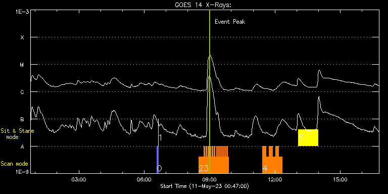 EIS Observation timeline overlay to GOES-Xray curve Code 1" 2" 40" 266" EIS Observations list for this event: STUDY ACRONYM ID DATE OBSERVED DESCRIPTION NOAA# TARGET 0 PRY_slot_contextLITE | 86212 | 2023/05/11 06:35:27 | Pointing Monitoring | | Active Region TIMELINE ID DATE OBSERVED FITS FILE XCEN (+W/-E) YCEN (+N/-S) DUR ----------------------------------------------------------------------------------------------------------------- 86212 | 2023/05/11 06:35:27.000 | eis_l0_20230511_063527.fits.gz | 0.68 | -194.92 | 2m56s 1 XRT_synop_AIA | 86213 | 2023/05/11 06:38:42 | Pointing Monitoring | | Quiet Sun TIMELINE ID DATE OBSERVED FITS FILE XCEN (+W/-E) YCEN (+N/-S) DUR ----------------------------------------------------------------------------------------------------------------- 86213 | 2023/05/11 06:38:42.000 | eis_l0_20230511_063842.fits.gz | 0.51 | -206.92 | 10s 2 HH_AR+FLR_RAS_N03 | 86221 | 2023/05/11 08:30:19 | HOP 401 (with SST and IRIS - Dynamics | 3296 | Active Region TIMELINE ID DATE OBSERVED FITS FILE XCEN (+W/-E) YCEN (+N/-S) DUR ----------------------------------------------------------------------------------------------------------------- 86221 | 2023/05/11 08:30:19.000 | eis_l0_20230511_083019.fits.gz | 722.07 | 192.72 | 13m19s 3 HH_Flare_60x152f | 86222 | 2023/05/11 08:44:09 | HOP 401 (with SST and IRIS - Dynamics | | Flare TIMELINE ID DATE OBSERVED FITS FILE XCEN (+W/-E) YCEN (+N/-S) DUR ----------------------------------------------------------------------------------------------------------------- 86222 | 2023/05/11 08:44:09.000 | eis_l0_20230511_084409.fits.gz | 723.06 | 236.64 | 2m49s 86222 | 2023/05/11 08:47:00.000 | eis_l0_20230511_084700.fits.gz | 723.29 | 236.64 | 2m48s 86222 | 2023/05/11 08:49:51.000 | eis_l0_20230511_084951.fits.gz | 723.52 | 236.64 | 2m48s 86222 | 2023/05/11 08:52:42.000 | eis_l0_20230511_085242.fits.gz | 723.83 | 236.64 | 2m48s 86222 | 2023/05/11 08:55:32.000 | eis_l0_20230511_085532.fits.gz | 724.06 | 236.49 | 2m48s 86222 | 2023/05/11 08:58:23.000 | eis_l0_20230511_085823.fits.gz | 724.29 | 236.41 | 2m49s 86222 | 2023/05/11 09:01:14.000 | eis_l0_20230511_090114.fits.gz | 724.53 | 236.49 | 2m48s 86222 | 2023/05/11 09:04:05.000 | eis_l0_20230511_090405.fits.gz | 724.76 | 236.56 | 2m48s 86222 | 2023/05/11 09:06:56.000 | eis_l0_20230511_090656.fits.gz | 725.07 | 236.49 | 2m48s 86222 | 2023/05/11 09:09:46.000 | eis_l0_20230511_090946.fits.gz | 725.30 | 236.41 | 2m48s 86222 | 2023/05/11 09:12:37.000 | eis_l0_20230511_091237.fits.gz | 725.53 | 236.41 | 2m49s 86222 | 2023/05/11 09:15:28.000 | eis_l0_20230511_091528.fits.gz | 725.76 | 236.41 | 2m48s 86222 | 2023/05/11 09:18:19.000 | eis_l0_20230511_091819.fits.gz | 725.99 | 236.49 | 2m47s 86222 | 2023/05/11 09:21:09.000 | eis_l0_20230511_092109.fits.gz | 726.22 | 236.41 | 2m48s 86222 | 2023/05/11 09:24:00.000 | eis_l0_20230511_092400.fits.gz | 726.61 | 236.26 | 2m48s 86222 | 2023/05/11 09:26:51.000 | eis_l0_20230511_092651.fits.gz | 726.69 | 236.41 | 2m47s 86222 | 2023/05/11 09:29:41.000 | eis_l0_20230511_092941.fits.gz | 727.00 | 236.33 | 2m48s 86222 | 2023/05/11 09:32:32.000 | eis_l0_20230511_093232.fits.gz | 727.15 | 236.33 | 2m48s 86222 | 2023/05/11 09:35:23.000 | eis_l0_20230511_093523.fits.gz | 727.46 | 236.26 | 2m48s 86222 | 2023/05/11 09:38:14.000 | eis_l0_20230511_093814.fits.gz | 727.61 | 236.33 | 2m48s 86222 | 2023/05/11 09:41:04.000 | eis_l0_20230511_094104.fits.gz | 727.92 | 236.33 | 2m48s 86222 | 2023/05/11 09:43:55.000 | eis_l0_20230511_094355.fits.gz | 728.23 | 236.41 | 2m48s 86222 | 2023/05/11 09:46:46.000 | eis_l0_20230511_094646.fits.gz | 728.47 | 236.33 | 2m48s 86222 | 2023/05/11 09:49:37.000 | eis_l0_20230511_094937.fits.gz | 728.77 | 236.18 | 2m47s 4 FlareResponse01 | 86259 | 2023/05/11 11:26:15 | Major Flare Watch | 3296 | Flare TIMELINE ID DATE OBSERVED FITS FILE XCEN (+W/-E) YCEN (+N/-S) DUR ----------------------------------------------------------------------------------------------------------------- 86259 | 2023/05/11 11:26:15.000 | eis_l0_20230511_112615.fits.gz | 741.85 | 167.59 | 8m52s 86259 | 2023/05/11 11:35:10.000 | eis_l0_20230511_113510.fits.gz | 742.54 | 167.52 | 8m52s 86259 | 2023/05/11 11:44:05.000 | eis_l0_20230511_114405.fits.gz | 743.31 | 167.29 | 8m52s 86259 | 2023/05/11 11:53:00.000 | eis_l0_20230511_115300.fits.gz | 744.09 | 167.36 | 8m52s 86259 | 2023/05/11 12:01:55.000 | eis_l0_20230511_120155.fits.gz | 744.78 | 167.21 | 8m52s 86259 | 2023/05/11 12:10:51.000 | eis_l0_20230511_121051.fits.gz | 745.48 | 167.21 | 8m51s 5 Flare266_Hunter01 | 86256 | 2023/05/11 13:05:04 | Major Flare Watch (XRT flare trigger) | 3296 | Flare TIMELINE ID DATE OBSERVED FITS FILE XCEN (+W/-E) YCEN (+N/-S) DUR ----------------------------------------------------------------------------------------------------------------- 86256 | 2023/05/11 13:05:04.000 | eis_l0_20230511_130504.fits.gz | 749.70 | 166.82 | 52m59s : Check study information : Download file : View thumbnails For this event, also check for: