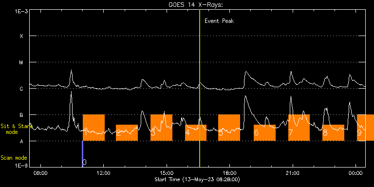 EIS Observation timeline overlay to GOES-Xray curve Code 1" 2" 40" 266" EIS Observations list for this event: STUDY ACRONYM ID DATE OBSERVED DESCRIPTION NOAA# TARGET 0 PRY_slot_contextLITE | 86289 | 2023/05/13 10:58:20 | Context images for flare sit-and-stare | 3294 | Active Region TIMELINE ID DATE OBSERVED FITS FILE XCEN (+W/-E) YCEN (+N/-S) DUR ----------------------------------------------------------------------------------------------------------------- 86289 | 2023/05/13 10:58:20.000 | eis_l0_20230513_105820.fits.gz | 887.05 | 66.93 | 2m57s 1 Flare_SNS_v2 | 86290 | 2023/05/13 11:01:42 | Sit-and-stare off limb flare observati | | Flare TIMELINE ID DATE OBSERVED FITS FILE XCEN (+W/-E) YCEN (+N/-S) DUR ----------------------------------------------------------------------------------------------------------------- 86290 | 2023/05/13 11:01:42.000 | eis_l0_20230513_110142.fits.gz | 981.41 | 334.92 | 1h0m20s 2 Flare_SNS_v2 | 86291 | 2023/05/13 12:36:14 | Sit-and-stare off limb flare observati | | Flare TIMELINE ID DATE OBSERVED FITS FILE XCEN (+W/-E) YCEN (+N/-S) DUR ----------------------------------------------------------------------------------------------------------------- 86291 | 2023/05/13 12:36:14.000 | eis_l0_20230513_123614.fits.gz | 981.66 | 334.92 | 1h0m20s 3 Flare_SNS_v2 | 86292 | 2023/05/13 14:14:44 | Sit-and-stare off limb flare observati | | Flare TIMELINE ID DATE OBSERVED FITS FILE XCEN (+W/-E) YCEN (+N/-S) DUR ----------------------------------------------------------------------------------------------------------------- 86292 | 2023/05/13 14:14:44.000 | eis_l0_20230513_141444.fits.gz | 981.66 | 335.00 | 1h0m20s 4 Flare_SNS_v2 | 86293 | 2023/05/13 15:53:14 | Sit-and-stare off limb flare observati | | Flare TIMELINE ID DATE OBSERVED FITS FILE XCEN (+W/-E) YCEN (+N/-S) DUR ----------------------------------------------------------------------------------------------------------------- 86293 | 2023/05/13 15:53:14.000 | eis_l0_20230513_155314.fits.gz | 981.66 | 335.00 | 1h0m20s 5 Flare_SNS_v2 | 86294 | 2023/05/13 17:28:14 | Sit-and-stare off limb flare observati | | Flare TIMELINE ID DATE OBSERVED FITS FILE XCEN (+W/-E) YCEN (+N/-S) DUR ----------------------------------------------------------------------------------------------------------------- 86294 | 2023/05/13 17:28:14.000 | eis_l0_20230513_172814.fits.gz | 981.58 | 335.08 | 1h0m20s 6 Flare_SNS_v2 | 86295 | 2023/05/13 19:09:44 | Sit-and-stare off limb flare observati | | Flare TIMELINE ID DATE OBSERVED FITS FILE XCEN (+W/-E) YCEN (+N/-S) DUR ----------------------------------------------------------------------------------------------------------------- 86295 | 2023/05/13 19:09:44.000 | eis_l0_20230513_190944.fits.gz | 981.66 | 335.00 | 1h0m20s 7 Flare_SNS_v2 | 86296 | 2023/05/13 20:48:14 | Sit-and-stare off limb flare observati | | Flare TIMELINE ID DATE OBSERVED FITS FILE XCEN (+W/-E) YCEN (+N/-S) DUR ----------------------------------------------------------------------------------------------------------------- 86296 | 2023/05/13 20:48:14.000 | eis_l0_20230513_204814.fits.gz | 981.66 | 335.00 | 1h0m20s 8 Flare_SNS_v2 | 86297 | 2023/05/13 22:26:14 | Sit-and-stare off limb flare observati | | Flare TIMELINE ID DATE OBSERVED FITS FILE XCEN (+W/-E) YCEN (+N/-S) DUR ----------------------------------------------------------------------------------------------------------------- 86297 | 2023/05/13 22:26:14.000 | eis_l0_20230513_222614.fits.gz | 981.66 | 335.00 | 1h0m20s 9 Flare_SNS_v2 | 86298 | 2023/05/14 00:04:44 | Sit-and-stare off limb flare observati | | Flare TIMELINE ID DATE OBSERVED FITS FILE XCEN (+W/-E) YCEN (+N/-S) DUR ----------------------------------------------------------------------------------------------------------------- 86298 | 2023/05/14 00:04:44.000 | eis_l0_20230514_000444.fits.gz | 981.66 | 335.00 | 1h0m20s : Check study information : Download file : View thumbnails For this event, also check for: