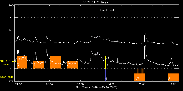 EIS Observation timeline overlay to GOES-Xray curve Code 1" 2" 40" 266" EIS Observations list for this event: STUDY ACRONYM ID DATE OBSERVED DESCRIPTION NOAA# TARGET 0 Flare_SNS_v2 | 86296 | 2023/05/13 20:48:14 | Sit-and-stare off limb flare observati | | Flare TIMELINE ID DATE OBSERVED FITS FILE XCEN (+W/-E) YCEN (+N/-S) DUR ----------------------------------------------------------------------------------------------------------------- 86296 | 2023/05/13 20:48:14.000 | eis_l0_20230513_204814.fits.gz | 981.66 | 335.00 | 1h0m20s 1 Flare_SNS_v2 | 86297 | 2023/05/13 22:26:14 | Sit-and-stare off limb flare observati | | Flare TIMELINE ID DATE OBSERVED FITS FILE XCEN (+W/-E) YCEN (+N/-S) DUR ----------------------------------------------------------------------------------------------------------------- 86297 | 2023/05/13 22:26:14.000 | eis_l0_20230513_222614.fits.gz | 981.66 | 335.00 | 1h0m20s 2 Flare_SNS_v2 | 86298 | 2023/05/14 00:04:44 | Sit-and-stare off limb flare observati | | Flare TIMELINE ID DATE OBSERVED FITS FILE XCEN (+W/-E) YCEN (+N/-S) DUR ----------------------------------------------------------------------------------------------------------------- 86298 | 2023/05/14 00:04:44.000 | eis_l0_20230514_000444.fits.gz | 981.66 | 335.00 | 1h0m20s 3 Flare_SNS_v2 | 86299 | 2023/05/14 01:43:14 | Sit-and-stare off limb flare observati | | Flare TIMELINE ID DATE OBSERVED FITS FILE XCEN (+W/-E) YCEN (+N/-S) DUR ----------------------------------------------------------------------------------------------------------------- 86299 | 2023/05/14 01:43:14.000 | eis_l0_20230514_014314.fits.gz | 981.66 | 334.92 | 1h0m20s 4 PRY_slot_contextLITE | 86268 | 2023/05/14 05:23:50 | Pointing Monitoring | | Active Region TIMELINE ID DATE OBSERVED FITS FILE XCEN (+W/-E) YCEN (+N/-S) DUR ----------------------------------------------------------------------------------------------------------------- 86268 | 2023/05/14 05:23:50.000 | eis_l0_20230514_052350.fits.gz | 0.76 | -195.08 | 2m56s 5 XRT_synop_AIA | 86269 | 2023/05/14 05:27:05 | Pointing Monitoring | | Quiet Sun TIMELINE ID DATE OBSERVED FITS FILE XCEN (+W/-E) YCEN (+N/-S) DUR ----------------------------------------------------------------------------------------------------------------- 86269 | 2023/05/14 05:27:05.000 | eis_l0_20230514_052705.fits.gz | 0.36 | -206.92 | 10s 6 HH_AR+FLR_RAS_N03 | 86281 | 2023/05/14 08:16:21 | HOP 401 (with SST and IRIS - Dynamics | | Active Region TIMELINE ID DATE OBSERVED FITS FILE XCEN (+W/-E) YCEN (+N/-S) DUR ----------------------------------------------------------------------------------------------------------------- 86281 | 2023/05/14 08:16:21.000 | eis_l0_20230514_081621.fits.gz | -342.54 | 258.26 | 13m18s 7 HH_Flare_60x152f | 86282 | 2023/05/14 08:30:11 | HOP 401 (with SST and IRIS - Dynamics | | Flare TIMELINE ID DATE OBSERVED FITS FILE XCEN (+W/-E) YCEN (+N/-S) DUR ----------------------------------------------------------------------------------------------------------------- 86282 | 2023/05/14 08:30:11.000 | eis_l0_20230514_083011.fits.gz | -340.69 | 302.18 | 2m48s 86282 | 2023/05/14 08:33:02.000 | eis_l0_20230514_083302.fits.gz | -340.38 | 302.26 | 2m48s 86282 | 2023/05/14 08:35:53.000 | eis_l0_20230514_083553.fits.gz | -339.99 | 302.26 | 2m48s 86282 | 2023/05/14 08:38:44.000 | eis_l0_20230514_083844.fits.gz | -339.61 | 302.26 | 2m48s 86282 | 2023/05/14 08:41:35.000 | eis_l0_20230514_084135.fits.gz | -339.22 | 302.34 | 2m48s 86282 | 2023/05/14 08:44:25.000 | eis_l0_20230514_084425.fits.gz | -338.91 | 302.26 | 2m48s 86282 | 2023/05/14 08:47:16.000 | eis_l0_20230514_084716.fits.gz | -338.45 | 302.26 | 2m47s 86282 | 2023/05/14 08:50:06.000 | eis_l0_20230514_085006.fits.gz | -338.14 | 302.34 | 2m48s 86282 | 2023/05/14 08:52:57.000 | eis_l0_20230514_085257.fits.gz | -337.75 | 302.34 | 2m48s 86282 | 2023/05/14 08:55:47.000 | eis_l0_20230514_085547.fits.gz | -337.21 | 302.18 | 2m48s 86282 | 2023/05/14 08:58:38.000 | eis_l0_20230514_085838.fits.gz | -336.90 | 302.26 | 2m48s 86282 | 2023/05/14 09:01:29.000 | eis_l0_20230514_090129.fits.gz | -336.52 | 302.26 | 2m47s 86282 | 2023/05/14 09:04:19.000 | eis_l0_20230514_090419.fits.gz | -336.21 | 302.26 | 2m48s 86282 | 2023/05/14 09:07:10.000 | eis_l0_20230514_090710.fits.gz | -335.82 | 302.34 | 2m48s 86282 | 2023/05/14 09:10:01.000 | eis_l0_20230514_091001.fits.gz | -335.36 | 302.26 | 2m48s 86282 | 2023/05/14 09:12:52.000 | eis_l0_20230514_091252.fits.gz | -334.90 | 302.34 | 2m48s 86282 | 2023/05/14 09:15:43.000 | eis_l0_20230514_091543.fits.gz | -334.59 | 302.26 | 2m48s 8 HPW021VEL260x512v2 | 86300 | 2023/05/14 11:33:14 | Active region studies - diagnostic ras | | Active Region TIMELINE ID DATE OBSERVED FITS FILE XCEN (+W/-E) YCEN (+N/-S) DUR ----------------------------------------------------------------------------------------------------------------- 86300 | 2023/05/14 11:33:14.000 | eis_l0_20230514_113314.fits.gz | -318.72 | 132.57 | 1h0m44s : Check study information : Download file : View thumbnails For this event, also check for: