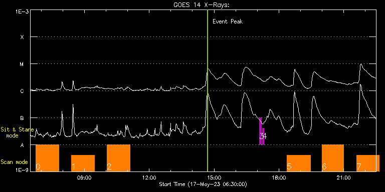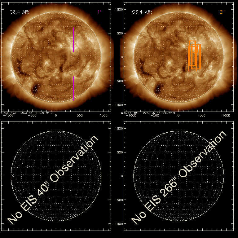 EIS Observation timeline overlay to GOES-Xray curve Code 1" 2" 40" 266" EIS Observations list for this event: STUDY ACRONYM ID DATE OBSERVED DESCRIPTION NOAA# TARGET 0 DHB_007_v2 | 86314 | 2023/05/17 06:44:50 | AR filaments form along the magnetic n | 3308 | Active Region TIMELINE ID DATE OBSERVED FITS FILE XCEN (+W/-E) YCEN (+N/-S) DUR ----------------------------------------------------------------------------------------------------------------- 86314 | 2023/05/17 06:44:50.000 | eis_l0_20230517_064450.fits.gz | 283.06 | 75.65 | 1h3m57s 1 DHB_007_v2 | 86315 | 2023/05/17 08:23:41 | AR filaments form along the magnetic n | 3308 | Active Region TIMELINE ID DATE OBSERVED FITS FILE XCEN (+W/-E) YCEN (+N/-S) DUR ----------------------------------------------------------------------------------------------------------------- 86315 | 2023/05/17 08:23:41.000 | eis_l0_20230517_082341.fits.gz | 296.73 | 75.27 | 1h3m57s 2 DHB_007_v3 | 86318 | 2023/05/17 10:02:11 | Very large FOV scan of both AR 13302 a | | Active Region TIMELINE ID DATE OBSERVED FITS FILE XCEN (+W/-E) YCEN (+N/-S) DUR ----------------------------------------------------------------------------------------------------------------- 86318 | 2023/05/17 10:02:11.000 | eis_l0_20230517_100211.fits.gz | 292.53 | -39.04 | 1h4m50s 3 regcal081 | 86307 | 2023/05/17 17:05:41 | Dark exposures, CCD bottom rows (150s | | Engineering TIMELINE ID DATE OBSERVED FITS FILE XCEN (+W/-E) YCEN (+N/-S) DUR ----------------------------------------------------------------------------------------------------------------- 86307 | 2023/05/17 17:05:41.000 | eis_l0_20230517_170541.fits.gz | 366.49 | -665.83 | 5m2s 4 regcal082 | 86308 | 2023/05/17 17:13:41 | Dark exposures, top CCD rows (150s exp | | Engineering TIMELINE ID DATE OBSERVED FITS FILE XCEN (+W/-E) YCEN (+N/-S) DUR ----------------------------------------------------------------------------------------------------------------- 86308 | 2023/05/17 17:13:41.000 | eis_l0_20230517_171341.fits.gz | 367.57 | 356.10 | 5m2s 5 DHB_007_v3 | 86322 | 2023/05/17 18:22:13 | Very large FOV scan of both AR 13305. | 3305 | Active Region TIMELINE ID DATE OBSERVED FITS FILE XCEN (+W/-E) YCEN (+N/-S) DUR ----------------------------------------------------------------------------------------------------------------- 86322 | 2023/05/17 18:22:13.000 | eis_l0_20230517_182213.fits.gz | 354.19 | -2.14 | 1h4m52s 6 HPW021VEL260x512v2 | 86323 | 2023/05/17 19:59:13 | Active region studies - diagnostic ras | 3305 | Active Region TIMELINE ID DATE OBSERVED FITS FILE XCEN (+W/-E) YCEN (+N/-S) DUR ----------------------------------------------------------------------------------------------------------------- 86323 | 2023/05/17 19:59:13.000 | eis_l0_20230517_195913.fits.gz | 375.05 | 1.40 | 1h0m44s 7 Atlas_60 | 86324 | 2023/05/17 21:36:13 | Active region studies - spectral atlas | | Quiet Sun TIMELINE ID DATE OBSERVED FITS FILE XCEN (+W/-E) YCEN (+N/-S) DUR ----------------------------------------------------------------------------------------------------------------- 86324 | 2023/05/17 21:36:13.000 | eis_l0_20230517_213613.fits.gz | 335.01 | 175.09 | 1h1m39s : Check study information : Download file : View thumbnails For this event, also check for: