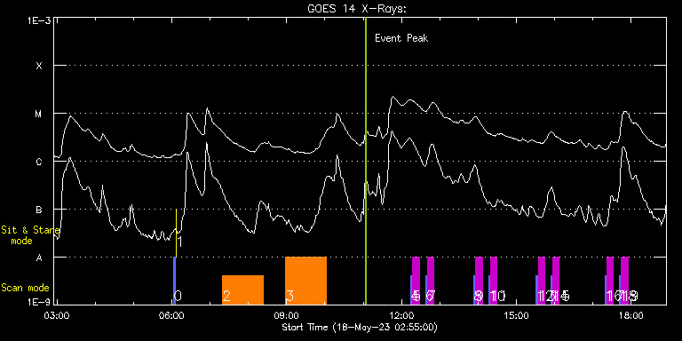 EIS Observation timeline overlay to GOES-Xray curve Code 1" 2" 40" 266" EIS Observations list for this event: STUDY ACRONYM ID DATE OBSERVED DESCRIPTION NOAA# TARGET 0 PRY_slot_contextLITE | 86310 | 2023/05/18 06:03:12 | Pointing Monitoring | 3307 | Active Region TIMELINE ID DATE OBSERVED FITS FILE XCEN (+W/-E) YCEN (+N/-S) DUR ----------------------------------------------------------------------------------------------------------------- 86310 | 2023/05/18 06:03:12.000 | eis_l0_20230518_060312.fits.gz | 0.68 | -195.00 | 2m57s 1 XRT_synop_AIA | 86311 | 2023/05/18 06:06:27 | Pointing Monitoring | | Quiet Sun TIMELINE ID DATE OBSERVED FITS FILE XCEN (+W/-E) YCEN (+N/-S) DUR ----------------------------------------------------------------------------------------------------------------- 86311 | 2023/05/18 06:06:27.000 | eis_l0_20230518_060627.fits.gz | 0.43 | -206.92 | 10s 2 DHB_007_v2 | 86316 | 2023/05/18 07:19:50 | AR filaments form along the magnetic n | 3308 | Active Region TIMELINE ID DATE OBSERVED FITS FILE XCEN (+W/-E) YCEN (+N/-S) DUR ----------------------------------------------------------------------------------------------------------------- 86316 | 2023/05/18 07:19:50.000 | eis_l0_20230518_071950.fits.gz | 477.57 | 69.70 | 1h3m56s 3 DHB_007_v2 | 86317 | 2023/05/18 08:58:13 | AR filaments form along the magnetic n | 3308 | Active Region TIMELINE ID DATE OBSERVED FITS FILE XCEN (+W/-E) YCEN (+N/-S) DUR ----------------------------------------------------------------------------------------------------------------- 86317 | 2023/05/18 08:58:13.000 | eis_l0_20230518_085813.fits.gz | 489.62 | 69.24 | 1h3m57s 4 PRY_slot_contextLITE | 86334 | 2023/05/18 12:14:21 | Synoptic SOT latitudinal scan. | | Active Region TIMELINE ID DATE OBSERVED FITS FILE XCEN (+W/-E) YCEN (+N/-S) DUR ----------------------------------------------------------------------------------------------------------------- 86334 | 2023/05/18 12:14:21.000 | eis_l0_20230518_121421.fits.gz | -9868.96 | -10103.70 | 2m56s 5 SK_DEEP_5x512_SLIT1 | 86335 | 2023/05/18 12:17:28 | Synoptic SOT latitudinal scan. | | Quiet Sun TIMELINE ID DATE OBSERVED FITS FILE XCEN (+W/-E) YCEN (+N/-S) DUR ----------------------------------------------------------------------------------------------------------------- 86335 | 2023/05/18 12:17:28.000 | eis_l0_20230518_121728.fits.gz | -9869.46 | -10115.70 | 10m8s 6 PRY_slot_contextLITE | 86336 | 2023/05/18 12:37:35 | Synoptic SOT latitudinal scan. | | Active Region TIMELINE ID DATE OBSERVED FITS FILE XCEN (+W/-E) YCEN (+N/-S) DUR ----------------------------------------------------------------------------------------------------------------- 86336 | 2023/05/18 12:37:35.000 | eis_l0_20230518_123735.fits.gz | -17.49 | -1043.10 | 2m56s 7 SK_DEEP_5x512_SLIT1 | 86337 | 2023/05/18 12:40:43 | Synoptic SOT latitudinal scan. | | Quiet Sun TIMELINE ID DATE OBSERVED FITS FILE XCEN (+W/-E) YCEN (+N/-S) DUR ----------------------------------------------------------------------------------------------------------------- 86337 | 2023/05/18 12:40:43.000 | eis_l0_20230518_124043.fits.gz | -17.99 | -1055.02 | 10m7s 8 PRY_slot_contextLITE | 86338 | 2023/05/18 13:53:04 | Synoptic SOT latitudinal scan. | | Active Region TIMELINE ID DATE OBSERVED FITS FILE XCEN (+W/-E) YCEN (+N/-S) DUR ----------------------------------------------------------------------------------------------------------------- 86338 | 2023/05/18 13:53:04.000 | eis_l0_20230518_135304.fits.gz | -17.49 | -942.91 | 2m57s 9 SK_DEEP_5x512_SLIT1 | 86339 | 2023/05/18 13:56:12 | Synoptic SOT latitudinal scan. | | Quiet Sun TIMELINE ID DATE OBSERVED FITS FILE XCEN (+W/-E) YCEN (+N/-S) DUR ----------------------------------------------------------------------------------------------------------------- 86339 | 2023/05/18 13:56:12.000 | eis_l0_20230518_135612.fits.gz | -18.06 | -954.98 | 10m8s 10 PRY_slot_contextLITE | 86340 | 2023/05/18 14:16:04 | Synoptic SOT latitudinal scan. | | Active Region TIMELINE ID DATE OBSERVED FITS FILE XCEN (+W/-E) YCEN (+N/-S) DUR ----------------------------------------------------------------------------------------------------------------- 86340 | 2023/05/18 14:16:04.000 | eis_l0_20230518_141604.fits.gz | -17.56 | -842.87 | 2m56s 11 SK_DEEP_5x512_SLIT1 | 86341 | 2023/05/18 14:19:12 | Synoptic SOT latitudinal scan. | | Quiet Sun TIMELINE ID DATE OBSERVED FITS FILE XCEN (+W/-E) YCEN (+N/-S) DUR ----------------------------------------------------------------------------------------------------------------- 86341 | 2023/05/18 14:19:12.000 | eis_l0_20230518_141912.fits.gz | -17.99 | -854.87 | 10m8s 12 PRY_slot_contextLITE | 86342 | 2023/05/18 15:31:04 | Synoptic SOT latitudinal scan. | | Active Region TIMELINE ID DATE OBSERVED FITS FILE XCEN (+W/-E) YCEN (+N/-S) DUR ----------------------------------------------------------------------------------------------------------------- 86342 | 2023/05/18 15:31:04.000 | eis_l0_20230518_153104.fits.gz | -17.49 | -742.76 | 2m56s 13 SK_DEEP_5x512_SLIT1 | 86343 | 2023/05/18 15:34:12 | Synoptic SOT latitudinal scan. | | Quiet Sun TIMELINE ID DATE OBSERVED FITS FILE XCEN (+W/-E) YCEN (+N/-S) DUR ----------------------------------------------------------------------------------------------------------------- 86343 | 2023/05/18 15:34:12.000 | eis_l0_20230518_153412.fits.gz | -17.99 | -754.91 | 10m7s 14 PRY_slot_contextLITE | 86344 | 2023/05/18 15:54:04 | Synoptic SOT latitudinal scan. | | Active Region TIMELINE ID DATE OBSERVED FITS FILE XCEN (+W/-E) YCEN (+N/-S) DUR ----------------------------------------------------------------------------------------------------------------- 86344 | 2023/05/18 15:54:04.000 | eis_l0_20230518_155404.fits.gz | -17.49 | -642.72 | 2m56s 15 SK_DEEP_5x512_SLIT1 | 86345 | 2023/05/18 15:57:12 | Synoptic SOT latitudinal scan. | | Quiet Sun TIMELINE ID DATE OBSERVED FITS FILE XCEN (+W/-E) YCEN (+N/-S) DUR ------------------------------------------------------------------