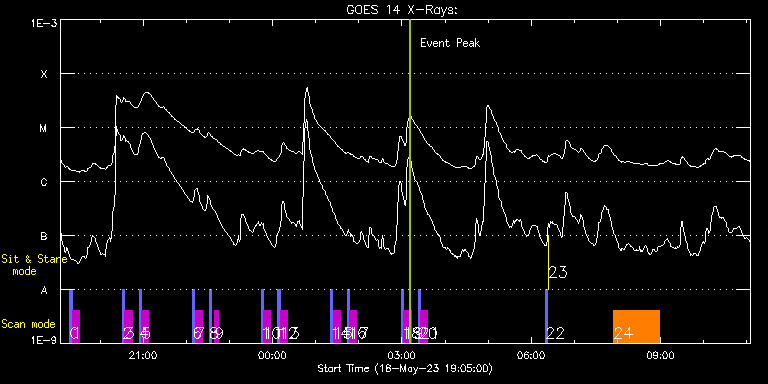 EIS Observation timeline overlay to GOES-Xray curve Code 1" 2" 40" 266" EIS Observations list for this event: STUDY ACRONYM ID DATE OBSERVED DESCRIPTION NOAA# TARGET 0 PRY_slot_contextLITE | 86352 | 2023/05/18 19:18:04 | Synoptic SOT latitudinal scan. | 3307 | Active Region TIMELINE ID DATE OBSERVED FITS FILE XCEN (+W/-E) YCEN (+N/-S) DUR ----------------------------------------------------------------------------------------------------------------- 86352 | 2023/05/18 19:18:04.000 | eis_l0_20230518_191804.fits.gz | -17.49 | -242.74 | 2m57s 1 SK_DEEP_5x512_SLIT1 | 86353 | 2023/05/18 19:21:12 | Synoptic SOT latitudinal scan. | | Quiet Sun TIMELINE ID DATE OBSERVED FITS FILE XCEN (+W/-E) YCEN (+N/-S) DUR ----------------------------------------------------------------------------------------------------------------- 86353 | 2023/05/18 19:21:12.000 | eis_l0_20230518_192112.fits.gz | -18.06 | -254.74 | 10m8s 2 PRY_slot_contextLITE | 86354 | 2023/05/18 20:31:34 | Synoptic SOT latitudinal scan. | 3307 | Active Region TIMELINE ID DATE OBSERVED FITS FILE XCEN (+W/-E) YCEN (+N/-S) DUR ----------------------------------------------------------------------------------------------------------------- 86354 | 2023/05/18 20:31:34.000 | eis_l0_20230518_203134.fits.gz | -17.49 | -152.74 | 2m56s 3 SK_DEEP_5x512_SLIT1 | 86355 | 2023/05/18 20:34:42 | Synoptic SOT latitudinal scan. | | Quiet Sun TIMELINE ID DATE OBSERVED FITS FILE XCEN (+W/-E) YCEN (+N/-S) DUR ----------------------------------------------------------------------------------------------------------------- 86355 | 2023/05/18 20:34:42.000 | eis_l0_20230518_203442.fits.gz | -17.99 | -164.82 | 10m7s 4 PRY_slot_contextLITE | 86356 | 2023/05/18 20:54:34 | Synoptic SOT latitudinal scan. | 3307 | Active Region TIMELINE ID DATE OBSERVED FITS FILE XCEN (+W/-E) YCEN (+N/-S) DUR ----------------------------------------------------------------------------------------------------------------- 86356 | 2023/05/18 20:54:34.000 | eis_l0_20230518_205434.fits.gz | -17.49 | -53.09 | 2m56s 5 SK_DEEP_5x512_SLIT1 | 86357 | 2023/05/18 20:57:42 | Synoptic SOT latitudinal scan. | | Quiet Sun TIMELINE ID DATE OBSERVED FITS FILE XCEN (+W/-E) YCEN (+N/-S) DUR ----------------------------------------------------------------------------------------------------------------- 86357 | 2023/05/18 20:57:42.000 | eis_l0_20230518_205742.fits.gz | -17.99 | -65.17 | 10m8s 6 PRY_slot_contextLITE | 86358 | 2023/05/18 22:09:04 | Synoptic SOT latitudinal scan. | 3307 | Active Region TIMELINE ID DATE OBSERVED FITS FILE XCEN (+W/-E) YCEN (+N/-S) DUR ----------------------------------------------------------------------------------------------------------------- 86358 | 2023/05/18 22:09:04.000 | eis_l0_20230518_220904.fits.gz | -17.49 | 47.02 | 2m56s 7 SK_DEEP_5x512_SLIT1 | 86359 | 2023/05/18 22:12:12 | Synoptic SOT latitudinal scan. | | Quiet Sun TIMELINE ID DATE OBSERVED FITS FILE XCEN (+W/-E) YCEN (+N/-S) DUR ----------------------------------------------------------------------------------------------------------------- 86359 | 2023/05/18 22:12:12.000 | eis_l0_20230518_221212.fits.gz | -18.06 | 35.02 | 10m8s 8 PRY_slot_contextLITE | 86360 | 2023/05/18 22:32:04 | Synoptic SOT latitudinal scan. | 3307 | Active Region TIMELINE ID DATE OBSERVED FITS FILE XCEN (+W/-E) YCEN (+N/-S) DUR ----------------------------------------------------------------------------------------------------------------- 86360 | 2023/05/18 22:32:04.000 | eis_l0_20230518_223204.fits.gz | -17.49 | 147.06 | 2m56s 9 SK_DEEP_5x512_SLIT1 | 86361 | 2023/05/18 22:39:16 | Synoptic SOT latitudinal scan. | | Quiet Sun TIMELINE ID DATE OBSERVED FITS FILE XCEN (+W/-E) YCEN (+N/-S) DUR ----------------------------------------------------------------------------------------------------------------- 86361 | 2023/05/18 22:39:16.000 | eis_l0_20230518_223916.fits.gz | -18.06 | 135.06 | 6m4s 10 PRY_slot_contextLITE | 86362 | 2023/05/18 23:44:34 | Synoptic SOT latitudinal scan. | | Active Region TIMELINE ID DATE OBSERVED FITS FILE XCEN (+W/-E) YCEN (+N/-S) DUR ----------------------------------------------------------------------------------------------------------------- 86362 | 2023/05/18 23:44:34.000 | eis_l0_20230518_234434.fits.gz | -17.49 | 247.17 | 2m56s 11 SK_DEEP_5x512_SLIT1 | 86363 | 2023/05/18 23:47:42 | Synoptic SOT latitudinal scan. | | Quiet Sun TIMELINE ID DATE OBSERVED FITS FILE XCEN (+W/-E) YCEN (+N/-S) DUR ----------------------------------------------------------------------------------------------------------------- 86363 | 2023/05/18 23:47:42.000 | eis_l0_20230518_234742.fits.gz | -17.99 | 235.01 | 10m8s 12 PRY_slot_contextLITE | 86364 | 2023/05/19 00:07:34 | Synoptic SOT latitudinal scan. | | Active Region TIMELINE ID DATE OBSERVED FITS FILE XCEN (+W/-E) YCEN (+N/-S) DUR ----------------------------------------------------------------------------------------------------------------- 86364 | 2023/05/19 00:07:34.000 | eis_l0_20230519_000734.fits.gz | -17.49 | 347.20 | 2m56s 13 SK_DEEP_5x512_SLIT1 | 86365 | 2023/05/19 00:10:41 | Synoptic SOT latitudinal scan. | | Quiet Sun TIMELINE ID DATE OBSERVED FITS FILE XCEN (+W/-E) YCEN (+N/-S) DUR ----------------------------------------------------------------------------------------------------------------- 86365 | 2023/05/19 00:10:41.000 | eis_l0_20230519_001041.fits.gz | -17.99 | 335.20 | 10m8s 14 PRY_slot_contextLITE | 86366 | 2023/05/19 01:21:04 | Synoptic SOT latitudinal scan. | | Active Region TIMELINE ID DATE OBSERVED FITS FILE XCEN (+W/-E) YCEN (+N/-S) DUR ----------------------------------------------------------------------------------------------------------------- 86366 | 2023/05/19 01:21:04.000 | eis_l0_20230519_012104.fits.gz | -17.49 | 447.01 | 2m56s 15 SK_DEEP_5x512_SLIT1 | 86367 | 2023/05/19 01:24:12 | Synoptic SOT latitudinal scan. | | Quiet Sun TIMELINE ID DATE OBSERVED FITS FILE XCEN (+W/-E) YCEN (+N/-S) DUR -----------------------------------------------