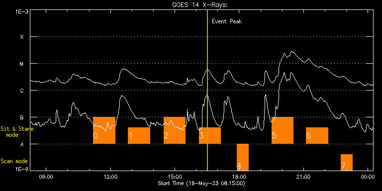 EIS Observation timeline overlay to GOES-Xray curve Code 1" 2" 40" 266" EIS Observations list for this event: STUDY ACRONYM ID DATE OBSERVED DESCRIPTION NOAA# TARGET 0 Flare_SNS_v2 | 86374 | 2023/05/19 11:12:10 | Flare observations above the east limb | | Flare TIMELINE ID DATE OBSERVED FITS FILE XCEN (+W/-E) YCEN (+N/-S) DUR ----------------------------------------------------------------------------------------------------------------- 86374 | 2023/05/19 11:12:10.000 | eis_l0_20230519_111210.fits.gz | -893.44 | -358.73 | 1h0m20s 1 Flare_SNS_v2 | 86375 | 2023/05/19 12:49:43 | Flare observations above the east limb | | Flare TIMELINE ID DATE OBSERVED FITS FILE XCEN (+W/-E) YCEN (+N/-S) DUR ----------------------------------------------------------------------------------------------------------------- 86375 | 2023/05/19 12:49:43.000 | eis_l0_20230519_124943.fits.gz | -893.36 | -358.81 | 1h0m20s 2 Flare_SNS_v2 | 86376 | 2023/05/19 14:28:40 | Flare observations above the east limb | | Flare TIMELINE ID DATE OBSERVED FITS FILE XCEN (+W/-E) YCEN (+N/-S) DUR ----------------------------------------------------------------------------------------------------------------- 86376 | 2023/05/19 14:28:40.000 | eis_l0_20230519_142840.fits.gz | -893.36 | -358.88 | 1h0m21s 3 Flare_SNS_v2 | 86377 | 2023/05/19 16:07:43 | Flare observations above the east limb | | Flare TIMELINE ID DATE OBSERVED FITS FILE XCEN (+W/-E) YCEN (+N/-S) DUR ----------------------------------------------------------------------------------------------------------------- 86377 | 2023/05/19 16:07:43.000 | eis_l0_20230519_160743.fits.gz | -893.36 | -358.81 | 1h0m21s 4 Atlas_30 | 86380 | 2023/05/19 17:54:13 | Full CCD spectra above the east limb f | | Quiet Sun TIMELINE ID DATE OBSERVED FITS FILE XCEN (+W/-E) YCEN (+N/-S) DUR ----------------------------------------------------------------------------------------------------------------- 86380 | 2023/05/19 17:54:13.000 | eis_l0_20230519_175413.fits.gz | -893.36 | -362.81 | 31m39s 5 Flare_SNS_v2 | 86378 | 2023/05/19 19:31:13 | Flare observations above the east limb | | Flare TIMELINE ID DATE OBSERVED FITS FILE XCEN (+W/-E) YCEN (+N/-S) DUR ----------------------------------------------------------------------------------------------------------------- 86378 | 2023/05/19 19:31:13.000 | eis_l0_20230519_193113.fits.gz | -893.61 | -358.81 | 1h0m20s 6 Flare_SNS_v2 | 86379 | 2023/05/19 21:07:43 | Flare observations above the east limb | | Flare TIMELINE ID DATE OBSERVED FITS FILE XCEN (+W/-E) YCEN (+N/-S) DUR ----------------------------------------------------------------------------------------------------------------- 86379 | 2023/05/19 21:07:43.000 | eis_l0_20230519_210743.fits.gz | -893.61 | -358.81 | 1h0m20s 7 Atlas_30 | 86381 | 2023/05/19 22:44:43 | Full CCD spectra above the east limb f | | Quiet Sun TIMELINE ID DATE OBSERVED FITS FILE XCEN (+W/-E) YCEN (+N/-S) DUR ----------------------------------------------------------------------------------------------------------------- 86381 | 2023/05/19 22:44:43.000 | eis_l0_20230519_224443.fits.gz | -893.36 | -362.88 | 31m39s : Check study information : Download file : View thumbnails For this event, also check for: