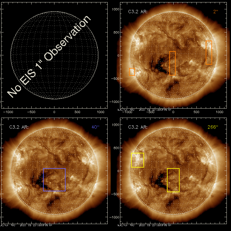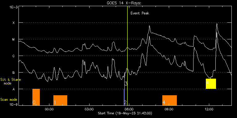 EIS Observation timeline overlay to GOES-Xray curve Code 1" 2" 40" 266" EIS Observations list for this event: STUDY ACRONYM ID DATE OBSERVED DESCRIPTION NOAA# TARGET 0 Atlas_30 | 86381 | 2023/05/19 22:44:43 | Full CCD spectra above the east limb f | | Quiet Sun TIMELINE ID DATE OBSERVED FITS FILE XCEN (+W/-E) YCEN (+N/-S) DUR ----------------------------------------------------------------------------------------------------------------- 86381 | 2023/05/19 22:44:43.000 | eis_l0_20230519_224443.fits.gz | -893.36 | -362.88 | 31m39s 1 Large_CH_Map | 86329 | 2023/05/20 00:19:14 | Cycle 24/25 equatorial transition. | | Quiet Sun TIMELINE ID DATE OBSERVED FITS FILE XCEN (+W/-E) YCEN (+N/-S) DUR ----------------------------------------------------------------------------------------------------------------- 86329 | 2023/05/20 00:19:14.000 | eis_l0_20230520_001914.fits.gz | -16.77 | -175.08 | 1h1m52s 2 PRY_slot_contextLITE | 86332 | 2023/05/20 05:36:19 | Pointing Monitoring | | Active Region TIMELINE ID DATE OBSERVED FITS FILE XCEN (+W/-E) YCEN (+N/-S) DUR ----------------------------------------------------------------------------------------------------------------- 86332 | 2023/05/20 05:36:19.000 | eis_l0_20230520_053619.fits.gz | 0.68 | -195.00 | 2m57s 3 XRT_synop_AIA | 86333 | 2023/05/20 05:39:34 | Pointing Monitoring | | Quiet Sun TIMELINE ID DATE OBSERVED FITS FILE XCEN (+W/-E) YCEN (+N/-S) DUR ----------------------------------------------------------------------------------------------------------------- 86333 | 2023/05/20 05:39:34.000 | eis_l0_20230520_053934.fits.gz | 0.43 | -207.00 | 10s 4 DHB_007_v2 | 86328 | 2023/05/20 08:29:50 | AR filaments form along the magnetic n | 3302 | Active Region TIMELINE ID DATE OBSERVED FITS FILE XCEN (+W/-E) YCEN (+N/-S) DUR ----------------------------------------------------------------------------------------------------------------- 86328 | 2023/05/20 08:29:50.000 | eis_l0_20230520_082950.fits.gz | 773.97 | 54.26 | 1h3m57s 5 Flare266_Hunter01 | 86394 | 2023/05/20 11:46:34 | Flare watch | 3311 | Flare TIMELINE ID DATE OBSERVED FITS FILE XCEN (+W/-E) YCEN (+N/-S) DUR ----------------------------------------------------------------------------------------------------------------- 86394 | 2023/05/20 11:46:34.000 | eis_l0_20230520_114634.fits.gz | -769.90 | 228.51 | 43m59s : Check study information : Download file : View thumbnails For this event, also check for:
