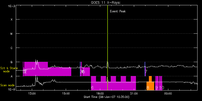 EIS Observation timeline overlay to GOES-Xray curve Code 1" 2" 40" 266" EIS Observations list for this event: STUDY ACRONYM ID DATE OBSERVED DESCRIPTION NOAA# TARGET 0 regcal071 | 484 | 2007/01/08 11:12:12 | Dark exposures, CCD bottom rows | | Engineering TIMELINE ID DATE OBSERVED FITS FILE XCEN (+W/-E) YCEN (+N/-S) DUR ----------------------------------------------------------------------------------------------------------------- 484 | 2007/01/08 11:12:12.000 | eis_l0_20070108_111212.fits.gz | 169.00 | -341.12 | 2m1s 1 regcal072 | 485 | 2007/01/08 11:15:12 | Dark exposures, top CCD rows | | Engineering TIMELINE ID DATE OBSERVED FITS FILE XCEN (+W/-E) YCEN (+N/-S) DUR ----------------------------------------------------------------------------------------------------------------- 485 | 2007/01/08 11:15:12.000 | eis_l0_20070108_111512.fits.gz | 169.45 | 169.99 | 2m1s 2 JTM005 | 486 | 2007/01/08 11:19:13 | JTM005_120exp_512y_60s_slit1_ss | | Quiet Sun TIMELINE ID DATE OBSERVED FITS FILE XCEN (+W/-E) YCEN (+N/-S) DUR ----------------------------------------------------------------------------------------------------------------- 486 | 2007/01/08 11:19:13.000 | eis_l0_20070108_111913.fits.gz | 167.40 | -86.08 | 2h3m46s 486 | 2007/01/08 13:23:03.000 | eis_l0_20070108_132303.fits.gz | 186.52 | -86.08 | 2h3m45s 3 SYNOP001 | 487 | 2007/01/08 16:14:04 | SYNOP001_40arcsec_1arcsec_30s_90s | | Quiet Sun TIMELINE ID DATE OBSERVED FITS FILE XCEN (+W/-E) YCEN (+N/-S) DUR ----------------------------------------------------------------------------------------------------------------- 487 | 2007/01/08 16:14:04.000 | eis_l0_20070108_161404.fits.gz | -109.13 | -36.72 | 2m2s 487 | 2007/01/08 16:16:20.000 | eis_l0_20070108_161620.fits.gz | -128.83 | -36.84 | 2m1s 4 regcal015 | 488 | 2007/01/08 16:20:12 | Dark current, hotpicels and column def | | Engineering TIMELINE ID DATE OBSERVED FITS FILE XCEN (+W/-E) YCEN (+N/-S) DUR ----------------------------------------------------------------------------------------------------------------- 488 | 2007/01/08 16:20:12.000 | eis_l0_20070108_162012.fits.gz | 626.29 | -83.26 | 2m45s 5 regcal016 | 489 | 2007/01/08 16:27:12 | Dark current, hot pixels and column de | | Engineering TIMELINE ID DATE OBSERVED FITS FILE XCEN (+W/-E) YCEN (+N/-S) DUR ----------------------------------------------------------------------------------------------------------------- 489 | 2007/01/08 16:27:12.000 | eis_l0_20070108_162712.fits.gz | 628.78 | -83.23 | 38m32s 6 HH_AR+FLR_RAS_N01 | 490 | 2007/01/08 17:12:13 | HH_AR+FLR_RAS_N01 (EWxNS=240"x240", 5. | 933 | Active Region TIMELINE ID DATE OBSERVED FITS FILE XCEN (+W/-E) YCEN (+N/-S) DUR ----------------------------------------------------------------------------------------------------------------- 490 | 2007/01/08 17:12:13.000 | eis_l0_20070108_171213.fits.gz | 624.00 | -61.61 | 26m17s 490 | 2007/01/08 17:38:33.000 | eis_l0_20070108_173833.fits.gz | 627.24 | -61.77 | 26m16s 490 | 2007/01/08 18:04:52.000 | eis_l0_20070108_180452.fits.gz | 630.47 | -61.84 | 26m15s 490 | 2007/01/08 18:31:10.000 | eis_l0_20070108_183110.fits.gz | 633.54 | -62.04 | 26m16s 490 | 2007/01/08 18:57:29.000 | eis_l0_20070108_185729.fits.gz | 636.66 | -62.15 | 26m16s 490 | 2007/01/08 19:23:48.000 | eis_l0_20070108_192348.fits.gz | 639.83 | -62.23 | 26m17s 490 | 2007/01/08 19:50:07.000 | eis_l0_20070108_195007.fits.gz | 642.96 | -62.46 | 26m15s 490 | 2007/01/08 20:16:25.000 | eis_l0_20070108_201625.fits.gz | 646.05 | -62.58 | 26m17s 490 | 2007/01/08 20:42:45.000 | eis_l0_20070108_204245.fits.gz | 649.14 | -62.62 | 26m15s 7 SYNOP001 | 491 | 2007/01/08 21:56:34 | SYNOP001_40arcsec_1arcsec_30s_90s | | Quiet Sun TIMELINE ID DATE OBSERVED FITS FILE XCEN (+W/-E) YCEN (+N/-S) DUR ----------------------------------------------------------------------------------------------------------------- 491 | 2007/01/08 21:56:34.000 | eis_l0_20070108_215634.fits.gz | -109.19 | -36.65 | 2m2s 491 | 2007/01/08 21:58:50.000 | eis_l0_20070108_215850.fits.gz | -128.83 | -36.80 | 2m1s 8 HH_AR+FLR_RAS_N03 | 492 | 2007/01/08 22:06:27 | HH_AR+FLR_RAS_N03 (EWxNS=240"x240", 5. | 933 | Active Region TIMELINE ID DATE OBSERVED FITS FILE XCEN (+W/-E) YCEN (+N/-S) DUR ----------------------------------------------------------------------------------------------------------------- 492 | 2007/01/08 22:06:27.000 | eis_l0_20070108_220627.fits.gz | 658.72 | -73.31 | 13m7s 492 | 2007/01/08 22:19:36.000 | eis_l0_20070108_221936.fits.gz | 660.18 | -73.23 | 13m8s 492 | 2007/01/08 22:32:47.000 | eis_l0_20070108_223247.fits.gz | 661.81 | -73.39 | 13m7s 9 COMP_TEST_AR_SLIT | 493 | 2007/01/08 22:52:27 | COMP_TEST_AR_SLIT | | Active Region TIMELINE ID DATE OBSERVED FITS FILE XCEN (+W/-E) YCEN (+N/-S) DUR ----------------------------------------------------------------------------------------------------------------- 493 | 2007/01/08 22:52:27.000 | eis_l0_20070108_225227.fits.gz | 529.09 | -85.47 | 1m37s 493 | 2007/01/08 22:54:09.000 | eis_l0_20070108_225409.fits.gz | 529.26 | -85.54 | 1m38s 493 | 2007/01/08 22:55:52.000 | eis_l0_20070108_225552.fits.gz | 529.43 | -85.62 | 1m37s 493 | 2007/01/08 22:57:34.000 | eis_l0_20070108_225734.fits.gz | 529.59 | -85.54 | 1m38s 493 | 2007/01/08 22:59:16.000 | eis_l0_20070108_225916.fits.gz | 529.82 | -85.54 | 1m37s 493 | 2007/01/08 23:00:58.000 | eis_l0_20070108_230058.fits.gz | 530.05 | -85.54 | 1m38s 493 | 2007/01/08 23:02:41.000 | eis_l0_20070108_230241.fits.gz | 530.21 | -85.54 | 1m37s 493 | 2007/01/08 23:04:23.000 | eis_l0_20070108_230423.fits.gz | 530.40 | -85.54 | 1m37s 493 | 2007/01/08 23:06:05.000 | eis_l0_20070108_230605.fits.gz | 530.59 | -85.66 | 1m38s 493 | 2007/01/08 23:07:48.000 | eis_l0_20070108_230748.fits.gz | 530.86 | -85.62 | 1m37s 10 COMP_TEST_AR_SLIT | 494 | 2007/01/08 23:12:12 | COMP_TEST_AR_SLIT | | Active Region TIMELINE ID DATE OBSERVED FITS FILE XCEN (+W/-E) YCEN (+N/-S) DUR ------------------------------------------------------------------------------