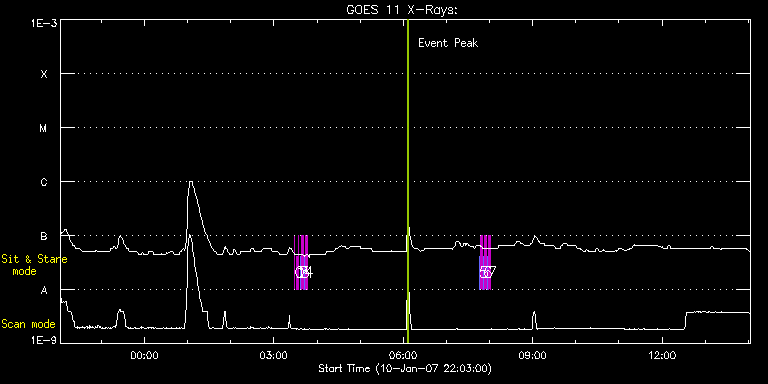 EIS Observation timeline overlay to GOES-Xray curve Code 1" 2" 40" 266" EIS Observations list for this event: STUDY ACRONYM ID DATE OBSERVED DESCRIPTION NOAA# TARGET 0 regcal014 | 536 | 2007/01/11 03:29:11 | ADC offset | | Engineering TIMELINE ID DATE OBSERVED FITS FILE XCEN (+W/-E) YCEN (+N/-S) DUR ----------------------------------------------------------------------------------------------------------------- 536 | 2007/01/11 03:29:11.000 | eis_l0_20070111_032911.fits.gz | 945.23 | -80.52 | 1 regcal019 | 537 | 2007/01/11 03:31:12 | Intensity calibration | | Engineering TIMELINE ID DATE OBSERVED FITS FILE XCEN (+W/-E) YCEN (+N/-S) DUR ----------------------------------------------------------------------------------------------------------------- 537 | 2007/01/11 03:31:12.000 | eis_l0_20070111_033112.fits.gz | 800.69 | -80.48 | 1m40s 2 regcal070 | 538 | 2007/01/11 03:34:41 | Flat field with overscan pixels (50*8) | | Engineering TIMELINE ID DATE OBSERVED FITS FILE XCEN (+W/-E) YCEN (+N/-S) DUR ----------------------------------------------------------------------------------------------------------------- 538 | 2007/01/11 03:34:41.000 | eis_l0_20070111_033441.fits.gz | 945.38 | 175.40 | 1s 3 SYNOP001 | 539 | 2007/01/11 03:36:34 | SYNOP001_40arcsec_1arcsec_30s_90s | | Quiet Sun TIMELINE ID DATE OBSERVED FITS FILE XCEN (+W/-E) YCEN (+N/-S) DUR ----------------------------------------------------------------------------------------------------------------- 539 | 2007/01/11 03:36:34.000 | eis_l0_20070111_033634.fits.gz | 821.43 | -80.52 | 2m1s 539 | 2007/01/11 03:38:49.000 | eis_l0_20070111_033849.fits.gz | 801.77 | -80.60 | 2m1s 4 SYNOP001 | 540 | 2007/01/11 03:42:04 | SYNOP001_40arcsec_1arcsec_30s_90s | | Quiet Sun TIMELINE ID DATE OBSERVED FITS FILE XCEN (+W/-E) YCEN (+N/-S) DUR ----------------------------------------------------------------------------------------------------------------- 540 | 2007/01/11 03:42:04.000 | eis_l0_20070111_034204.fits.gz | 821.72 | -80.64 | 2m1s 540 | 2007/01/11 03:44:19.000 | eis_l0_20070111_034419.fits.gz | 802.06 | -80.60 | 2m1s 5 SYNOP001 | 543 | 2007/01/11 07:45:33 | SYNOP001_40arcsec_1arcsec_30s_90s | 933 | Quiet Sun TIMELINE ID DATE OBSERVED FITS FILE XCEN (+W/-E) YCEN (+N/-S) DUR ----------------------------------------------------------------------------------------------------------------- 543 | 2007/01/11 07:45:33.000 | eis_l0_20070111_074533.fits.gz | 954.34 | -81.60 | 2m2s 543 | 2007/01/11 07:47:49.000 | eis_l0_20070111_074749.fits.gz | 934.66 | -80.60 | 2m1s 6 SYNOP001 | 544 | 2007/01/11 07:51:04 | SYNOP001_40arcsec_1arcsec_30s_90s | | Quiet Sun TIMELINE ID DATE OBSERVED FITS FILE XCEN (+W/-E) YCEN (+N/-S) DUR ----------------------------------------------------------------------------------------------------------------- 544 | 2007/01/11 07:51:04.000 | eis_l0_20070111_075104.fits.gz | 822.57 | -80.68 | 2m1s 544 | 2007/01/11 07:53:19.000 | eis_l0_20070111_075319.fits.gz | 802.87 | -80.68 | 2m1s 7 HH_AR+FLR_RAS_N01 | 545 | 2007/01/11 07:56:34 | HH_AR+FLR_RAS_N01 (EWxNS=240"x240", 5. | | Active Region TIMELINE ID DATE OBSERVED FITS FILE XCEN (+W/-E) YCEN (+N/-S) DUR ----------------------------------------------------------------------------------------------------------------- 545 | 2007/01/11 07:56:34.000 | eis_l0_20070111_075634.fits.gz | 822.55 | -80.79 | 2m1s 545 | 2007/01/11 07:58:49.000 | eis_l0_20070111_075849.fits.gz | 802.83 | -80.68 | 2m1s : Check study information : Download file : View thumbnails For this event, also check for: