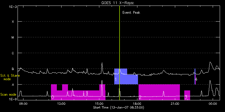 EIS Observation timeline overlay to GOES-Xray curve Code 1" 2" 40" 266" EIS Observations list for this event: STUDY ACRONYM ID DATE OBSERVED DESCRIPTION NOAA# TARGET 0 HH_AR+FLR_RAS_N01 | 593 | 2007/01/13 11:12:13 | HH_AR+FLR_RAS_N01 (EWxNS=240"x240", 5. | 933 | Active Region TIMELINE ID DATE OBSERVED FITS FILE XCEN (+W/-E) YCEN (+N/-S) DUR ----------------------------------------------------------------------------------------------------------------- 593 | 2007/01/13 11:12:13.000 | eis_l0_20070113_111213.fits.gz | 938.47 | -143.63 | 26m16s 593 | 2007/01/13 11:38:32.000 | eis_l0_20070113_113832.fits.gz | 938.43 | -143.63 | 26m15s 593 | 2007/01/13 12:04:50.000 | eis_l0_20070113_120450.fits.gz | 938.38 | -143.55 | 26m16s 593 | 2007/01/13 12:31:08.000 | eis_l0_20070113_123108.fits.gz | 938.40 | -143.59 | 2h30m21s 593 | 2007/01/13 15:01:32.000 | eis_l0_20070113_150132.fits.gz | 938.43 | -143.63 | 26m15s 593 | 2007/01/13 15:27:50.000 | eis_l0_20070113_152750.fits.gz | 1050.75 | -143.71 | 1m36s 1 HPW005_QS_SLOT_060m | 595 | 2007/01/13 16:12:13 | HPW005_QS_SLOT_060m | | Quiet Sun TIMELINE ID DATE OBSERVED FITS FILE XCEN (+W/-E) YCEN (+N/-S) DUR ----------------------------------------------------------------------------------------------------------------- 595 | 2007/01/13 16:12:13.000 | eis_l0_20070113_161213.fits.gz | -109.11 | -982.04 | 59m35s 595 | 2007/01/13 17:11:53.000 | eis_l0_20070113_171153.fits.gz | -109.09 | -981.81 | 51m33s 2 HPW001_FULLCCD_RAST | 596 | 2007/01/13 18:07:20 | HPW001_FULLCCD_RAST_128x128_90S_SLIT1 | | Quiet Sun TIMELINE ID DATE OBSERVED FITS FILE XCEN (+W/-E) YCEN (+N/-S) DUR ----------------------------------------------------------------------------------------------------------------- 596 | 2007/01/13 18:07:20.000 | eis_l0_20070113_180720.fits.gz | 4.01 | -981.69 | 3h15m19s 3 HH_AR+FLR_RAS_N01 | 597 | 2007/01/13 21:45:12 | HH_AR+FLR_RAS_N01 (EWxNS=240"x240", 5. | | Active Region TIMELINE ID DATE OBSERVED FITS FILE XCEN (+W/-E) YCEN (+N/-S) DUR ----------------------------------------------------------------------------------------------------------------- 597 | 2007/01/13 21:45:12.000 | eis_l0_20070113_214512.fits.gz | 4.99 | -981.81 | 26m17s 4 SYNOP001 | 598 | 2007/01/13 22:33:35 | SYNOP001_40arcsec_1arcsec_30s_90s | | Quiet Sun TIMELINE ID DATE OBSERVED FITS FILE XCEN (+W/-E) YCEN (+N/-S) DUR ----------------------------------------------------------------------------------------------------------------- 598 | 2007/01/13 22:33:35.000 | eis_l0_20070113_223335.fits.gz | 22.64 | -36.72 | 2m1s 598 | 2007/01/13 22:35:50.000 | eis_l0_20070113_223550.fits.gz | 2.88 | -36.76 | 2m2s : Check study information : Download file : View thumbnails For this event, also check for: