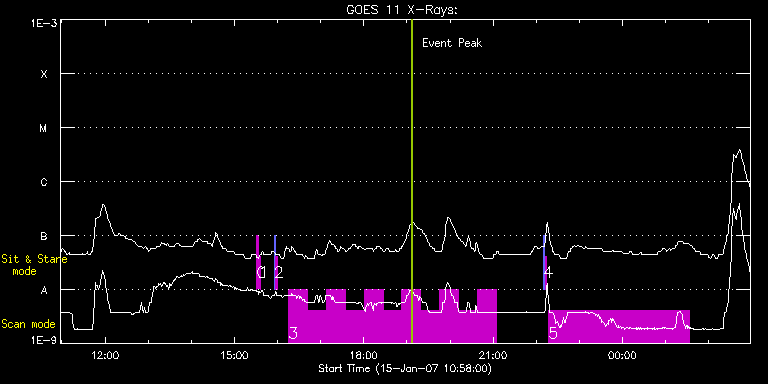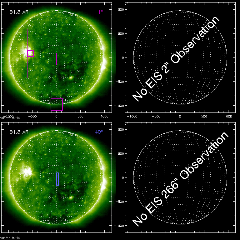 EIS Observation timeline overlay to GOES-Xray curve Code 1" 2" 40" 266" EIS Observations list for this event: STUDY ACRONYM ID DATE OBSERVED DESCRIPTION NOAA# TARGET 0 regcal071 | 614 | 2007/01/15 15:31:10 | Dark exposures, CCD bottom rows | | Engineering TIMELINE ID DATE OBSERVED FITS FILE XCEN (+W/-E) YCEN (+N/-S) DUR ----------------------------------------------------------------------------------------------------------------- 614 | 2007/01/15 15:31:10.000 | eis_l0_20070115_153110.fits.gz | -594.38 | -180.56 | 2m2s 1 regcal072 | 615 | 2007/01/15 15:34:10 | Dark exposures, top CCD rows | | Engineering TIMELINE ID DATE OBSERVED FITS FILE XCEN (+W/-E) YCEN (+N/-S) DUR ----------------------------------------------------------------------------------------------------------------- 615 | 2007/01/15 15:34:10.000 | eis_l0_20070115_153410.fits.gz | -593.97 | 330.51 | 2m2s 2 SYNOP001 | 632 | 2007/01/15 15:55:33 | SYNOP001_40arcsec_1arcsec_30s_90s | | Quiet Sun TIMELINE ID DATE OBSERVED FITS FILE XCEN (+W/-E) YCEN (+N/-S) DUR ----------------------------------------------------------------------------------------------------------------- 632 | 2007/01/15 15:55:33.000 | eis_l0_20070115_155533.fits.gz | 22.73 | -36.84 | 2m1s 632 | 2007/01/15 15:57:48.000 | eis_l0_20070115_155748.fits.gz | 3.00 | -36.72 | 2m2s 3 HH_AR+FLR_RAS_N01 | 623 | 2007/01/15 16:15:11 | HH_AR+FLR_RAS_N01 (EWxNS=240"x240", 5. | | Active Region TIMELINE ID DATE OBSERVED FITS FILE XCEN (+W/-E) YCEN (+N/-S) DUR ----------------------------------------------------------------------------------------------------------------- 623 | 2007/01/15 16:15:11.000 | eis_l0_20070115_161511.fits.gz | 4.92 | -981.77 | 26m16s 623 | 2007/01/15 16:41:30.000 | eis_l0_20070115_164130.fits.gz | 4.90 | -981.69 | 26m16s 623 | 2007/01/15 17:07:49.000 | eis_l0_20070115_170749.fits.gz | 4.97 | -981.77 | 26m16s 623 | 2007/01/15 17:34:08.000 | eis_l0_20070115_173408.fits.gz | 5.03 | -981.77 | 26m15s 623 | 2007/01/15 18:00:26.000 | eis_l0_20070115_180026.fits.gz | 4.97 | -981.77 | 26m16s 623 | 2007/01/15 18:26:45.000 | eis_l0_20070115_182645.fits.gz | 4.97 | -981.85 | 26m15s 623 | 2007/01/15 18:53:03.000 | eis_l0_20070115_185303.fits.gz | 4.99 | -981.81 | 26m16s 623 | 2007/01/15 19:19:22.000 | eis_l0_20070115_191922.fits.gz | 4.97 | -981.69 | 26m16s 623 | 2007/01/15 19:45:41.000 | eis_l0_20070115_194541.fits.gz | 4.92 | -981.77 | 26m16s 623 | 2007/01/15 20:12:00.000 | eis_l0_20070115_201200.fits.gz | 4.95 | -981.69 | 26m17s 623 | 2007/01/15 20:38:20.000 | eis_l0_20070115_203820.fits.gz | 4.99 | -981.65 | 26m16s 4 SYNOP001 | 624 | 2007/01/15 22:10:03 | SYNOP001_40arcsec_1arcsec_30s_90s | | Quiet Sun TIMELINE ID DATE OBSERVED FITS FILE XCEN (+W/-E) YCEN (+N/-S) DUR ----------------------------------------------------------------------------------------------------------------- 624 | 2007/01/15 22:10:03.000 | eis_l0_20070115_221003.fits.gz | 22.64 | -36.76 | 2m1s 624 | 2007/01/15 22:12:18.000 | eis_l0_20070115_221218.fits.gz | 2.92 | -36.80 | 2m2s 5 HPW001_FULLCCD_RAST | 625 | 2007/01/15 22:17:11 | HPW001_FULLCCD_RAST_128x128_90S_SLIT1 | 938 | Quiet Sun TIMELINE ID DATE OBSERVED FITS FILE XCEN (+W/-E) YCEN (+N/-S) DUR ----------------------------------------------------------------------------------------------------------------- 625 | 2007/01/15 22:17:11.000 | eis_l0_20070115_221711.fits.gz | -541.49 | 76.84 | 3h15m20s : Check study information : Download file : View thumbnails For this event, also check for: