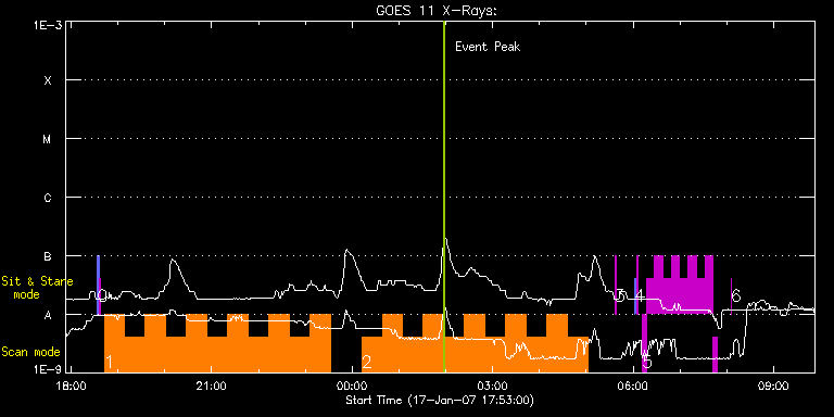 EIS Observation timeline overlay to GOES-Xray curve Code 1" 2" 40" 266" EIS Observations list for this event: STUDY ACRONYM ID DATE OBSERVED DESCRIPTION NOAA# TARGET 0 SYNOP001 | 646 | 2007/01/17 18:33:35 | SYNOP001_40arcsec_1arcsec_30s_90s | | Quiet Sun TIMELINE ID DATE OBSERVED FITS FILE XCEN (+W/-E) YCEN (+N/-S) DUR ----------------------------------------------------------------------------------------------------------------- 646 | 2007/01/17 18:33:35.000 | eis_l0_20070117_183335.fits.gz | 22.66 | -13.72 | 2m2s 646 | 2007/01/17 18:35:51.000 | eis_l0_20070117_183551.fits.gz | 2.94 | -13.88 | 2m1s 1 PRY_loop_footpoints | 647 | 2007/01/17 18:42:27 | Cool lines for study of loop footpoint | 938 | Active Region TIMELINE ID DATE OBSERVED FITS FILE XCEN (+W/-E) YCEN (+N/-S) DUR ----------------------------------------------------------------------------------------------------------------- 647 | 2007/01/17 18:42:27.000 | eis_l0_20070117_184227.fits.gz | -325.80 | 75.79 | 26m18s 647 | 2007/01/17 19:08:49.000 | eis_l0_20070117_190849.fits.gz | -321.65 | 75.71 | 26m17s 647 | 2007/01/17 19:35:10.000 | eis_l0_20070117_193510.fits.gz | -317.55 | 75.90 | 26m18s 647 | 2007/01/17 20:01:32.000 | eis_l0_20070117_200132.fits.gz | -313.46 | 76.06 | 26m17s 647 | 2007/01/17 20:27:53.000 | eis_l0_20070117_202753.fits.gz | -309.37 | 75.98 | 26m18s 647 | 2007/01/17 20:54:15.000 | eis_l0_20070117_205415.fits.gz | -305.31 | 76.21 | 26m17s 647 | 2007/01/17 21:20:36.000 | eis_l0_20070117_212036.fits.gz | -301.20 | 76.37 | 26m17s 647 | 2007/01/17 21:46:57.000 | eis_l0_20070117_214657.fits.gz | -296.91 | 76.48 | 26m17s 647 | 2007/01/17 22:13:18.000 | eis_l0_20070117_221318.fits.gz | -292.97 | 76.44 | 26m18s 647 | 2007/01/17 22:39:39.000 | eis_l0_20070117_223939.fits.gz | -288.86 | 76.48 | 26m18s 647 | 2007/01/17 23:06:01.000 | eis_l0_20070117_230601.fits.gz | -284.69 | 76.68 | 26m17s 2 PRY_loop_footpoints | 648 | 2007/01/18 00:12:13 | Cool lines for study of loop footpoint | | Active Region TIMELINE ID DATE OBSERVED FITS FILE XCEN (+W/-E) YCEN (+N/-S) DUR ----------------------------------------------------------------------------------------------------------------- 648 | 2007/01/18 00:12:13.000 | eis_l0_20070118_001213.fits.gz | -274.37 | 76.91 | 26m17s 648 | 2007/01/18 00:38:34.000 | eis_l0_20070118_003834.fits.gz | -270.26 | 76.99 | 26m17s 648 | 2007/01/18 01:04:55.000 | eis_l0_20070118_010455.fits.gz | -266.07 | 76.99 | 26m17s 648 | 2007/01/18 01:31:16.000 | eis_l0_20070118_013116.fits.gz | -261.94 | 77.06 | 26m18s 648 | 2007/01/18 01:57:38.000 | eis_l0_20070118_015738.fits.gz | -257.80 | 77.14 | 26m17s 648 | 2007/01/18 02:23:59.000 | eis_l0_20070118_022359.fits.gz | -253.71 | 77.29 | 26m17s 648 | 2007/01/18 02:50:20.000 | eis_l0_20070118_025020.fits.gz | -249.58 | 77.37 | 26m17s 648 | 2007/01/18 03:16:41.000 | eis_l0_20070118_031641.fits.gz | -245.46 | 77.37 | 26m17s 648 | 2007/01/18 03:43:02.000 | eis_l0_20070118_034302.fits.gz | -241.31 | 77.53 | 26m17s 648 | 2007/01/18 04:09:23.000 | eis_l0_20070118_040923.fits.gz | -237.14 | 77.53 | 26m18s 648 | 2007/01/18 04:35:44.000 | eis_l0_20070118_043544.fits.gz | -232.93 | 77.53 | 26m18s 3 regcal019 | 649 | 2007/01/18 05:36:27 | Intensity calibration | | Engineering TIMELINE ID DATE OBSERVED FITS FILE XCEN (+W/-E) YCEN (+N/-S) DUR ----------------------------------------------------------------------------------------------------------------- 649 | 2007/01/18 05:36:27.000 | eis_l0_20070118_053627.fits.gz | -227.43 | 77.84 | 1m40s 4 SYNOP001 | 650 | 2007/01/18 06:02:34 | SYNOP001_40arcsec_1arcsec_30s_90s | | Quiet Sun TIMELINE ID DATE OBSERVED FITS FILE XCEN (+W/-E) YCEN (+N/-S) DUR ----------------------------------------------------------------------------------------------------------------- 650 | 2007/01/18 06:02:34.000 | eis_l0_20070118_060234.fits.gz | 22.75 | -13.72 | 2m1s 650 | 2007/01/18 06:04:49.000 | eis_l0_20070118_060449.fits.gz | 2.96 | -13.72 | 2m2s 5 PRY_fast_dens | 651 | 2007/01/18 06:12:12 | High cadence sit-and-stare in ARs; 5s | | Active Region TIMELINE ID DATE OBSERVED FITS FILE XCEN (+W/-E) YCEN (+N/-S) DUR ----------------------------------------------------------------------------------------------------------------- 651 | 2007/01/18 06:12:12.000 | eis_l0_20070118_061212.fits.gz | -220.49 | 77.84 | 4m28s 651 | 2007/01/18 06:16:43.000 | eis_l0_20070118_061643.fits.gz | -219.50 | 77.76 | 10m43s 651 | 2007/01/18 06:27:27.000 | eis_l0_20070118_062727.fits.gz | -217.73 | 77.76 | 10m43s 651 | 2007/01/18 06:38:12.000 | eis_l0_20070118_063812.fits.gz | -216.12 | 77.84 | 10m42s 651 | 2007/01/18 06:48:56.000 | eis_l0_20070118_064856.fits.gz | -214.44 | 77.91 | 10m44s 651 | 2007/01/18 06:59:42.000 | eis_l0_20070118_065942.fits.gz | -212.76 | 77.99 | 10m43s 651 | 2007/01/18 07:10:27.000 | eis_l0_20070118_071027.fits.gz | -211.08 | 78.07 | 10m42s 651 | 2007/01/18 07:21:11.000 | eis_l0_20070118_072111.fits.gz | -209.32 | 77.99 | 10m43s 651 | 2007/01/18 07:31:56.000 | eis_l0_20070118_073156.fits.gz | -207.60 | 77.99 | 10m43s 651 | 2007/01/18 07:42:42.000 | eis_l0_20070118_074242.fits.gz | -206.20 | 78.14 | 4m28s 6 regcal014 | 652 | 2007/01/18 08:05:11 | ADC offset | | Engineering TIMELINE ID DATE OBSERVED FITS FILE XCEN (+W/-E) YCEN (+N/-S) DUR ----------------------------------------------------------------------------------------------------------------- 652 | 2007/01/18 08:05:11.000 | eis_l0_20070118_080511.fits.gz | 12.53 | 127.87 | : Check study information : Download file : View thumbnails For this event, also check for: