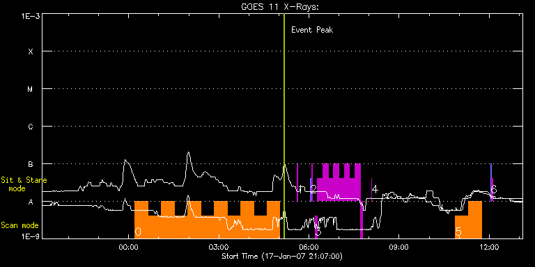 EIS Observation timeline overlay to GOES-Xray curve Code 1" 2" 40" 266" EIS Observations list for this event: STUDY ACRONYM ID DATE OBSERVED DESCRIPTION NOAA# TARGET 0 PRY_loop_footpoints | 648 | 2007/01/18 00:12:13 | Cool lines for study of loop footpoint | | Active Region TIMELINE ID DATE OBSERVED FITS FILE XCEN (+W/-E) YCEN (+N/-S) DUR ----------------------------------------------------------------------------------------------------------------- 648 | 2007/01/18 00:12:13.000 | eis_l0_20070118_001213.fits.gz | -274.37 | 76.91 | 26m17s 648 | 2007/01/18 00:38:34.000 | eis_l0_20070118_003834.fits.gz | -270.26 | 76.99 | 26m17s 648 | 2007/01/18 01:04:55.000 | eis_l0_20070118_010455.fits.gz | -266.07 | 76.99 | 26m17s 648 | 2007/01/18 01:31:16.000 | eis_l0_20070118_013116.fits.gz | -261.94 | 77.06 | 26m18s 648 | 2007/01/18 01:57:38.000 | eis_l0_20070118_015738.fits.gz | -257.80 | 77.14 | 26m17s 648 | 2007/01/18 02:23:59.000 | eis_l0_20070118_022359.fits.gz | -253.71 | 77.29 | 26m17s 648 | 2007/01/18 02:50:20.000 | eis_l0_20070118_025020.fits.gz | -249.58 | 77.37 | 26m17s 648 | 2007/01/18 03:16:41.000 | eis_l0_20070118_031641.fits.gz | -245.46 | 77.37 | 26m17s 648 | 2007/01/18 03:43:02.000 | eis_l0_20070118_034302.fits.gz | -241.31 | 77.53 | 26m17s 648 | 2007/01/18 04:09:23.000 | eis_l0_20070118_040923.fits.gz | -237.14 | 77.53 | 26m18s 648 | 2007/01/18 04:35:44.000 | eis_l0_20070118_043544.fits.gz | -232.93 | 77.53 | 26m18s 1 regcal019 | 649 | 2007/01/18 05:36:27 | Intensity calibration | | Engineering TIMELINE ID DATE OBSERVED FITS FILE XCEN (+W/-E) YCEN (+N/-S) DUR ----------------------------------------------------------------------------------------------------------------- 649 | 2007/01/18 05:36:27.000 | eis_l0_20070118_053627.fits.gz | -227.43 | 77.84 | 1m40s 2 SYNOP001 | 650 | 2007/01/18 06:02:34 | SYNOP001_40arcsec_1arcsec_30s_90s | | Quiet Sun TIMELINE ID DATE OBSERVED FITS FILE XCEN (+W/-E) YCEN (+N/-S) DUR ----------------------------------------------------------------------------------------------------------------- 650 | 2007/01/18 06:02:34.000 | eis_l0_20070118_060234.fits.gz | 22.75 | -13.72 | 2m1s 650 | 2007/01/18 06:04:49.000 | eis_l0_20070118_060449.fits.gz | 2.96 | -13.72 | 2m2s 3 PRY_fast_dens | 651 | 2007/01/18 06:12:12 | High cadence sit-and-stare in ARs; 5s | | Active Region TIMELINE ID DATE OBSERVED FITS FILE XCEN (+W/-E) YCEN (+N/-S) DUR ----------------------------------------------------------------------------------------------------------------- 651 | 2007/01/18 06:12:12.000 | eis_l0_20070118_061212.fits.gz | -220.49 | 77.84 | 4m28s 651 | 2007/01/18 06:16:43.000 | eis_l0_20070118_061643.fits.gz | -219.50 | 77.76 | 10m43s 651 | 2007/01/18 06:27:27.000 | eis_l0_20070118_062727.fits.gz | -217.73 | 77.76 | 10m43s 651 | 2007/01/18 06:38:12.000 | eis_l0_20070118_063812.fits.gz | -216.12 | 77.84 | 10m42s 651 | 2007/01/18 06:48:56.000 | eis_l0_20070118_064856.fits.gz | -214.44 | 77.91 | 10m44s 651 | 2007/01/18 06:59:42.000 | eis_l0_20070118_065942.fits.gz | -212.76 | 77.99 | 10m43s 651 | 2007/01/18 07:10:27.000 | eis_l0_20070118_071027.fits.gz | -211.08 | 78.07 | 10m42s 651 | 2007/01/18 07:21:11.000 | eis_l0_20070118_072111.fits.gz | -209.32 | 77.99 | 10m43s 651 | 2007/01/18 07:31:56.000 | eis_l0_20070118_073156.fits.gz | -207.60 | 77.99 | 10m43s 651 | 2007/01/18 07:42:42.000 | eis_l0_20070118_074242.fits.gz | -206.20 | 78.14 | 4m28s 4 regcal014 | 652 | 2007/01/18 08:05:11 | ADC offset | | Engineering TIMELINE ID DATE OBSERVED FITS FILE XCEN (+W/-E) YCEN (+N/-S) DUR ----------------------------------------------------------------------------------------------------------------- 652 | 2007/01/18 08:05:11.000 | eis_l0_20070118_080511.fits.gz | 12.53 | 127.87 | 5 PRY_loop_footpoints | 653 | 2007/01/18 10:52:27 | Cool lines for study of loop footpoint | | Active Region TIMELINE ID DATE OBSERVED FITS FILE XCEN (+W/-E) YCEN (+N/-S) DUR ----------------------------------------------------------------------------------------------------------------- 653 | 2007/01/18 10:52:27.000 | eis_l0_20070118_105227.fits.gz | -107.88 | 109.45 | 26m18s 653 | 2007/01/18 11:18:49.000 | eis_l0_20070118_111849.fits.gz | -103.75 | 109.45 | 26m17s 6 SYNOP001 | 654 | 2007/01/18 12:02:20 | SYNOP001_40arcsec_1arcsec_30s_90s | | Quiet Sun TIMELINE ID DATE OBSERVED FITS FILE XCEN (+W/-E) YCEN (+N/-S) DUR ----------------------------------------------------------------------------------------------------------------- 654 | 2007/01/18 12:02:20.000 | eis_l0_20070118_120220.fits.gz | 22.73 | -13.88 | 2m1s 654 | 2007/01/18 12:04:35.000 | eis_l0_20070118_120435.fits.gz | 2.98 | -13.80 | 2m2s : Check study information : Download file : View thumbnails For this event, also check for: