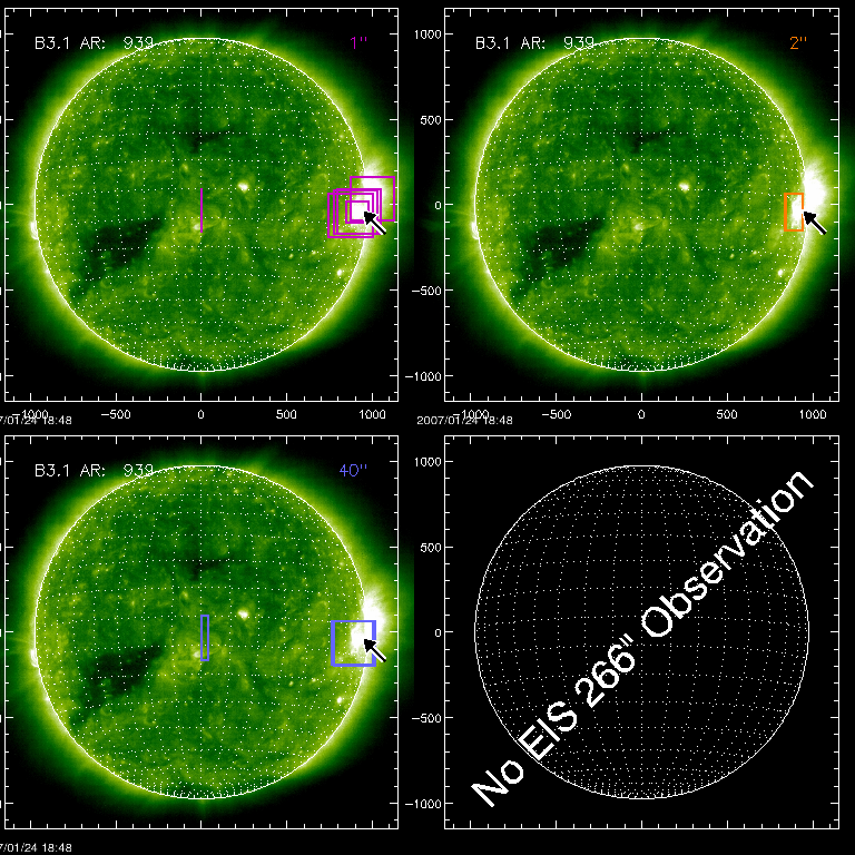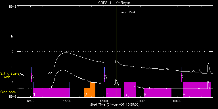 EIS Observation timeline overlay to GOES-Xray curve Code 1" 2" 40" 266" EIS Observations list for this event: STUDY ACRONYM ID DATE OBSERVED DESCRIPTION NOAA# TARGET 0 SYNOP001 | 725 | 2007/01/24 12:02:35 | SYNOP001_40arcsec_1arcsec_30s_90s | | Quiet Sun TIMELINE ID DATE OBSERVED FITS FILE XCEN (+W/-E) YCEN (+N/-S) DUR ----------------------------------------------------------------------------------------------------------------- 725 | 2007/01/24 12:02:35.000 | eis_l0_20070124_120235.fits.gz | 20.84 | -36.72 | 2m2s 725 | 2007/01/24 12:04:50.000 | eis_l0_20070124_120450.fits.gz | 1.14 | -36.76 | 2m2s 1 COMSCI_AR3 | 726 | 2007/01/24 12:12:35 | Accurate Measurement of Velocity Shift | 939 | Active Region TIMELINE ID DATE OBSERVED FITS FILE XCEN (+W/-E) YCEN (+N/-S) DUR ----------------------------------------------------------------------------------------------------------------- 726 | 2007/01/24 12:12:35.000 | eis_l0_20070124_121235.fits.gz | 887.30 | -68.01 | 1m8s 726 | 2007/01/24 12:13:54.000 | eis_l0_20070124_121354.fits.gz | 876.16 | -68.01 | 2h57m23s 726 | 2007/01/24 15:11:42.000 | eis_l0_20070124_151142.fits.gz | 899.63 | -70.36 | 1m8s 2 PRY_loop_footpoints | 727 | 2007/01/24 16:24:34 | Cool lines for study of loop footpoint | 939 | Active Region TIMELINE ID DATE OBSERVED FITS FILE XCEN (+W/-E) YCEN (+N/-S) DUR ----------------------------------------------------------------------------------------------------------------- 727 | 2007/01/24 16:24:34.000 | eis_l0_20070124_162434.fits.gz | 892.68 | -46.33 | 26m18s 727 | 2007/01/24 16:50:56.000 | eis_l0_20070124_165056.fits.gz | 894.38 | -46.64 | 26m17s 3 SYNOP001 | 728 | 2007/01/24 18:01:20 | SYNOP001_40arcsec_1arcsec_30s_90s | | Quiet Sun TIMELINE ID DATE OBSERVED FITS FILE XCEN (+W/-E) YCEN (+N/-S) DUR ----------------------------------------------------------------------------------------------------------------- 728 | 2007/01/24 18:01:20.000 | eis_l0_20070124_180120.fits.gz | 20.81 | -36.80 | 2m2s 728 | 2007/01/24 18:03:36.000 | eis_l0_20070124_180336.fits.gz | 1.19 | -36.88 | 2m1s 4 GAD001_AR_rast | 729 | 2007/01/24 18:11:13 | GAD001_AR_rast | 939 | Active Region TIMELINE ID DATE OBSERVED FITS FILE XCEN (+W/-E) YCEN (+N/-S) DUR ----------------------------------------------------------------------------------------------------------------- 729 | 2007/01/24 18:11:13.000 | eis_l0_20070124_181113.fits.gz | 904.91 | -44.72 | 1h10m41s 5 HPW008_FULLCCD_RAST | 730 | 2007/01/24 19:40:13 | HPW008_FULLCCD_RAST_128x128_25s_SLIT1 | 939 | Active Region TIMELINE ID DATE OBSERVED FITS FILE XCEN (+W/-E) YCEN (+N/-S) DUR ----------------------------------------------------------------------------------------------------------------- 730 | 2007/01/24 19:40:13.000 | eis_l0_20070124_194013.fits.gz | 913.59 | -45.88 | 56m39s 6 JTM002 | 731 | 2007/01/24 21:15:13 | JTM002_256x256_30s_slit1 | 939 | Quiet Sun TIMELINE ID DATE OBSERVED FITS FILE XCEN (+W/-E) YCEN (+N/-S) DUR ----------------------------------------------------------------------------------------------------------------- 731 | 2007/01/24 21:15:13.000 | eis_l0_20070124_211513.fits.gz | 926.67 | -44.11 | 2h14m43s 7 SYNOP001 | 732 | 2007/01/25 00:17:34 | SYNOP001_40arcsec_1arcsec_30s_90s | | Quiet Sun TIMELINE ID DATE OBSERVED FITS FILE XCEN (+W/-E) YCEN (+N/-S) DUR ----------------------------------------------------------------------------------------------------------------- 732 | 2007/01/25 00:17:34.000 | eis_l0_20070125_001734.fits.gz | 20.77 | -36.68 | 2m2s 732 | 2007/01/25 00:19:50.000 | eis_l0_20070125_001950.fits.gz | 1.17 | -36.80 | 2m1s 8 JTM002 | 733 | 2007/01/25 00:27:13 | JTM002_256x256_30s_slit1 | 939 | Quiet Sun TIMELINE ID DATE OBSERVED FITS FILE XCEN (+W/-E) YCEN (+N/-S) DUR ----------------------------------------------------------------------------------------------------------------- 733 | 2007/01/25 00:27:13.000 | eis_l0_20070125_002713.fits.gz | 1003.77 | 33.19 | 2h14m44s : Check study information : Download file : View thumbnails For this event, also check for: