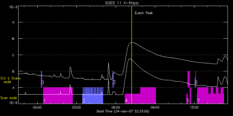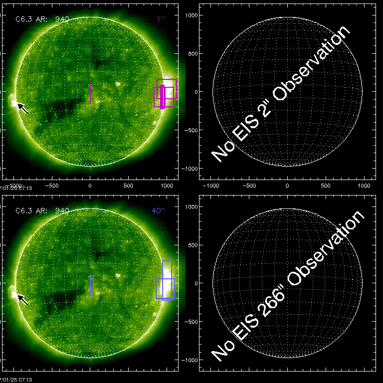 EIS Observation timeline overlay to GOES-Xray curve Code 1" 2" 40" 266" EIS Observations list for this event: STUDY ACRONYM ID DATE OBSERVED DESCRIPTION NOAA# TARGET 0 SYNOP001 | 732 | 2007/01/25 00:17:34 | SYNOP001_40arcsec_1arcsec_30s_90s | | Quiet Sun TIMELINE ID DATE OBSERVED FITS FILE XCEN (+W/-E) YCEN (+N/-S) DUR ----------------------------------------------------------------------------------------------------------------- 732 | 2007/01/25 00:17:34.000 | eis_l0_20070125_001734.fits.gz | 20.77 | -36.68 | 2m2s 732 | 2007/01/25 00:19:50.000 | eis_l0_20070125_001950.fits.gz | 1.17 | -36.80 | 2m1s 1 JTM002 | 733 | 2007/01/25 00:27:13 | JTM002_256x256_30s_slit1 | 939 | Quiet Sun TIMELINE ID DATE OBSERVED FITS FILE XCEN (+W/-E) YCEN (+N/-S) DUR ----------------------------------------------------------------------------------------------------------------- 733 | 2007/01/25 00:27:13.000 | eis_l0_20070125_002713.fits.gz | 1003.77 | 33.19 | 2h14m44s 2 HPW007_QS_SLOTW_060m | 734 | 2007/01/25 03:26:34 | HPW007_QS_SLOTW_060m | 939 | Quiet Sun TIMELINE ID DATE OBSERVED FITS FILE XCEN (+W/-E) YCEN (+N/-S) DUR ----------------------------------------------------------------------------------------------------------------- 734 | 2007/01/25 03:26:34.000 | eis_l0_20070125_032634.fits.gz | 1006.25 | 33.07 | 3m4s 734 | 2007/01/25 03:29:43.000 | eis_l0_20070125_032943.fits.gz | 1006.23 | 33.11 | 3m4s 734 | 2007/01/25 03:32:52.000 | eis_l0_20070125_033252.fits.gz | 1006.21 | 33.11 | 3m4s 734 | 2007/01/25 03:36:01.000 | eis_l0_20070125_033601.fits.gz | 1006.25 | 33.11 | 3m4s 734 | 2007/01/25 03:39:10.000 | eis_l0_20070125_033910.fits.gz | 1006.19 | 33.19 | 3m4s 734 | 2007/01/25 03:42:20.000 | eis_l0_20070125_034220.fits.gz | 1006.25 | 33.11 | 3m3s 734 | 2007/01/25 03:45:29.000 | eis_l0_20070125_034529.fits.gz | 1006.21 | 33.11 | 3m3s 734 | 2007/01/25 03:48:37.000 | eis_l0_20070125_034837.fits.gz | 1006.29 | 33.07 | 3m4s 734 | 2007/01/25 03:51:47.000 | eis_l0_20070125_035147.fits.gz | 1006.27 | 33.03 | 3m4s 734 | 2007/01/25 03:54:56.000 | eis_l0_20070125_035456.fits.gz | 1006.19 | 33.03 | 3m4s 734 | 2007/01/25 03:58:05.000 | eis_l0_20070125_035805.fits.gz | 1006.23 | 33.11 | 3m4s 734 | 2007/01/25 04:01:14.000 | eis_l0_20070125_040114.fits.gz | 1006.23 | 33.03 | 3m4s 734 | 2007/01/25 04:04:23.000 | eis_l0_20070125_040423.fits.gz | 1006.23 | 33.07 | 3m4s 734 | 2007/01/25 04:07:32.000 | eis_l0_20070125_040732.fits.gz | 1006.19 | 33.03 | 3m4s 734 | 2007/01/25 04:10:41.000 | eis_l0_20070125_041041.fits.gz | 1006.23 | 33.11 | 3m4s 734 | 2007/01/25 04:13:51.000 | eis_l0_20070125_041351.fits.gz | 1006.23 | 33.11 | 3m4s 734 | 2007/01/25 04:17:00.000 | eis_l0_20070125_041700.fits.gz | 1006.23 | 33.11 | 3m4s 734 | 2007/01/25 04:20:09.000 | eis_l0_20070125_042009.fits.gz | 1006.23 | 33.03 | 3m3s 734 | 2007/01/25 04:23:18.000 | eis_l0_20070125_042318.fits.gz | 1006.27 | 33.03 | 3m4s 734 | 2007/01/25 04:26:27.000 | eis_l0_20070125_042627.fits.gz | 1006.23 | 33.11 | 3m4s 734 | 2007/01/25 04:29:36.000 | eis_l0_20070125_042936.fits.gz | 1006.27 | 33.11 | 3m4s 734 | 2007/01/25 04:32:45.000 | eis_l0_20070125_043245.fits.gz | 1006.23 | 33.11 | 3m4s 734 | 2007/01/25 04:35:54.000 | eis_l0_20070125_043554.fits.gz | 1006.25 | 33.03 | 3m4s 734 | 2007/01/25 04:39:03.000 | eis_l0_20070125_043903.fits.gz | 1006.21 | 33.03 | 3m4s 734 | 2007/01/25 04:42:12.000 | eis_l0_20070125_044212.fits.gz | 1006.21 | 33.11 | 3m4s 734 | 2007/01/25 04:45:21.000 | eis_l0_20070125_044521.fits.gz | 1006.25 | 33.03 | 3m4s 734 | 2007/01/25 04:48:30.000 | eis_l0_20070125_044830.fits.gz | 1006.21 | 33.03 | 3m4s 734 | 2007/01/25 04:51:39.000 | eis_l0_20070125_045139.fits.gz | 1006.17 | 33.03 | 3m4s 734 | 2007/01/25 04:54:48.000 | eis_l0_20070125_045448.fits.gz | 1006.25 | 33.11 | 3m4s 734 | 2007/01/25 04:57:58.000 | eis_l0_20070125_045758.fits.gz | 1006.23 | 33.15 | 3m3s 3 SYNOP001 | 735 | 2007/01/25 05:46:13 | SYNOP001_40arcsec_1arcsec_30s_90s | | Quiet Sun TIMELINE ID DATE OBSERVED FITS FILE XCEN (+W/-E) YCEN (+N/-S) DUR ----------------------------------------------------------------------------------------------------------------- 735 | 2007/01/25 05:46:13.000 | eis_l0_20070125_054613.fits.gz | 20.83 | -36.88 | 2m1s 735 | 2007/01/25 05:48:28.000 | eis_l0_20070125_054828.fits.gz | 1.17 | -36.88 | 2m1s 4 GAD001_AR_rast | 736 | 2007/01/25 06:41:13 | GAD001_AR_rast | 939 | Active Region TIMELINE ID DATE OBSERVED FITS FILE XCEN (+W/-E) YCEN (+N/-S) DUR ----------------------------------------------------------------------------------------------------------------- 736 | 2007/01/25 06:41:13.000 | eis_l0_20070125_064113.fits.gz | 1003.71 | 33.19 | 1h10m40s 736 | 2007/01/25 07:51:56.000 | eis_l0_20070125_075156.fits.gz | 1003.73 | 32.99 | 1h10m41s 5 PRY_fast_dens | 737 | 2007/01/25 11:24:14 | High cadence sit-and-stare in ARs; 5s | 939 | Active Region TIMELINE ID DATE OBSERVED FITS FILE XCEN (+W/-E) YCEN (+N/-S) DUR ----------------------------------------------------------------------------------------------------------------- 737 | 2007/01/25 11:24:14.000 | eis_l0_20070125_112414.fits.gz | 944.59 | -73.90 | 4m29s 737 | 2007/01/25 11:28:46.000 | eis_l0_20070125_112846.fits.gz | 944.58 | -74.01 | 10m41s 737 | 2007/01/25 11:39:30.000 | eis_l0_20070125_113930.fits.gz | 945.17 | -74.09 | 4m28s 6 SYNOP001 | 738 | 2007/01/25 12:02:34 | SYNOP001_40arcsec_1arcsec_30s_90s | | Quiet Sun TIMELINE ID DATE OBSERVED FITS FILE XCEN (+W/-E) YCEN (+N/-S) DUR ----------------------------------------------------------------------------------------------------------------- 738 | 2007/01/25 12:02:34.000 | eis_l0_20070125_120234.fits.gz | 20.89 | -36.76 | 2m2s 738 | 2007/01/25 12:04:50.000 | eis_l0_20070125_120450.fits.gz | 1.15 | -36.88 | 2m2s 7 COMSCI_AR2 | 739 | 2007/01/25 12:12:34 | Active Region Scan for Global Changes | 939 | Active Region TIMELINE ID DATE OBSERVED FITS FILE XCEN (+W/-E) YCEN (+N/-S) DUR -----------------------------------------------------------------------