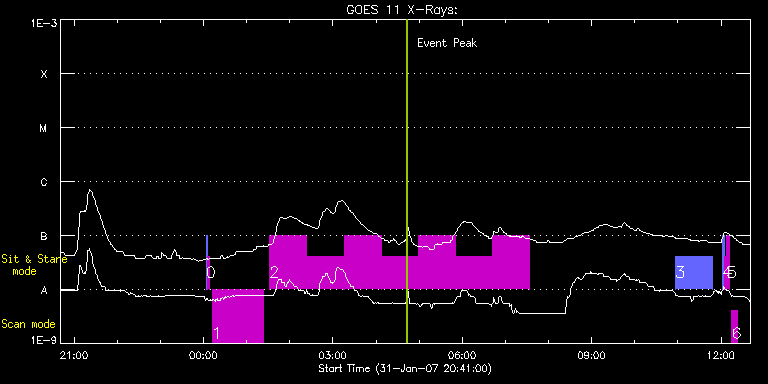 EIS Observation timeline overlay to GOES-Xray curve Code 1" 2" 40" 266" EIS Observations list for this event: STUDY ACRONYM ID DATE OBSERVED DESCRIPTION NOAA# TARGET 0 SYNOP001 | 815 | 2007/02/01 00:03:35 | SYNOP001_40arcsec_1arcsec_30s_90s | | Quiet Sun TIMELINE ID DATE OBSERVED FITS FILE XCEN (+W/-E) YCEN (+N/-S) DUR ----------------------------------------------------------------------------------------------------------------- 815 | 2007/02/01 00:03:35.000 | eis_l0_20070201_000335.fits.gz | 20.99 | -36.88 | 2m1s 815 | 2007/02/01 00:05:50.000 | eis_l0_20070201_000550.fits.gz | 1.21 | -36.76 | 2m2s 1 GAD001_AR_rast | 816 | 2007/02/01 00:12:12 | GAD001_AR_rast | 940 | Active Region TIMELINE ID DATE OBSERVED FITS FILE XCEN (+W/-E) YCEN (+N/-S) DUR ----------------------------------------------------------------------------------------------------------------- 816 | 2007/02/01 00:12:12.000 | eis_l0_20070201_001212.fits.gz | -178.52 | 6.68 | 1h10m42s 2 HPW002_QS_SAS_060m | 817 | 2007/02/01 01:32:12 | HPW002_QS_SAS_060m | 940 | Quiet Sun TIMELINE ID DATE OBSERVED FITS FILE XCEN (+W/-E) YCEN (+N/-S) DUR ----------------------------------------------------------------------------------------------------------------- 817 | 2007/02/01 01:32:12.000 | eis_l0_20070201_013212.fits.gz | -160.63 | -4.97 | 51m33s 817 | 2007/02/01 02:23:50.000 | eis_l0_20070201_022350.fits.gz | -152.72 | -4.82 | 51m33s 817 | 2007/02/01 03:15:27.000 | eis_l0_20070201_031527.fits.gz | -144.68 | -4.59 | 51m33s 817 | 2007/02/01 04:07:04.000 | eis_l0_20070201_040704.fits.gz | -136.67 | -4.39 | 51m33s 817 | 2007/02/01 04:58:42.000 | eis_l0_20070201_045842.fits.gz | -128.62 | -4.36 | 51m32s 817 | 2007/02/01 05:50:19.000 | eis_l0_20070201_055019.fits.gz | -47.51 | -3.97 | 51m33s 817 | 2007/02/01 06:41:56.000 | eis_l0_20070201_064156.fits.gz | -112.57 | -3.82 | 51m33s 3 HPW005_QS_SLOT_060m | 818 | 2007/02/01 10:56:34 | HPW005_QS_SLOT_060m | | Quiet Sun TIMELINE ID DATE OBSERVED FITS FILE XCEN (+W/-E) YCEN (+N/-S) DUR ----------------------------------------------------------------------------------------------------------------- 818 | 2007/02/01 10:56:34.000 | eis_l0_20070201_105634.fits.gz | 4.86 | -3.16 | 51m33s 4 SYNOP001 | 819 | 2007/02/01 12:02:13 | SYNOP001_40arcsec_1arcsec_30s_90s | | Quiet Sun TIMELINE ID DATE OBSERVED FITS FILE XCEN (+W/-E) YCEN (+N/-S) DUR ----------------------------------------------------------------------------------------------------------------- 819 | 2007/02/01 12:02:13.000 | eis_l0_20070201_120213.fits.gz | 20.99 | -36.80 | 2m2s 819 | 2007/02/01 12:04:29.000 | eis_l0_20070201_120429.fits.gz | 1.21 | -36.80 | 2m1s 5 regcal015 | 820 | 2007/02/01 12:08:12 | Dark current, hotpicels and column def | | Engineering TIMELINE ID DATE OBSERVED FITS FILE XCEN (+W/-E) YCEN (+N/-S) DUR ----------------------------------------------------------------------------------------------------------------- 820 | 2007/02/01 12:08:12.000 | eis_l0_20070201_120812.fits.gz | -32.19 | -36.72 | 2m56s 6 HPW013_AR_RAS_23m | 821 | 2007/02/01 12:15:13 | HPW013_AR_RAS_23m | | Active Region TIMELINE ID DATE OBSERVED FITS FILE XCEN (+W/-E) YCEN (+N/-S) DUR ----------------------------------------------------------------------------------------------------------------- 821 | 2007/02/01 12:15:13.000 | eis_l0_20070201_121513.fits.gz | 4.87 | -3.89 | 7m53s : Check study information : Download file : View thumbnails For this event, also check for: