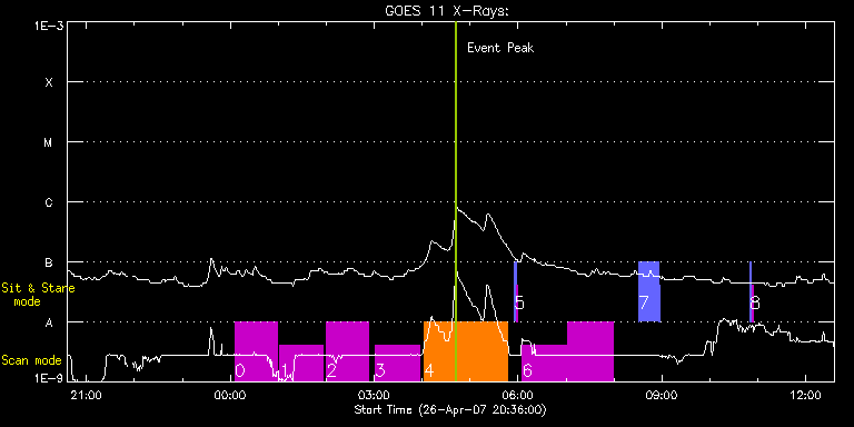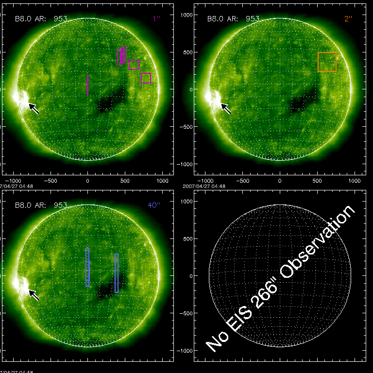 EIS Observation timeline overlay to GOES-Xray curve Code 1" 2" 40" 266" EIS Observations list for this event: STUDY ACRONYM ID DATE OBSERVED DESCRIPTION NOAA# TARGET 0 RED_SUM_EIS_RAST | 2383 | 2007/04/27 00:05:27 | AVERAGE DOPPLER SHIFT IN QS AND AR | | Quiet Sun TIMELINE ID DATE OBSERVED FITS FILE XCEN (+W/-E) YCEN (+N/-S) DUR ----------------------------------------------------------------------------------------------------------------- 2383 | 2007/04/27 00:05:27.000 | eis_l0_20070427_000527.fits.gz | 419.86 | 425.26 | 53m23s 1 RED_SUM_EIS_RAST | 2384 | 2007/04/27 01:02:12 | AVERAGE DOPPLER SHIFT IN QS AND AR | | Quiet Sun TIMELINE ID DATE OBSERVED FITS FILE XCEN (+W/-E) YCEN (+N/-S) DUR ----------------------------------------------------------------------------------------------------------------- 2384 | 2007/04/27 01:02:12.000 | eis_l0_20070427_010212.fits.gz | 496.89 | 463.49 | 53m24s 2 RED_SUM_EIS_RAST | 2392 | 2007/04/27 02:00:12 | AVERAGE DOPPLER SHIFT IN QS AND AR | | Quiet Sun TIMELINE ID DATE OBSERVED FITS FILE XCEN (+W/-E) YCEN (+N/-S) DUR ----------------------------------------------------------------------------------------------------------------- 2392 | 2007/04/27 02:00:12.000 | eis_l0_20070427_020012.fits.gz | 469.01 | 449.85 | 53m24s 3 HPW008_FULLCCD_RAST | 2386 | 2007/04/27 03:00:42 | HPW008_FULLCCD_RAST_128x128_25s_SLIT1 | | Active Region TIMELINE ID DATE OBSERVED FITS FILE XCEN (+W/-E) YCEN (+N/-S) DUR ----------------------------------------------------------------------------------------------------------------- 2386 | 2007/04/27 03:00:42.000 | eis_l0_20070427_030042.fits.gz | 623.73 | 324.18 | 56m40s 4 fil_rast_s2 | 2393 | 2007/04/27 04:02:26 | Simple and quick 240 arcsec raster for | | Filament TIMELINE ID DATE OBSERVED FITS FILE XCEN (+W/-E) YCEN (+N/-S) DUR ----------------------------------------------------------------------------------------------------------------- 2393 | 2007/04/27 04:02:26.000 | eis_l0_20070427_040226.fits.gz | 634.78 | 361.53 | 1h44m 5 SYNOP001 | 2394 | 2007/04/27 05:55:49 | SYNOP001_40arcsec_1arcsec_30s_90s | | Quiet Sun TIMELINE ID DATE OBSERVED FITS FILE XCEN (+W/-E) YCEN (+N/-S) DUR ----------------------------------------------------------------------------------------------------------------- 2394 | 2007/04/27 05:55:49.000 | eis_l0_20070427_055549.fits.gz | 0.39 | 57.20 | 2m2s 2394 | 2007/04/27 05:58:05.000 | eis_l0_20070427_055805.fits.gz | 0.39 | 57.04 | 2m1s 6 HPW008_FULLCCD_RAST | 2389 | 2007/04/27 06:05:12 | HPW008_FULLCCD_RAST_128x128_25s_SLIT1 | | Active Region TIMELINE ID DATE OBSERVED FITS FILE XCEN (+W/-E) YCEN (+N/-S) DUR ----------------------------------------------------------------------------------------------------------------- 2389 | 2007/04/27 06:05:12.000 | eis_l0_20070427_060512.fits.gz | 782.34 | 144.56 | 56m39s 2389 | 2007/04/27 07:01:59.000 | eis_l0_20070427_070159.fits.gz | 782.31 | 144.63 | 56m39s 7 VHH001_SLOT40_30M | 2390 | 2007/04/27 08:30:33 | 40 arcsec slot study for waves and spi | | Quiet Sun TIMELINE ID DATE OBSERVED FITS FILE XCEN (+W/-E) YCEN (+N/-S) DUR ----------------------------------------------------------------------------------------------------------------- 2390 | 2007/04/27 08:30:33.000 | eis_l0_20070427_083033.fits.gz | 388.87 | 32.37 | 24m57s 2390 | 2007/04/27 08:57:12.000 | eis_l0_20070427_085712.fits.gz | -1.26 | 109.32 | 1m1s 8 SYNOP001 | 2395 | 2007/04/27 10:50:13 | SYNOP001_40arcsec_1arcsec_30s_90s | | Quiet Sun TIMELINE ID DATE OBSERVED FITS FILE XCEN (+W/-E) YCEN (+N/-S) DUR ----------------------------------------------------------------------------------------------------------------- 2395 | 2007/04/27 10:50:13.000 | eis_l0_20070427_105013.fits.gz | 0.37 | 57.05 | 2m1s 2395 | 2007/04/27 10:52:28.000 | eis_l0_20070427_105228.fits.gz | 0.38 | 57.07 | 2m1s : Check study information : Download file : View thumbnails For this event, also check for: