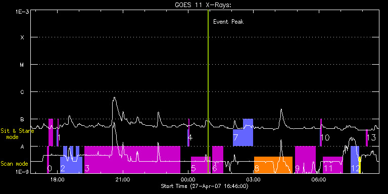 EIS Observation timeline overlay to GOES-Xray curve Code 1" 2" 40" 266" EIS Observations list for this event: STUDY ACRONYM ID DATE OBSERVED DESCRIPTION NOAA# TARGET 0 PRY_fast_dens_v2 | 2400 | 2007/04/27 17:32:12 | High cadence sit-and-stare in ARs (imp | | Active Region TIMELINE ID DATE OBSERVED FITS FILE XCEN (+W/-E) YCEN (+N/-S) DUR ----------------------------------------------------------------------------------------------------------------- 2400 | 2007/04/27 17:32:12.000 | eis_l0_20070427_173212.fits.gz | -744.50 | -363.82 | 4m28s 2400 | 2007/04/27 17:36:43.000 | eis_l0_20070427_173643.fits.gz | -744.70 | -363.98 | 10m43s 1 SYNOP001 | 2401 | 2007/04/27 17:58:34 | SYNOP001_40arcsec_1arcsec_30s_90s | | Quiet Sun TIMELINE ID DATE OBSERVED FITS FILE XCEN (+W/-E) YCEN (+N/-S) DUR ----------------------------------------------------------------------------------------------------------------- 2401 | 2007/04/27 17:58:34.000 | eis_l0_20070427_175834.fits.gz | 0.59 | 57.21 | 2m1s 2401 | 2007/04/27 18:00:49.000 | eis_l0_20070427_180049.fits.gz | 0.41 | 57.19 | 2m1s 2 Slot_raster | 2402 | 2007/04/27 18:08:34 | Slot raster | 953 | Quiet Sun TIMELINE ID DATE OBSERVED FITS FILE XCEN (+W/-E) YCEN (+N/-S) DUR ----------------------------------------------------------------------------------------------------------------- 2402 | 2007/04/27 18:08:34.000 | eis_l0_20070427_180834.fits.gz | -720.87 | -311.03 | 8m28s 2402 | 2007/04/27 18:17:06.000 | eis_l0_20070427_181706.fits.gz | -720.12 | -310.45 | 8m29s 2402 | 2007/04/27 18:25:40.000 | eis_l0_20070427_182540.fits.gz | -719.31 | -310.02 | 8m28s 2402 | 2007/04/27 18:34:13.000 | eis_l0_20070427_183413.fits.gz | -718.46 | -309.57 | 8m29s 2402 | 2007/04/27 18:42:46.000 | eis_l0_20070427_184246.fits.gz | -717.73 | -309.13 | 8m28s 2402 | 2007/04/27 18:51:19.000 | eis_l0_20070427_185119.fits.gz | -716.93 | -308.77 | 8m28s 2402 | 2007/04/27 18:59:52.000 | eis_l0_20070427_185952.fits.gz | -716.13 | -308.27 | 8m28s 3 GAD002_AR_rast | 2403 | 2007/04/27 19:15:19 | GAD002_AR_rast | | Active Region TIMELINE ID DATE OBSERVED FITS FILE XCEN (+W/-E) YCEN (+N/-S) DUR ----------------------------------------------------------------------------------------------------------------- 2403 | 2007/04/27 19:15:19.000 | eis_l0_20070427_191519.fits.gz | -720.60 | -362.97 | 4h22m42s 4 SYNOP001 | 2404 | 2007/04/27 23:58:34 | SYNOP001_40arcsec_1arcsec_30s_90s | | Quiet Sun TIMELINE ID DATE OBSERVED FITS FILE XCEN (+W/-E) YCEN (+N/-S) DUR ----------------------------------------------------------------------------------------------------------------- 2404 | 2007/04/27 23:58:34.000 | eis_l0_20070427_235834.fits.gz | 0.52 | 57.18 | 2m1s 2404 | 2007/04/28 00:00:49.000 | eis_l0_20070428_000049.fits.gz | 0.54 | 57.20 | 2m2s 5 RED_SUM_EIS_RAST | 2405 | 2007/04/28 00:08:13 | AVERAGE DOPPLER SHIFT IN QS AND AR | | Quiet Sun TIMELINE ID DATE OBSERVED FITS FILE XCEN (+W/-E) YCEN (+N/-S) DUR ----------------------------------------------------------------------------------------------------------------- 2405 | 2007/04/28 00:08:13.000 | eis_l0_20070428_000813.fits.gz | 569.44 | 557.46 | 53m23s 6 RED_SUM_EIS_RAST | 2406 | 2007/04/28 01:06:12 | AVERAGE DOPPLER SHIFT IN QS AND AR | | Quiet Sun TIMELINE ID DATE OBSERVED FITS FILE XCEN (+W/-E) YCEN (+N/-S) DUR ----------------------------------------------------------------------------------------------------------------- 2406 | 2007/04/28 01:06:12.000 | eis_l0_20070428_010612.fits.gz | 658.75 | 446.36 | 30m30s 7 VHH001_SLOT40_30M | 2415 | 2007/04/28 02:04:33 | 40 arcsec slot study for waves and spi | | Quiet Sun TIMELINE ID DATE OBSERVED FITS FILE XCEN (+W/-E) YCEN (+N/-S) DUR ----------------------------------------------------------------------------------------------------------------- 2415 | 2007/04/28 02:04:33.000 | eis_l0_20070428_020433.fits.gz | 612.65 | 645.45 | 26m33s 2415 | 2007/04/28 02:31:12.000 | eis_l0_20070428_023112.fits.gz | 615.20 | 646.72 | 26m33s 8 fil_rast_s2 | 2408 | 2007/04/28 03:02:34 | Simple and quick 240 arcsec raster for | | Filament TIMELINE ID DATE OBSERVED FITS FILE XCEN (+W/-E) YCEN (+N/-S) DUR ----------------------------------------------------------------------------------------------------------------- 2408 | 2007/04/28 03:02:34.000 | eis_l0_20070428_030234.fits.gz | -681.69 | -341.59 | 1h43m59s 9 HPW008_FULLCCD_RAST | 2409 | 2007/04/28 04:54:26 | HPW008_FULLCCD_RAST_128x128_25s_SLIT1 | | Active Region TIMELINE ID DATE OBSERVED FITS FILE XCEN (+W/-E) YCEN (+N/-S) DUR ----------------------------------------------------------------------------------------------------------------- 2409 | 2007/04/28 04:54:26.000 | eis_l0_20070428_045426.fits.gz | -673.66 | -369.62 | 56m41s 10 SYNOP001 | 2410 | 2007/04/28 06:02:34 | SYNOP001_40arcsec_1arcsec_30s_90s | | Quiet Sun TIMELINE ID DATE OBSERVED FITS FILE XCEN (+W/-E) YCEN (+N/-S) DUR ----------------------------------------------------------------------------------------------------------------- 2410 | 2007/04/28 06:02:34.000 | eis_l0_20070428_060234.fits.gz | 0.45 | 57.14 | 2m1s 2410 | 2007/04/28 06:04:49.000 | eis_l0_20070428_060449.fits.gz | 0.49 | 57.22 | 2m1s 11 RED_SUM_EIS_RAST | 2411 | 2007/04/28 06:12:12 | AVERAGE DOPPLER SHIFT IN QS AND AR | | Quiet Sun TIMELINE ID DATE OBSERVED FITS FILE XCEN (+W/-E) YCEN (+N/-S) DUR ----------------------------------------------------------------------------------------------------------------- 2411 | 2007/04/28 06:12:12.000 | eis_l0_20070428_061212.fits.gz | -666.15 | -347.05 | 53m24s 12 regcal068 | 2412 | 2007/04/28 07:27:33 | Slot Image (40" and 266") - Active Reg | 953 | Engineering TIMELINE ID DATE OBSERVED FITS FILE XCEN (+W/-E) YCEN (+N/-S) DUR ----------------------------------------------------------------------------------------------------------------- 2412 | 2007/04/28 07:27:33.000 | eis_l0_20070428_072733.fits.gz | -660.90 | -277.60 | 22m14s 2412 | 2007/04/28 07:50:05.000 | eis_l0_20070428_075005.fits.gz | -659.