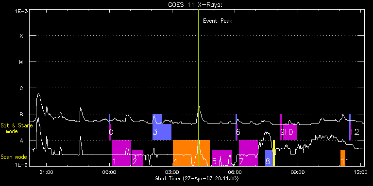 EIS Observation timeline overlay to GOES-Xray curve Code 1" 2" 40" 266" EIS Observations list for this event: STUDY ACRONYM ID DATE OBSERVED DESCRIPTION NOAA# TARGET 0 SYNOP001 | 2404 | 2007/04/27 23:58:34 | SYNOP001_40arcsec_1arcsec_30s_90s | | Quiet Sun TIMELINE ID DATE OBSERVED FITS FILE XCEN (+W/-E) YCEN (+N/-S) DUR ----------------------------------------------------------------------------------------------------------------- 2404 | 2007/04/27 23:58:34.000 | eis_l0_20070427_235834.fits.gz | 0.52 | 57.18 | 2m1s 2404 | 2007/04/28 00:00:49.000 | eis_l0_20070428_000049.fits.gz | 0.54 | 57.20 | 2m2s 1 RED_SUM_EIS_RAST | 2405 | 2007/04/28 00:08:13 | AVERAGE DOPPLER SHIFT IN QS AND AR | | Quiet Sun TIMELINE ID DATE OBSERVED FITS FILE XCEN (+W/-E) YCEN (+N/-S) DUR ----------------------------------------------------------------------------------------------------------------- 2405 | 2007/04/28 00:08:13.000 | eis_l0_20070428_000813.fits.gz | 569.44 | 557.46 | 53m23s 2 RED_SUM_EIS_RAST | 2406 | 2007/04/28 01:06:12 | AVERAGE DOPPLER SHIFT IN QS AND AR | | Quiet Sun TIMELINE ID DATE OBSERVED FITS FILE XCEN (+W/-E) YCEN (+N/-S) DUR ----------------------------------------------------------------------------------------------------------------- 2406 | 2007/04/28 01:06:12.000 | eis_l0_20070428_010612.fits.gz | 658.75 | 446.36 | 30m30s 3 VHH001_SLOT40_30M | 2415 | 2007/04/28 02:04:33 | 40 arcsec slot study for waves and spi | | Quiet Sun TIMELINE ID DATE OBSERVED FITS FILE XCEN (+W/-E) YCEN (+N/-S) DUR ----------------------------------------------------------------------------------------------------------------- 2415 | 2007/04/28 02:04:33.000 | eis_l0_20070428_020433.fits.gz | 612.65 | 645.45 | 26m33s 2415 | 2007/04/28 02:31:12.000 | eis_l0_20070428_023112.fits.gz | 615.20 | 646.72 | 26m33s 4 fil_rast_s2 | 2408 | 2007/04/28 03:02:34 | Simple and quick 240 arcsec raster for | | Filament TIMELINE ID DATE OBSERVED FITS FILE XCEN (+W/-E) YCEN (+N/-S) DUR ----------------------------------------------------------------------------------------------------------------- 2408 | 2007/04/28 03:02:34.000 | eis_l0_20070428_030234.fits.gz | -681.69 | -341.59 | 1h43m59s 5 HPW008_FULLCCD_RAST | 2409 | 2007/04/28 04:54:26 | HPW008_FULLCCD_RAST_128x128_25s_SLIT1 | | Active Region TIMELINE ID DATE OBSERVED FITS FILE XCEN (+W/-E) YCEN (+N/-S) DUR ----------------------------------------------------------------------------------------------------------------- 2409 | 2007/04/28 04:54:26.000 | eis_l0_20070428_045426.fits.gz | -673.66 | -369.62 | 56m41s 6 SYNOP001 | 2410 | 2007/04/28 06:02:34 | SYNOP001_40arcsec_1arcsec_30s_90s | | Quiet Sun TIMELINE ID DATE OBSERVED FITS FILE XCEN (+W/-E) YCEN (+N/-S) DUR ----------------------------------------------------------------------------------------------------------------- 2410 | 2007/04/28 06:02:34.000 | eis_l0_20070428_060234.fits.gz | 0.45 | 57.14 | 2m1s 2410 | 2007/04/28 06:04:49.000 | eis_l0_20070428_060449.fits.gz | 0.49 | 57.22 | 2m1s 7 RED_SUM_EIS_RAST | 2411 | 2007/04/28 06:12:12 | AVERAGE DOPPLER SHIFT IN QS AND AR | | Quiet Sun TIMELINE ID DATE OBSERVED FITS FILE XCEN (+W/-E) YCEN (+N/-S) DUR ----------------------------------------------------------------------------------------------------------------- 2411 | 2007/04/28 06:12:12.000 | eis_l0_20070428_061212.fits.gz | -666.15 | -347.05 | 53m24s 8 regcal068 | 2412 | 2007/04/28 07:27:33 | Slot Image (40" and 266") - Active Reg | 953 | Engineering TIMELINE ID DATE OBSERVED FITS FILE XCEN (+W/-E) YCEN (+N/-S) DUR ----------------------------------------------------------------------------------------------------------------- 2412 | 2007/04/28 07:27:33.000 | eis_l0_20070428_072733.fits.gz | -660.90 | -277.60 | 22m14s 2412 | 2007/04/28 07:50:05.000 | eis_l0_20070428_075005.fits.gz | -659.50 | -276.79 | 3m59s 9 regcal015 | 2413 | 2007/04/28 08:10:11 | Dark current, hot pixels and column de | | Engineering TIMELINE ID DATE OBSERVED FITS FILE XCEN (+W/-E) YCEN (+N/-S) DUR ----------------------------------------------------------------------------------------------------------------- 2413 | 2007/04/28 08:10:11.000 | eis_l0_20070428_081011.fits.gz | -642.79 | -268.40 | 4m24s 10 regcal016 | 2414 | 2007/04/28 08:19:11 | Dark current, hot pixels and column de | | Engineering TIMELINE ID DATE OBSERVED FITS FILE XCEN (+W/-E) YCEN (+N/-S) DUR ----------------------------------------------------------------------------------------------------------------- 2414 | 2007/04/28 08:19:11.000 | eis_l0_20070428_081911.fits.gz | -640.42 | -267.17 | 38m32s 11 HH_AR+FLR_RAS_N03 | 2416 | 2007/04/28 11:02:20 | HH_AR+FLR_RAS_N03 (EWxNS=240"x240", 5. | | Active Region TIMELINE ID DATE OBSERVED FITS FILE XCEN (+W/-E) YCEN (+N/-S) DUR ----------------------------------------------------------------------------------------------------------------- 2416 | 2007/04/28 11:02:20.000 | eis_l0_20070428_110220.fits.gz | -634.86 | -331.85 | 13m7s 12 SYNOP001 | 2417 | 2007/04/28 11:28:20 | SYNOP001_40arcsec_1arcsec_30s_90s | | Quiet Sun TIMELINE ID DATE OBSERVED FITS FILE XCEN (+W/-E) YCEN (+N/-S) DUR ----------------------------------------------------------------------------------------------------------------- 2417 | 2007/04/28 11:28:20.000 | eis_l0_20070428_112820.fits.gz | 0.46 | 57.16 | 2m2s 2417 | 2007/04/28 11:30:35.000 | eis_l0_20070428_113035.fits.gz | 0.35 | 57.15 | 2m2s : Check study information : Download file : View thumbnails For this event, also check for: