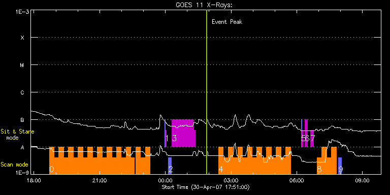 EIS Observation timeline overlay to GOES-Xray curve Code 1" 2" 40" 266" EIS Observations list for this event: STUDY ACRONYM ID DATE OBSERVED DESCRIPTION NOAA# TARGET 0 HH_AR+FLR_RAS_N03 | 2426 | 2007/04/30 18:41:47 | HH_AR+FLR_RAS_N03 (EWxNS=240"x240", 5. | 953 | Active Region TIMELINE ID DATE OBSERVED FITS FILE XCEN (+W/-E) YCEN (+N/-S) DUR ----------------------------------------------------------------------------------------------------------------- 2426 | 2007/04/30 18:41:47.000 | eis_l0_20070430_184147.fits.gz | -201.65 | -83.45 | 13m8s 2426 | 2007/04/30 18:54:58.000 | eis_l0_20070430_185458.fits.gz | -199.67 | -82.47 | 13m7s 2426 | 2007/04/30 19:08:08.000 | eis_l0_20070430_190808.fits.gz | -197.83 | -81.46 | 13m7s 2426 | 2007/04/30 19:21:18.000 | eis_l0_20070430_192118.fits.gz | -195.83 | -80.60 | 13m7s 2426 | 2007/04/30 19:34:28.000 | eis_l0_20070430_193428.fits.gz | -194.00 | -79.54 | 13m7s 2426 | 2007/04/30 19:47:38.000 | eis_l0_20070430_194738.fits.gz | -191.98 | -78.54 | 13m7s 2426 | 2007/04/30 20:00:48.000 | eis_l0_20070430_200048.fits.gz | -189.96 | -77.62 | 13m7s 2426 | 2007/04/30 20:13:57.000 | eis_l0_20070430_201357.fits.gz | -188.04 | -76.54 | 13m7s 2426 | 2007/04/30 20:27:07.000 | eis_l0_20070430_202707.fits.gz | -186.12 | -75.54 | 13m8s 2426 | 2007/04/30 20:40:18.000 | eis_l0_20070430_204018.fits.gz | -184.18 | -74.58 | 13m6s 2426 | 2007/04/30 20:53:27.000 | eis_l0_20070430_205327.fits.gz | -182.22 | -73.66 | 13m7s 2426 | 2007/04/30 21:06:37.000 | eis_l0_20070430_210637.fits.gz | -44892.78 | -84.50 | 13m8s 2426 | 2007/04/30 21:19:47.000 | eis_l0_20070430_211947.fits.gz | -178.19 | -71.66 | 13m8s 2426 | 2007/04/30 21:32:58.000 | eis_l0_20070430_213258.fits.gz | -176.27 | -70.70 | 13m7s 2426 | 2007/04/30 21:46:08.000 | eis_l0_20070430_214608.fits.gz | -174.33 | -69.63 | 13m7s 2426 | 2007/04/30 21:59:18.000 | eis_l0_20070430_215918.fits.gz | -172.37 | -68.64 | 13m7s 2426 | 2007/04/30 22:12:28.000 | eis_l0_20070430_221228.fits.gz | -170.36 | -67.69 | 13m7s 2426 | 2007/04/30 22:25:38.000 | eis_l0_20070430_222538.fits.gz | -135.78 | -84.40 | 9m30s 2426 | 2007/04/30 22:38:48.000 | eis_l0_20070430_223848.fits.gz | -166.54 | -65.71 | 13m8s 2426 | 2007/04/30 22:51:58.000 | eis_l0_20070430_225158.fits.gz | -164.50 | -64.71 | 13m8s 2426 | 2007/04/30 23:05:08.000 | eis_l0_20070430_230508.fits.gz | -162.60 | -63.73 | 13m7s 1 SYNOP001 | 2427 | 2007/04/30 23:58:19 | SYNOP001_40arcsec_1arcsec_30s_90s | | Quiet Sun TIMELINE ID DATE OBSERVED FITS FILE XCEN (+W/-E) YCEN (+N/-S) DUR ----------------------------------------------------------------------------------------------------------------- 2427 | 2007/04/30 23:58:19.000 | eis_l0_20070430_235819.fits.gz | 0.49 | 45.69 | 2m2s 2427 | 2007/05/01 00:00:34.000 | eis_l0_20070501_000034.fits.gz | 0.48 | 45.59 | 2m2s 2 Slot_raster | 2428 | 2007/05/01 00:08:33 | Slot raster | 953 | Quiet Sun TIMELINE ID DATE OBSERVED FITS FILE XCEN (+W/-E) YCEN (+N/-S) DUR ----------------------------------------------------------------------------------------------------------------- 2428 | 2007/05/01 00:08:33.000 | eis_l0_20070501_000833.fits.gz | -135.48 | -6.71 | 8m28s 3 HPW011_HR_AR_SAS | 2429 | 2007/05/01 00:18:18 | HPW011_HR_AR_SAS_1x512_10s_SLIT1_18WIN | | Active Region TIMELINE ID DATE OBSERVED FITS FILE XCEN (+W/-E) YCEN (+N/-S) DUR ----------------------------------------------------------------------------------------------------------------- 2429 | 2007/05/01 00:18:18.000 | eis_l0_20070501_001818.fits.gz | -45124.93 | -133.51 | 59m24s 2429 | 2007/05/01 01:17:47.000 | eis_l0_20070501_011747.fits.gz | -45206.99 | -133.15 | 4m8s 4 HH_AR+FLR_RAS_N03 | 2430 | 2007/05/01 02:25:26 | HH_AR+FLR_RAS_N03 (EWxNS=240"x240", 5. | 953 | Active Region TIMELINE ID DATE OBSERVED FITS FILE XCEN (+W/-E) YCEN (+N/-S) DUR ----------------------------------------------------------------------------------------------------------------- 2430 | 2007/05/01 02:25:26.000 | eis_l0_20070501_022526.fits.gz | -132.59 | -48.78 | 13m6s 2430 | 2007/05/01 02:38:35.000 | eis_l0_20070501_023835.fits.gz | -130.59 | -47.68 | 13m8s 2430 | 2007/05/01 02:51:46.000 | eis_l0_20070501_025146.fits.gz | -128.60 | -46.65 | 13m7s 2430 | 2007/05/01 03:04:55.000 | eis_l0_20070501_030455.fits.gz | -126.63 | -45.67 | 13m8s 2430 | 2007/05/01 03:18:06.000 | eis_l0_20070501_031806.fits.gz | -124.62 | -44.74 | 13m7s 2430 | 2007/05/01 03:31:16.000 | eis_l0_20070501_033116.fits.gz | -122.66 | -43.73 | 13m7s 2430 | 2007/05/01 03:44:26.000 | eis_l0_20070501_034426.fits.gz | -120.72 | -42.80 | 13m7s 2430 | 2007/05/01 03:57:36.000 | eis_l0_20070501_035736.fits.gz | -118.70 | -41.79 | 13m7s 2430 | 2007/05/01 04:10:46.000 | eis_l0_20070501_041046.fits.gz | -116.75 | -40.77 | 13m7s 2430 | 2007/05/01 04:23:56.000 | eis_l0_20070501_042356.fits.gz | -114.75 | -39.78 | 13m7s 2430 | 2007/05/01 04:37:06.000 | eis_l0_20070501_043706.fits.gz | -112.77 | -38.70 | 13m8s 2430 | 2007/05/01 04:50:16.000 | eis_l0_20070501_045016.fits.gz | -110.79 | -37.71 | 13m7s 2430 | 2007/05/01 05:03:25.000 | eis_l0_20070501_050325.fits.gz | -108.82 | -36.78 | 13m8s 2430 | 2007/05/01 05:16:35.000 | eis_l0_20070501_051635.fits.gz | -106.87 | -35.79 | 13m7s 2430 | 2007/05/01 05:29:45.000 | eis_l0_20070501_052945.fits.gz | -104.78 | -34.78 | 13m7s 5 SYNOP001 | 2431 | 2007/05/01 06:12:18 | SYNOP001_40arcsec_1arcsec_30s_90s | | Quiet Sun TIMELINE ID DATE OBSERVED FITS FILE XCEN (+W/-E) YCEN (+N/-S) DUR ----------------------------------------------------------------------------------------------------------------- 2431 | 2007/05/01 06:12:18.000 | eis_l0_20070501_061218.fits.gz | 0.36 | 45.61 | 2m2s 2431 | 2007/05/01 06:14:34.000 | eis_l0_20070501_061434.fits.gz | 0.48 | 45.58 | 2m1s 6 regcal017 | 2432 | 2007/05/01 06:22:10 | Flat fields, short exposures | | Engineering TIMELINE ID DATE OBSERVED FITS FILE XCEN (+W/-E) YCEN (+N/-S) DUR ----------------------------------------------------------------------------------------------------------------- 