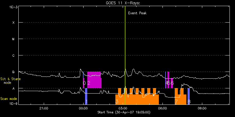 EIS Observation timeline overlay to GOES-Xray curve Code 1" 2" 40" 266" EIS Observations list for this event: STUDY ACRONYM ID DATE OBSERVED DESCRIPTION NOAA# TARGET 0 SYNOP001 | 2427 | 2007/04/30 23:58:19 | SYNOP001_40arcsec_1arcsec_30s_90s | | Quiet Sun TIMELINE ID DATE OBSERVED FITS FILE XCEN (+W/-E) YCEN (+N/-S) DUR ----------------------------------------------------------------------------------------------------------------- 2427 | 2007/04/30 23:58:19.000 | eis_l0_20070430_235819.fits.gz | 0.49 | 45.69 | 2m2s 2427 | 2007/05/01 00:00:34.000 | eis_l0_20070501_000034.fits.gz | 0.48 | 45.59 | 2m2s 1 Slot_raster | 2428 | 2007/05/01 00:08:33 | Slot raster | 953 | Quiet Sun TIMELINE ID DATE OBSERVED FITS FILE XCEN (+W/-E) YCEN (+N/-S) DUR ----------------------------------------------------------------------------------------------------------------- 2428 | 2007/05/01 00:08:33.000 | eis_l0_20070501_000833.fits.gz | -135.48 | -6.71 | 8m28s 2 HPW011_HR_AR_SAS | 2429 | 2007/05/01 00:18:18 | HPW011_HR_AR_SAS_1x512_10s_SLIT1_18WIN | | Active Region TIMELINE ID DATE OBSERVED FITS FILE XCEN (+W/-E) YCEN (+N/-S) DUR ----------------------------------------------------------------------------------------------------------------- 2429 | 2007/05/01 00:18:18.000 | eis_l0_20070501_001818.fits.gz | -45124.93 | -133.51 | 59m24s 2429 | 2007/05/01 01:17:47.000 | eis_l0_20070501_011747.fits.gz | -45206.99 | -133.15 | 4m8s 3 HH_AR+FLR_RAS_N03 | 2430 | 2007/05/01 02:25:26 | HH_AR+FLR_RAS_N03 (EWxNS=240"x240", 5. | 953 | Active Region TIMELINE ID DATE OBSERVED FITS FILE XCEN (+W/-E) YCEN (+N/-S) DUR ----------------------------------------------------------------------------------------------------------------- 2430 | 2007/05/01 02:25:26.000 | eis_l0_20070501_022526.fits.gz | -132.59 | -48.78 | 13m6s 2430 | 2007/05/01 02:38:35.000 | eis_l0_20070501_023835.fits.gz | -130.59 | -47.68 | 13m8s 2430 | 2007/05/01 02:51:46.000 | eis_l0_20070501_025146.fits.gz | -128.60 | -46.65 | 13m7s 2430 | 2007/05/01 03:04:55.000 | eis_l0_20070501_030455.fits.gz | -126.63 | -45.67 | 13m8s 2430 | 2007/05/01 03:18:06.000 | eis_l0_20070501_031806.fits.gz | -124.62 | -44.74 | 13m7s 2430 | 2007/05/01 03:31:16.000 | eis_l0_20070501_033116.fits.gz | -122.66 | -43.73 | 13m7s 2430 | 2007/05/01 03:44:26.000 | eis_l0_20070501_034426.fits.gz | -120.72 | -42.80 | 13m7s 2430 | 2007/05/01 03:57:36.000 | eis_l0_20070501_035736.fits.gz | -118.70 | -41.79 | 13m7s 2430 | 2007/05/01 04:10:46.000 | eis_l0_20070501_041046.fits.gz | -116.75 | -40.77 | 13m7s 2430 | 2007/05/01 04:23:56.000 | eis_l0_20070501_042356.fits.gz | -114.75 | -39.78 | 13m7s 2430 | 2007/05/01 04:37:06.000 | eis_l0_20070501_043706.fits.gz | -112.77 | -38.70 | 13m8s 2430 | 2007/05/01 04:50:16.000 | eis_l0_20070501_045016.fits.gz | -110.79 | -37.71 | 13m7s 2430 | 2007/05/01 05:03:25.000 | eis_l0_20070501_050325.fits.gz | -108.82 | -36.78 | 13m8s 2430 | 2007/05/01 05:16:35.000 | eis_l0_20070501_051635.fits.gz | -106.87 | -35.79 | 13m7s 2430 | 2007/05/01 05:29:45.000 | eis_l0_20070501_052945.fits.gz | -104.78 | -34.78 | 13m7s 4 SYNOP001 | 2431 | 2007/05/01 06:12:18 | SYNOP001_40arcsec_1arcsec_30s_90s | | Quiet Sun TIMELINE ID DATE OBSERVED FITS FILE XCEN (+W/-E) YCEN (+N/-S) DUR ----------------------------------------------------------------------------------------------------------------- 2431 | 2007/05/01 06:12:18.000 | eis_l0_20070501_061218.fits.gz | 0.36 | 45.61 | 2m2s 2431 | 2007/05/01 06:14:34.000 | eis_l0_20070501_061434.fits.gz | 0.48 | 45.58 | 2m1s 5 regcal017 | 2432 | 2007/05/01 06:22:10 | Flat fields, short exposures | | Engineering TIMELINE ID DATE OBSERVED FITS FILE XCEN (+W/-E) YCEN (+N/-S) DUR ----------------------------------------------------------------------------------------------------------------- 2432 | 2007/05/01 06:22:10.000 | eis_l0_20070501_062210.fits.gz | -85.84 | 18.19 | 6m48s 6 regcal018 | 2433 | 2007/05/01 06:38:10 | Flat fields, long exposures | | Engineering TIMELINE ID DATE OBSERVED FITS FILE XCEN (+W/-E) YCEN (+N/-S) DUR ----------------------------------------------------------------------------------------------------------------- 2433 | 2007/05/01 06:38:10.000 | eis_l0_20070501_063810.fits.gz | -83.33 | 19.48 | 8m8s 7 HH_AR+FLR_RAS_N03 | 2434 | 2007/05/01 06:55:25 | HH_AR+FLR_RAS_N03 (EWxNS=240"x240", 5. | 953 | Active Region TIMELINE ID DATE OBSERVED FITS FILE XCEN (+W/-E) YCEN (+N/-S) DUR ----------------------------------------------------------------------------------------------------------------- 2434 | 2007/05/01 06:55:25.000 | eis_l0_20070501_065525.fits.gz | -91.94 | -28.32 | 13m8s 2434 | 2007/05/01 07:08:36.000 | eis_l0_20070501_070836.fits.gz | -89.96 | -27.37 | 13m7s 2434 | 2007/05/01 07:21:46.000 | eis_l0_20070501_072146.fits.gz | -88.00 | -26.32 | 13m7s 2434 | 2007/05/01 07:34:56.000 | eis_l0_20070501_073456.fits.gz | -85.98 | -25.34 | 13m8s 8 Slot_raster | 2435 | 2007/05/01 07:54:18 | Slot raster | 953 | Quiet Sun TIMELINE ID DATE OBSERVED FITS FILE XCEN (+W/-E) YCEN (+N/-S) DUR ----------------------------------------------------------------------------------------------------------------- 2435 | 2007/05/01 07:54:18.000 | eis_l0_20070501_075418.fits.gz | -65.44 | 28.41 | 8m29s : Check study information : Download file : View thumbnails For this event, also check for: