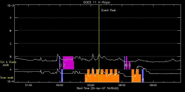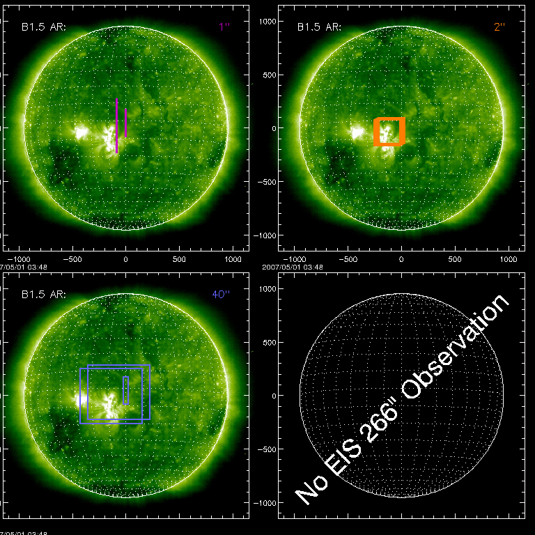 EIS Observation timeline overlay to GOES-Xray curve Code 1" 2" 40" 266" EIS Observations list for this event: STUDY ACRONYM ID DATE OBSERVED DESCRIPTION NOAA# TARGET 0 SYNOP001 | 2427 | 2007/04/30 23:58:19 | SYNOP001_40arcsec_1arcsec_30s_90s | | Quiet Sun TIMELINE ID DATE OBSERVED FITS FILE XCEN (+W/-E) YCEN (+N/-S) DUR ----------------------------------------------------------------------------------------------------------------- 2427 | 2007/04/30 23:58:19.000 | eis_l0_20070430_235819.fits.gz | 0.49 | 45.69 | 2m2s 2427 | 2007/05/01 00:00:34.000 | eis_l0_20070501_000034.fits.gz | 0.48 | 45.59 | 2m2s 1 Slot_raster | 2428 | 2007/05/01 00:08:33 | Slot raster | 953 | Quiet Sun TIMELINE ID DATE OBSERVED FITS FILE XCEN (+W/-E) YCEN (+N/-S) DUR ----------------------------------------------------------------------------------------------------------------- 2428 | 2007/05/01 00:08:33.000 | eis_l0_20070501_000833.fits.gz | -135.48 | -6.71 | 8m28s 2 HPW011_HR_AR_SAS | 2429 | 2007/05/01 00:18:18 | HPW011_HR_AR_SAS_1x512_10s_SLIT1_18WIN | | Active Region TIMELINE ID DATE OBSERVED FITS FILE XCEN (+W/-E) YCEN (+N/-S) DUR ----------------------------------------------------------------------------------------------------------------- 2429 | 2007/05/01 00:18:18.000 | eis_l0_20070501_001818.fits.gz | -45124.93 | -133.51 | 59m24s 2429 | 2007/05/01 01:17:47.000 | eis_l0_20070501_011747.fits.gz | -45206.99 | -133.15 | 4m8s 3 HH_AR+FLR_RAS_N03 | 2430 | 2007/05/01 02:25:26 | HH_AR+FLR_RAS_N03 (EWxNS=240"x240", 5. | 953 | Active Region TIMELINE ID DATE OBSERVED FITS FILE XCEN (+W/-E) YCEN (+N/-S) DUR ----------------------------------------------------------------------------------------------------------------- 2430 | 2007/05/01 02:25:26.000 | eis_l0_20070501_022526.fits.gz | -132.59 | -48.78 | 13m6s 2430 | 2007/05/01 02:38:35.000 | eis_l0_20070501_023835.fits.gz | -130.59 | -47.68 | 13m8s 2430 | 2007/05/01 02:51:46.000 | eis_l0_20070501_025146.fits.gz | -128.60 | -46.65 | 13m7s 2430 | 2007/05/01 03:04:55.000 | eis_l0_20070501_030455.fits.gz | -126.63 | -45.67 | 13m8s 2430 | 2007/05/01 03:18:06.000 | eis_l0_20070501_031806.fits.gz | -124.62 | -44.74 | 13m7s 2430 | 2007/05/01 03:31:16.000 | eis_l0_20070501_033116.fits.gz | -122.66 | -43.73 | 13m7s 2430 | 2007/05/01 03:44:26.000 | eis_l0_20070501_034426.fits.gz | -120.72 | -42.80 | 13m7s 2430 | 2007/05/01 03:57:36.000 | eis_l0_20070501_035736.fits.gz | -118.70 | -41.79 | 13m7s 2430 | 2007/05/01 04:10:46.000 | eis_l0_20070501_041046.fits.gz | -116.75 | -40.77 | 13m7s 2430 | 2007/05/01 04:23:56.000 | eis_l0_20070501_042356.fits.gz | -114.75 | -39.78 | 13m7s 2430 | 2007/05/01 04:37:06.000 | eis_l0_20070501_043706.fits.gz | -112.77 | -38.70 | 13m8s 2430 | 2007/05/01 04:50:16.000 | eis_l0_20070501_045016.fits.gz | -110.79 | -37.71 | 13m7s 2430 | 2007/05/01 05:03:25.000 | eis_l0_20070501_050325.fits.gz | -108.82 | -36.78 | 13m8s 2430 | 2007/05/01 05:16:35.000 | eis_l0_20070501_051635.fits.gz | -106.87 | -35.79 | 13m7s 2430 | 2007/05/01 05:29:45.000 | eis_l0_20070501_052945.fits.gz | -104.78 | -34.78 | 13m7s 4 SYNOP001 | 2431 | 2007/05/01 06:12:18 | SYNOP001_40arcsec_1arcsec_30s_90s | | Quiet Sun TIMELINE ID DATE OBSERVED FITS FILE XCEN (+W/-E) YCEN (+N/-S) DUR ----------------------------------------------------------------------------------------------------------------- 2431 | 2007/05/01 06:12:18.000 | eis_l0_20070501_061218.fits.gz | 0.36 | 45.61 | 2m2s 2431 | 2007/05/01 06:14:34.000 | eis_l0_20070501_061434.fits.gz | 0.48 | 45.58 | 2m1s 5 regcal017 | 2432 | 2007/05/01 06:22:10 | Flat fields, short exposures | | Engineering TIMELINE ID DATE OBSERVED FITS FILE XCEN (+W/-E) YCEN (+N/-S) DUR ----------------------------------------------------------------------------------------------------------------- 2432 | 2007/05/01 06:22:10.000 | eis_l0_20070501_062210.fits.gz | -85.84 | 18.19 | 6m48s 6 regcal018 | 2433 | 2007/05/01 06:38:10 | Flat fields, long exposures | | Engineering TIMELINE ID DATE OBSERVED FITS FILE XCEN (+W/-E) YCEN (+N/-S) DUR ----------------------------------------------------------------------------------------------------------------- 2433 | 2007/05/01 06:38:10.000 | eis_l0_20070501_063810.fits.gz | -83.33 | 19.48 | 8m8s 7 HH_AR+FLR_RAS_N03 | 2434 | 2007/05/01 06:55:25 | HH_AR+FLR_RAS_N03 (EWxNS=240"x240", 5. | 953 | Active Region TIMELINE ID DATE OBSERVED FITS FILE XCEN (+W/-E) YCEN (+N/-S) DUR ----------------------------------------------------------------------------------------------------------------- 2434 | 2007/05/01 06:55:25.000 | eis_l0_20070501_065525.fits.gz | -91.94 | -28.32 | 13m8s 2434 | 2007/05/01 07:08:36.000 | eis_l0_20070501_070836.fits.gz | -89.96 | -27.37 | 13m7s 2434 | 2007/05/01 07:21:46.000 | eis_l0_20070501_072146.fits.gz | -88.00 | -26.32 | 13m7s 2434 | 2007/05/01 07:34:56.000 | eis_l0_20070501_073456.fits.gz | -85.98 | -25.34 | 13m8s 8 Slot_raster | 2435 | 2007/05/01 07:54:18 | Slot raster | 953 | Quiet Sun TIMELINE ID DATE OBSERVED FITS FILE XCEN (+W/-E) YCEN (+N/-S) DUR ----------------------------------------------------------------------------------------------------------------- 2435 | 2007/05/01 07:54:18.000 | eis_l0_20070501_075418.fits.gz | -65.44 | 28.41 | 8m29s : Check study information : Download file : View thumbnails For this event, also check for: