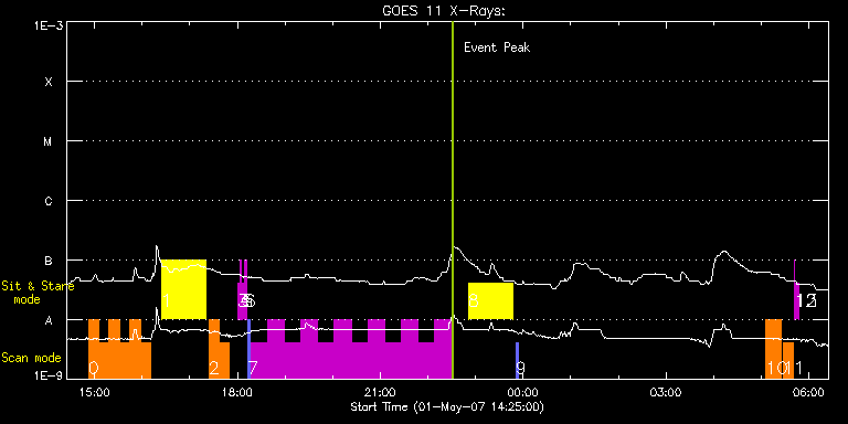 EIS Observation timeline overlay to GOES-Xray curve Code 1" 2" 40" 266" EIS Observations list for this event: STUDY ACRONYM ID DATE OBSERVED DESCRIPTION NOAA# TARGET 0 HH_AR+FLR_RAS_N03 | 2465 | 2007/05/01 14:52:12 | HH_AR+FLR_RAS_N03 (EWxNS=240"x240", 5. | 953 | Active Region TIMELINE ID DATE OBSERVED FITS FILE XCEN (+W/-E) YCEN (+N/-S) DUR ----------------------------------------------------------------------------------------------------------------- 2465 | 2007/05/01 14:52:12.000 | eis_l0_20070501_145212.fits.gz | -15.84 | -14.91 | 13m7s 2465 | 2007/05/01 15:05:22.000 | eis_l0_20070501_150522.fits.gz | -13.85 | -14.00 | 13m7s 2465 | 2007/05/01 15:18:32.000 | eis_l0_20070501_151832.fits.gz | -11.87 | -12.96 | 13m7s 2465 | 2007/05/01 15:31:42.000 | eis_l0_20070501_153142.fits.gz | -9.83 | -12.05 | 13m7s 2465 | 2007/05/01 15:44:52.000 | eis_l0_20070501_154452.fits.gz | -7.79 | -11.02 | 13m8s 2465 | 2007/05/01 15:58:03.000 | eis_l0_20070501_155803.fits.gz | -5.83 | -10.04 | 13m7s 1 HPW014_SLOT266_MOVIE | 2467 | 2007/05/01 16:24:34 | HPW014_SLOT266_MOVIE | 953 | Active Region TIMELINE ID DATE OBSERVED FITS FILE XCEN (+W/-E) YCEN (+N/-S) DUR ----------------------------------------------------------------------------------------------------------------- 2467 | 2007/05/01 16:24:34.000 | eis_l0_20070501_162434.fits.gz | -1.59 | 60.08 | 56m17s 2 HH_AR+FLR_RAS_N03 | 2468 | 2007/05/01 17:23:55 | HH_AR+FLR_RAS_N03 (EWxNS=240"x240", 5. | | Active Region TIMELINE ID DATE OBSERVED FITS FILE XCEN (+W/-E) YCEN (+N/-S) DUR ----------------------------------------------------------------------------------------------------------------- 2468 | 2007/05/01 17:23:55.000 | eis_l0_20070501_172355.fits.gz | 7.08 | -3.62 | 13m7s 2468 | 2007/05/01 17:37:05.000 | eis_l0_20070501_173705.fits.gz | 9.16 | -2.55 | 13m7s 3 regcal071 | 2469 | 2007/05/01 18:00:12 | Dark exposures, CCD bottom rows | | Engineering TIMELINE ID DATE OBSERVED FITS FILE XCEN (+W/-E) YCEN (+N/-S) DUR ----------------------------------------------------------------------------------------------------------------- 2469 | 2007/05/01 18:00:12.000 | eis_l0_20070501_180012.fits.gz | 14.94 | -10.60 | 2m2s 4 regcal072 | 2470 | 2007/05/01 18:03:21 | Dark exposures, top CCD rows | | Engineering TIMELINE ID DATE OBSERVED FITS FILE XCEN (+W/-E) YCEN (+N/-S) DUR ----------------------------------------------------------------------------------------------------------------- 2470 | 2007/05/01 18:03:21.000 | eis_l0_20070501_180321.fits.gz | 15.04 | 244.92 | 2m2s 5 regcal071 | 2471 | 2007/05/01 18:06:31 | Dark exposures, CCD bottom rows | | Engineering TIMELINE ID DATE OBSERVED FITS FILE XCEN (+W/-E) YCEN (+N/-S) DUR ----------------------------------------------------------------------------------------------------------------- 2471 | 2007/05/01 18:06:31.000 | eis_l0_20070501_180631.fits.gz | 15.08 | -10.61 | 2m2s 6 regcal072 | 2472 | 2007/05/01 18:09:41 | Dark exposures, top CCD rows | | Engineering TIMELINE ID DATE OBSERVED FITS FILE XCEN (+W/-E) YCEN (+N/-S) DUR ----------------------------------------------------------------------------------------------------------------- 2472 | 2007/05/01 18:09:41.000 | eis_l0_20070501_180941.fits.gz | 75.56 | 226.50 | 2m2s 7 Diag_40x180_s0_30s | 2473 | 2007/05/01 18:13:00 | Detailed diagnostic study, with slot c | 953 | Active Region TIMELINE ID DATE OBSERVED FITS FILE XCEN (+W/-E) YCEN (+N/-S) DUR ----------------------------------------------------------------------------------------------------------------- 2473 | 2007/05/01 18:13:00.000 | eis_l0_20070501_181300.fits.gz | 31.51 | 38.51 | 3m33s 2473 | 2007/05/01 18:16:49.000 | eis_l0_20070501_181649.fits.gz | 13.73 | -16.33 | 21m2s 2473 | 2007/05/01 18:37:55.000 | eis_l0_20070501_183755.fits.gz | 17.00 | -14.78 | 21m2s 2473 | 2007/05/01 18:59:01.000 | eis_l0_20070501_185901.fits.gz | 20.00 | -13.25 | 21m2s 2473 | 2007/05/01 19:20:07.000 | eis_l0_20070501_192007.fits.gz | 23.24 | -11.66 | 21m1s 2473 | 2007/05/01 19:41:12.000 | eis_l0_20070501_194112.fits.gz | 26.33 | -10.06 | 21m2s 2473 | 2007/05/01 20:02:19.000 | eis_l0_20070501_200219.fits.gz | 29.57 | -8.53 | 21m1s 2473 | 2007/05/01 20:23:24.000 | eis_l0_20070501_202324.fits.gz | 32.83 | -6.89 | 21m2s 2473 | 2007/05/01 20:44:30.000 | eis_l0_20070501_204430.fits.gz | 36.07 | -5.37 | 21m1s 2473 | 2007/05/01 21:05:35.000 | eis_l0_20070501_210535.fits.gz | 39.22 | -3.72 | 21m2s 2473 | 2007/05/01 21:26:41.000 | eis_l0_20070501_212641.fits.gz | 42.40 | -2.23 | 21m2s 2473 | 2007/05/01 21:47:47.000 | eis_l0_20070501_214747.fits.gz | 45.60 | -0.63 | 21m2s 2473 | 2007/05/01 22:08:53.000 | eis_l0_20070501_220853.fits.gz | 48.78 | 0.91 | 21m2s 8 HPW014_SLOT266_MOVIE | 2474 | 2007/05/01 22:50:49 | HPW014_SLOT266_MOVIE | 953 | Active Region TIMELINE ID DATE OBSERVED FITS FILE XCEN (+W/-E) YCEN (+N/-S) DUR ----------------------------------------------------------------------------------------------------------------- 2474 | 2007/05/01 22:50:49.000 | eis_l0_20070501_225049.fits.gz | 56.77 | 88.88 | 56m19s 9 AR_velocity_map | 2475 | 2007/05/01 23:50:36 | Detailed raster to produce active regi | | Active Region TIMELINE ID DATE OBSERVED FITS FILE XCEN (+W/-E) YCEN (+N/-S) DUR ----------------------------------------------------------------------------------------------------------------- 2475 | 2007/05/01 23:50:36.000 | eis_l0_20070501_235036.fits.gz | 82.50 | 63.66 | 3m33s 10 cam_artb_cds_a | 2476 | 2007/05/02 05:06:11 | Active Region Transient Brightenings | | Active Region TIMELINE ID DATE OBSERVED FITS FILE XCEN (+W/-E) YCEN (+N/-S) DUR ----------------------------------------------------------------------------------------------------------------- 2476 | 2007/05/02 05:06:11.000 | eis_l0_20070502_050611.fits.gz | 113.01 | 38.50 | 19m17s 11 HH_AR+FLR_RAS_N03 | 2477 | 2007/05/02 05:27:17 | HH_AR+FLR_RAS_N03 (EWxNS=240"x240", 5. | | Active Region TIMELINE ID DATE OBSERVED FITS FILE XCEN (+W/-E) YCEN (+N/-S) DUR -----------------