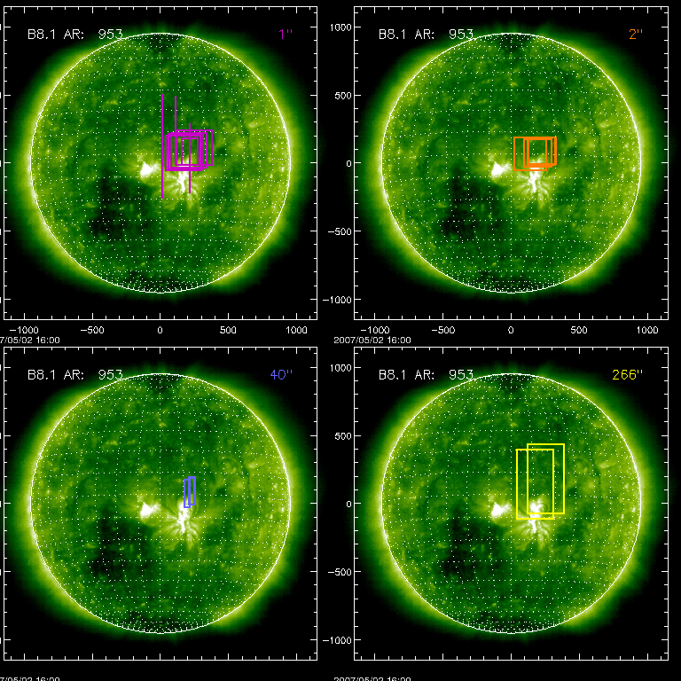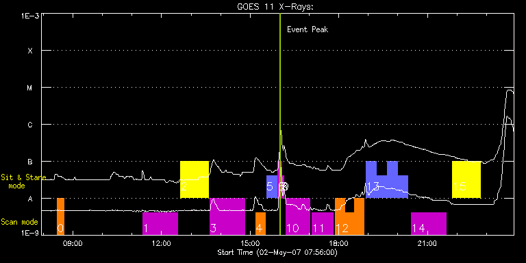 EIS Observation timeline overlay to GOES-Xray curve Code 1" 2" 40" 266" EIS Observations list for this event: STUDY ACRONYM ID DATE OBSERVED DESCRIPTION NOAA# TARGET 0 HH_AR+FLR_RAS_N03 | 2483 | 2007/05/02 08:28:08 | HH_AR+FLR_RAS_N03 (EWxNS=240"x240", 5. | | Active Region TIMELINE ID DATE OBSERVED FITS FILE XCEN (+W/-E) YCEN (+N/-S) DUR ----------------------------------------------------------------------------------------------------------------- 2483 | 2007/05/02 08:28:08.000 | eis_l0_20070502_082808.fits.gz | 142.91 | 63.14 | 13m8s 1 GAD001_AR_rast | 2489 | 2007/05/02 11:22:27 | GAD001_AR_rast | | Active Region TIMELINE ID DATE OBSERVED FITS FILE XCEN (+W/-E) YCEN (+N/-S) DUR ----------------------------------------------------------------------------------------------------------------- 2489 | 2007/05/02 11:22:27.000 | eis_l0_20070502_112227.fits.gz | 170.11 | 70.93 | 1h10m41s 2 HPW014_SLOT266_MOVIE | 2490 | 2007/05/02 12:38:30 | HPW014_SLOT266_MOVIE | 953 | Active Region TIMELINE ID DATE OBSERVED FITS FILE XCEN (+W/-E) YCEN (+N/-S) DUR ----------------------------------------------------------------------------------------------------------------- 2490 | 2007/05/02 12:38:30.000 | eis_l0_20070502_123830.fits.gz | 177.60 | 138.51 | 56m20s 3 GAD001_AR_rast | 2491 | 2007/05/02 13:38:19 | GAD001_AR_rast | | Active Region TIMELINE ID DATE OBSERVED FITS FILE XCEN (+W/-E) YCEN (+N/-S) DUR ----------------------------------------------------------------------------------------------------------------- 2491 | 2007/05/02 13:38:19.000 | eis_l0_20070502_133819.fits.gz | 190.24 | 80.72 | 1h10m41s 4 cam_artb_cds_a | 2492 | 2007/05/02 15:11:57 | Active Region Transient Brightenings | | Active Region TIMELINE ID DATE OBSERVED FITS FILE XCEN (+W/-E) YCEN (+N/-S) DUR ----------------------------------------------------------------------------------------------------------------- 2492 | 2007/05/02 15:11:57.000 | eis_l0_20070502_151157.fits.gz | 200.26 | 71.61 | 19m17s 5 cam_artb_cds_b | 2493 | 2007/05/02 15:33:10 | Active Region Transient Brightenings ( | | Active Region TIMELINE ID DATE OBSERVED FITS FILE XCEN (+W/-E) YCEN (+N/-S) DUR ----------------------------------------------------------------------------------------------------------------- 2493 | 2007/05/02 15:33:10.000 | eis_l0_20070502_153310.fits.gz | 200.78 | 71.79 | 21m10s 6 regcal071 | 2494 | 2007/05/02 15:56:32 | Dark exposures, CCD bottom rows | | Engineering TIMELINE ID DATE OBSERVED FITS FILE XCEN (+W/-E) YCEN (+N/-S) DUR ----------------------------------------------------------------------------------------------------------------- 2494 | 2007/05/02 15:56:32.000 | eis_l0_20070502_155632.fits.gz | 217.32 | 30.56 | 2m2s 7 regcal072 | 2495 | 2007/05/02 15:59:42 | Dark exposures, top CCD rows | | Engineering TIMELINE ID DATE OBSERVED FITS FILE XCEN (+W/-E) YCEN (+N/-S) DUR ----------------------------------------------------------------------------------------------------------------- 2495 | 2007/05/02 15:59:42.000 | eis_l0_20070502_155942.fits.gz | 116.43 | 235.59 | 2m2s 8 regcal071 | 2496 | 2007/05/02 16:02:52 | Dark exposures, CCD bottom rows | | Engineering TIMELINE ID DATE OBSERVED FITS FILE XCEN (+W/-E) YCEN (+N/-S) DUR ----------------------------------------------------------------------------------------------------------------- 2496 | 2007/05/02 16:02:52.000 | eis_l0_20070502_160252.fits.gz | 15.01 | -10.57 | 2m1s 9 regcal072 | 2497 | 2007/05/02 16:06:02 | Dark exposures, top CCD rows | | Engineering TIMELINE ID DATE OBSERVED FITS FILE XCEN (+W/-E) YCEN (+N/-S) DUR ----------------------------------------------------------------------------------------------------------------- 2497 | 2007/05/02 16:06:02.000 | eis_l0_20070502_160602.fits.gz | 14.98 | 244.81 | 2m2s 10 TW_AR111 | 2498 | 2007/05/02 16:12:21 | TW active regio iron study | | Active Region TIMELINE ID DATE OBSERVED FITS FILE XCEN (+W/-E) YCEN (+N/-S) DUR ----------------------------------------------------------------------------------------------------------------- 2498 | 2007/05/02 16:12:21.000 | eis_l0_20070502_161221.fits.gz | 211.42 | 91.09 | 49m23s 11 cam_artb_cds_c | 2499 | 2007/05/02 17:05:58 | Active_Region_Transient_Brightenings_v | | Active Region TIMELINE ID DATE OBSERVED FITS FILE XCEN (+W/-E) YCEN (+N/-S) DUR ----------------------------------------------------------------------------------------------------------------- 2499 | 2007/05/02 17:05:58.000 | eis_l0_20070502_170558.fits.gz | 217.48 | 79.99 | 43m8s 12 cam_artb_cds_a | 2500 | 2007/05/02 17:52:42 | Active Region Transient Brightenings | | Active Region TIMELINE ID DATE OBSERVED FITS FILE XCEN (+W/-E) YCEN (+N/-S) DUR ----------------------------------------------------------------------------------------------------------------- 2500 | 2007/05/02 17:52:42.000 | eis_l0_20070502_175242.fits.gz | 223.92 | 83.10 | 19m16s 2500 | 2007/05/02 18:12:01.000 | eis_l0_20070502_181201.fits.gz | 226.69 | 84.57 | 19m16s 2500 | 2007/05/02 18:31:20.000 | eis_l0_20070502_183120.fits.gz | 229.58 | 85.93 | 19m17s 13 cam_artb_cds_b | 2501 | 2007/05/02 18:55:30 | Active Region Transient Brightenings ( | | Active Region TIMELINE ID DATE OBSERVED FITS FILE XCEN (+W/-E) YCEN (+N/-S) DUR ----------------------------------------------------------------------------------------------------------------- 2501 | 2007/05/02 18:55:30.000 | eis_l0_20070502_185530.fits.gz | 230.50 | 86.28 | 21m10s 2501 | 2007/05/02 19:16:43.000 | eis_l0_20070502_191643.fits.gz | 233.50 | 87.77 | 21m10s 2501 | 2007/05/02 19:37:57.000 | eis_l0_20070502_193757.fits.gz | 236.60 | 89.23 | 21m10s 2501 | 2007/05/02 19:59:10.000 | eis_l0_20070502_195910.fits.gz | 239.69 | 90.80 | 21m10s 14 GAD001_AR_rast | 2502 | 2007/05/02 20:27:55 | GAD001_AR_rast | | Active Region TIMELINE ID DATE OBSERVED FITS FILE XCEN (+W/-E) YCEN (+N/-S) DUR ----------------------------------------------------------------------------------------------------------------- 2502 | 20