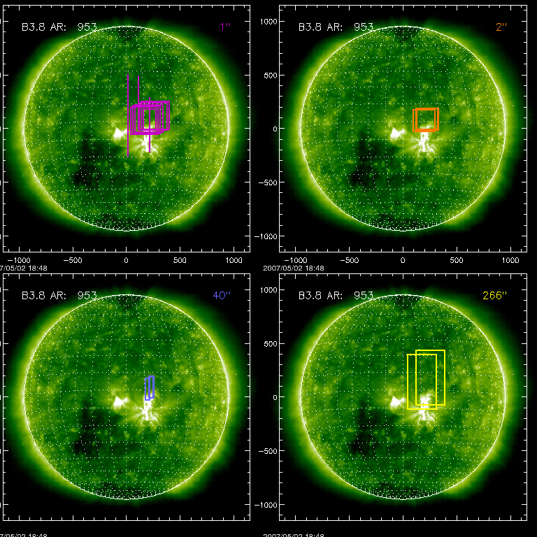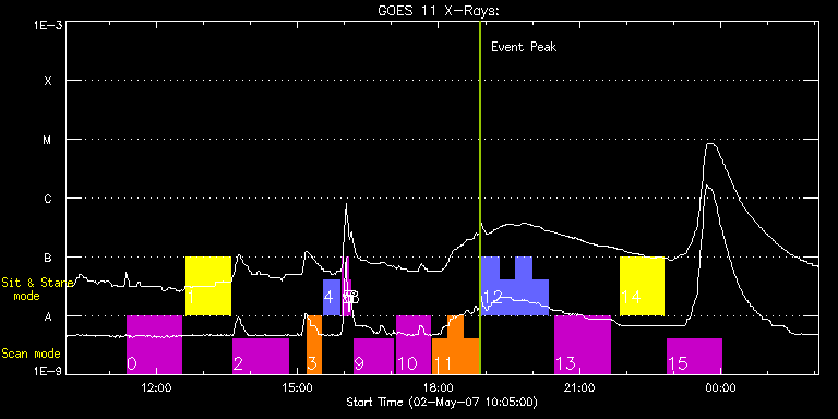 EIS Observation timeline overlay to GOES-Xray curve Code 1" 2" 40" 266" EIS Observations list for this event: STUDY ACRONYM ID DATE OBSERVED DESCRIPTION NOAA# TARGET 0 GAD001_AR_rast | 2489 | 2007/05/02 11:22:27 | GAD001_AR_rast | | Active Region TIMELINE ID DATE OBSERVED FITS FILE XCEN (+W/-E) YCEN (+N/-S) DUR ----------------------------------------------------------------------------------------------------------------- 2489 | 2007/05/02 11:22:27.000 | eis_l0_20070502_112227.fits.gz | 170.11 | 70.93 | 1h10m41s 1 HPW014_SLOT266_MOVIE | 2490 | 2007/05/02 12:38:30 | HPW014_SLOT266_MOVIE | 953 | Active Region TIMELINE ID DATE OBSERVED FITS FILE XCEN (+W/-E) YCEN (+N/-S) DUR ----------------------------------------------------------------------------------------------------------------- 2490 | 2007/05/02 12:38:30.000 | eis_l0_20070502_123830.fits.gz | 177.60 | 138.51 | 56m20s 2 GAD001_AR_rast | 2491 | 2007/05/02 13:38:19 | GAD001_AR_rast | | Active Region TIMELINE ID DATE OBSERVED FITS FILE XCEN (+W/-E) YCEN (+N/-S) DUR ----------------------------------------------------------------------------------------------------------------- 2491 | 2007/05/02 13:38:19.000 | eis_l0_20070502_133819.fits.gz | 190.24 | 80.72 | 1h10m41s 3 cam_artb_cds_a | 2492 | 2007/05/02 15:11:57 | Active Region Transient Brightenings | | Active Region TIMELINE ID DATE OBSERVED FITS FILE XCEN (+W/-E) YCEN (+N/-S) DUR ----------------------------------------------------------------------------------------------------------------- 2492 | 2007/05/02 15:11:57.000 | eis_l0_20070502_151157.fits.gz | 200.26 | 71.61 | 19m17s 4 cam_artb_cds_b | 2493 | 2007/05/02 15:33:10 | Active Region Transient Brightenings ( | | Active Region TIMELINE ID DATE OBSERVED FITS FILE XCEN (+W/-E) YCEN (+N/-S) DUR ----------------------------------------------------------------------------------------------------------------- 2493 | 2007/05/02 15:33:10.000 | eis_l0_20070502_153310.fits.gz | 200.78 | 71.79 | 21m10s 5 regcal071 | 2494 | 2007/05/02 15:56:32 | Dark exposures, CCD bottom rows | | Engineering TIMELINE ID DATE OBSERVED FITS FILE XCEN (+W/-E) YCEN (+N/-S) DUR ----------------------------------------------------------------------------------------------------------------- 2494 | 2007/05/02 15:56:32.000 | eis_l0_20070502_155632.fits.gz | 217.32 | 30.56 | 2m2s 6 regcal072 | 2495 | 2007/05/02 15:59:42 | Dark exposures, top CCD rows | | Engineering TIMELINE ID DATE OBSERVED FITS FILE XCEN (+W/-E) YCEN (+N/-S) DUR ----------------------------------------------------------------------------------------------------------------- 2495 | 2007/05/02 15:59:42.000 | eis_l0_20070502_155942.fits.gz | 116.43 | 235.59 | 2m2s 7 regcal071 | 2496 | 2007/05/02 16:02:52 | Dark exposures, CCD bottom rows | | Engineering TIMELINE ID DATE OBSERVED FITS FILE XCEN (+W/-E) YCEN (+N/-S) DUR ----------------------------------------------------------------------------------------------------------------- 2496 | 2007/05/02 16:02:52.000 | eis_l0_20070502_160252.fits.gz | 15.01 | -10.57 | 2m1s 8 regcal072 | 2497 | 2007/05/02 16:06:02 | Dark exposures, top CCD rows | | Engineering TIMELINE ID DATE OBSERVED FITS FILE XCEN (+W/-E) YCEN (+N/-S) DUR ----------------------------------------------------------------------------------------------------------------- 2497 | 2007/05/02 16:06:02.000 | eis_l0_20070502_160602.fits.gz | 14.98 | 244.81 | 2m2s 9 TW_AR111 | 2498 | 2007/05/02 16:12:21 | TW active regio iron study | | Active Region TIMELINE ID DATE OBSERVED FITS FILE XCEN (+W/-E) YCEN (+N/-S) DUR ----------------------------------------------------------------------------------------------------------------- 2498 | 2007/05/02 16:12:21.000 | eis_l0_20070502_161221.fits.gz | 211.42 | 91.09 | 49m23s 10 cam_artb_cds_c | 2499 | 2007/05/02 17:05:58 | Active_Region_Transient_Brightenings_v | | Active Region TIMELINE ID DATE OBSERVED FITS FILE XCEN (+W/-E) YCEN (+N/-S) DUR ----------------------------------------------------------------------------------------------------------------- 2499 | 2007/05/02 17:05:58.000 | eis_l0_20070502_170558.fits.gz | 217.48 | 79.99 | 43m8s 11 cam_artb_cds_a | 2500 | 2007/05/02 17:52:42 | Active Region Transient Brightenings | | Active Region TIMELINE ID DATE OBSERVED FITS FILE XCEN (+W/-E) YCEN (+N/-S) DUR ----------------------------------------------------------------------------------------------------------------- 2500 | 2007/05/02 17:52:42.000 | eis_l0_20070502_175242.fits.gz | 223.92 | 83.10 | 19m16s 2500 | 2007/05/02 18:12:01.000 | eis_l0_20070502_181201.fits.gz | 226.69 | 84.57 | 19m16s 2500 | 2007/05/02 18:31:20.000 | eis_l0_20070502_183120.fits.gz | 229.58 | 85.93 | 19m17s 12 cam_artb_cds_b | 2501 | 2007/05/02 18:55:30 | Active Region Transient Brightenings ( | | Active Region TIMELINE ID DATE OBSERVED FITS FILE XCEN (+W/-E) YCEN (+N/-S) DUR ----------------------------------------------------------------------------------------------------------------- 2501 | 2007/05/02 18:55:30.000 | eis_l0_20070502_185530.fits.gz | 230.50 | 86.28 | 21m10s 2501 | 2007/05/02 19:16:43.000 | eis_l0_20070502_191643.fits.gz | 233.50 | 87.77 | 21m10s 2501 | 2007/05/02 19:37:57.000 | eis_l0_20070502_193757.fits.gz | 236.60 | 89.23 | 21m10s 2501 | 2007/05/02 19:59:10.000 | eis_l0_20070502_195910.fits.gz | 239.69 | 90.80 | 21m10s 13 GAD001_AR_rast | 2502 | 2007/05/02 20:27:55 | GAD001_AR_rast | | Active Region TIMELINE ID DATE OBSERVED FITS FILE XCEN (+W/-E) YCEN (+N/-S) DUR ----------------------------------------------------------------------------------------------------------------- 2502 | 2007/05/02 20:27:55.000 | eis_l0_20070502_202755.fits.gz | 250.26 | 110.00 | 1h10m41s 14 HPW014_SLOT266_MOVIE | 2503 | 2007/05/02 21:51:20 | HPW014_SLOT266_MOVIE | | Active Region TIMELINE ID DATE OBSERVED FITS FILE XCEN (+W/-E) YCEN (+N/-S) DUR ----------------------------------------------------------------------------------------------------------------- 2503 | 2007/05/02 21