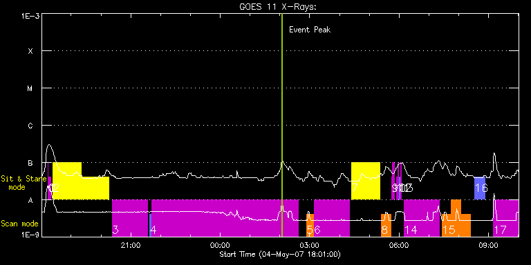 EIS Observation timeline overlay to GOES-Xray curve Code 1" 2" 40" 266" EIS Observations list for this event: STUDY ACRONYM ID DATE OBSERVED DESCRIPTION NOAA# TARGET 0 regcal014 | 2535 | 2007/05/04 18:14:11 | ADC offset | | Engineering TIMELINE ID DATE OBSERVED FITS FILE XCEN (+W/-E) YCEN (+N/-S) DUR ----------------------------------------------------------------------------------------------------------------- 2535 | 2007/05/04 18:14:11.000 | eis_l0_20070504_181411.fits.gz | 15.09 | 116.89 | 1 regcal015 | 2536 | 2007/05/04 18:15:21 | Dark current, hot pixels and column de | | Engineering TIMELINE ID DATE OBSERVED FITS FILE XCEN (+W/-E) YCEN (+N/-S) DUR ----------------------------------------------------------------------------------------------------------------- 2536 | 2007/05/04 18:15:21.000 | eis_l0_20070504_181521.fits.gz | 15.05 | 116.87 | 4m25s 2 HPW014_SLOT266_MOVIE | 2537 | 2007/05/04 18:23:40 | HPW014_SLOT266_MOVIE | | Active Region TIMELINE ID DATE OBSERVED FITS FILE XCEN (+W/-E) YCEN (+N/-S) DUR ----------------------------------------------------------------------------------------------------------------- 2537 | 2007/05/04 18:23:40.000 | eis_l0_20070504_182340.fits.gz | 618.42 | 352.52 | 56m16s 2537 | 2007/05/04 19:19:59.000 | eis_l0_20070504_191959.fits.gz | 624.70 | 355.46 | 56m19s 3 GAD001_AR_rast | 2538 | 2007/05/04 20:22:33 | GAD001_AR_rast | | Active Region TIMELINE ID DATE OBSERVED FITS FILE XCEN (+W/-E) YCEN (+N/-S) DUR ----------------------------------------------------------------------------------------------------------------- 2538 | 2007/05/04 20:22:33.000 | eis_l0_20070504_202233.fits.gz | 635.29 | 296.48 | 1h10m41s 4 AR_velocity_map | 2539 | 2007/05/04 21:38:43 | Detailed raster to produce active regi | | Active Region TIMELINE ID DATE OBSERVED FITS FILE XCEN (+W/-E) YCEN (+N/-S) DUR ----------------------------------------------------------------------------------------------------------------- 2539 | 2007/05/04 21:38:43.000 | eis_l0_20070504_213843.fits.gz | 657.93 | 333.50 | 3m33s 2539 | 2007/05/04 21:42:33.000 | eis_l0_20070504_214233.fits.gz | 656.55 | 318.84 | 4h54m18s 5 HH_AR+FLR_RAS_N03 | 2540 | 2007/05/05 02:53:59 | HH_AR+FLR_RAS_N03 (EWxNS=240"x240", 5. | | Active Region TIMELINE ID DATE OBSERVED FITS FILE XCEN (+W/-E) YCEN (+N/-S) DUR ----------------------------------------------------------------------------------------------------------------- 2540 | 2007/05/05 02:53:59.000 | eis_l0_20070505_025359.fits.gz | 674.53 | 310.64 | 13m7s 6 GAD001_AR_rast | 2541 | 2007/05/05 03:08:48 | GAD001_AR_rast | | Active Region TIMELINE ID DATE OBSERVED FITS FILE XCEN (+W/-E) YCEN (+N/-S) DUR ----------------------------------------------------------------------------------------------------------------- 2541 | 2007/05/05 03:08:48.000 | eis_l0_20070505_030848.fits.gz | 678.91 | 316.73 | 1h10m42s 7 HPW014_SLOT266_MOVIE | 2542 | 2007/05/05 04:24:39 | HPW014_SLOT266_MOVIE | | Active Region TIMELINE ID DATE OBSERVED FITS FILE XCEN (+W/-E) YCEN (+N/-S) DUR ----------------------------------------------------------------------------------------------------------------- 2542 | 2007/05/05 04:24:39.000 | eis_l0_20070505_042439.fits.gz | 683.24 | 382.61 | 56m18s 8 cam_artb_cds_a | 2543 | 2007/05/05 05:24:09 | Active Region Transient Brightenings | | Active Region TIMELINE ID DATE OBSERVED FITS FILE XCEN (+W/-E) YCEN (+N/-S) DUR ----------------------------------------------------------------------------------------------------------------- 2543 | 2007/05/05 05:24:09.000 | eis_l0_20070505_052409.fits.gz | 690.15 | 307.86 | 19m16s 9 regcal014 | 2544 | 2007/05/05 05:45:11 | ADC offset | | Engineering TIMELINE ID DATE OBSERVED FITS FILE XCEN (+W/-E) YCEN (+N/-S) DUR ----------------------------------------------------------------------------------------------------------------- 2544 | 2007/05/05 05:45:11.000 | eis_l0_20070505_054511.fits.gz | 703.21 | 392.24 | 10 regcal015 | 2545 | 2007/05/05 05:46:21 | Dark current, hot pixels and column de | | Engineering TIMELINE ID DATE OBSERVED FITS FILE XCEN (+W/-E) YCEN (+N/-S) DUR ----------------------------------------------------------------------------------------------------------------- 2545 | 2007/05/05 05:46:21.000 | eis_l0_20070505_054621.fits.gz | 703.56 | 392.47 | 4m24s 11 regcal071 | 2546 | 2007/05/05 05:54:26 | Dark exposures, CCD bottom rows | | Engineering TIMELINE ID DATE OBSERVED FITS FILE XCEN (+W/-E) YCEN (+N/-S) DUR ----------------------------------------------------------------------------------------------------------------- 2546 | 2007/05/05 05:54:26.000 | eis_l0_20070505_055426.fits.gz | 704.17 | 265.18 | 2m1s 12 regcal072 | 2547 | 2007/05/05 05:57:31 | Dark exposures, top CCD rows | | Engineering TIMELINE ID DATE OBSERVED FITS FILE XCEN (+W/-E) YCEN (+N/-S) DUR ----------------------------------------------------------------------------------------------------------------- 2547 | 2007/05/05 05:57:31.000 | eis_l0_20070505_055731.fits.gz | 359.54 | 348.40 | 2m2s 13 SYNOP001 | 2548 | 2007/05/05 06:00:45 | SYNOP001_40arcsec_1arcsec_30s_90s | | Quiet Sun TIMELINE ID DATE OBSERVED FITS FILE XCEN (+W/-E) YCEN (+N/-S) DUR ----------------------------------------------------------------------------------------------------------------- 2548 | 2007/05/05 06:00:45.000 | eis_l0_20070505_060045.fits.gz | 0.38 | 45.60 | 2m1s 2548 | 2007/05/05 06:03:00.000 | eis_l0_20070505_060300.fits.gz | 0.43 | 45.59 | 2m1s 14 GAD001_AR_rast | 2549 | 2007/05/05 06:09:43 | GAD001_AR_rast | | Active Region TIMELINE ID DATE OBSERVED FITS FILE XCEN (+W/-E) YCEN (+N/-S) DUR ----------------------------------------------------------------------------------------------------------------- 2549 | 2007/05/05 06:09:43.000 | eis_l0_20070505_060943.fits.gz | 697.43 | 325.20 | 1h10m40s 15 cam_artb_cds_a | 2550 | 2007/05/05 07:25:56 | Active Region Transient Brightenings | | Active Region TIMELINE ID DATE OBSERVED FITS FILE XCEN (+W/-E) YCEN (+N/-S) 