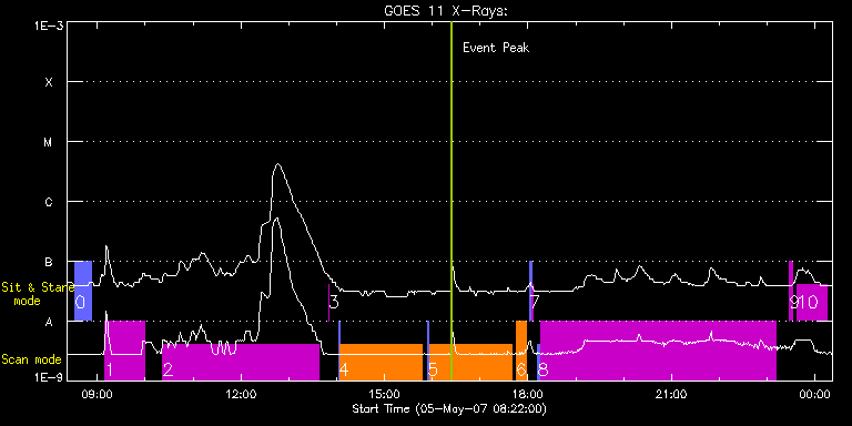 EIS Observation timeline overlay to GOES-Xray curve Code 1" 2" 40" 266" EIS Observations list for this event: STUDY ACRONYM ID DATE OBSERVED DESCRIPTION NOAA# TARGET 0 cam_artb_cds_b | 2551 | 2007/05/05 08:31:49 | Active Region Transient Brightenings ( | | Active Region TIMELINE ID DATE OBSERVED FITS FILE XCEN (+W/-E) YCEN (+N/-S) DUR ----------------------------------------------------------------------------------------------------------------- 2551 | 2007/05/05 08:31:49.000 | eis_l0_20070505_083149.fits.gz | 706.37 | 315.19 | 21m10s 1 TW_AR111 | 2552 | 2007/05/05 09:09:49 | TW active regio iron study | | Active Region TIMELINE ID DATE OBSERVED FITS FILE XCEN (+W/-E) YCEN (+N/-S) DUR ----------------------------------------------------------------------------------------------------------------- 2552 | 2007/05/05 09:09:49.000 | eis_l0_20070505_090949.fits.gz | 714.21 | 332.86 | 49m23s 2 SYNOP002 | 2553 | 2007/05/05 10:22:14 | SYNOP002 | | Quiet Sun TIMELINE ID DATE OBSERVED FITS FILE XCEN (+W/-E) YCEN (+N/-S) DUR ----------------------------------------------------------------------------------------------------------------- 2553 | 2007/05/05 10:22:14.000 | eis_l0_20070505_102214.fits.gz | 38.99 | 138.14 | 3h15m21s 3 regcal014 | 2554 | 2007/05/05 13:50:11 | ADC offset | | Engineering TIMELINE ID DATE OBSERVED FITS FILE XCEN (+W/-E) YCEN (+N/-S) DUR ----------------------------------------------------------------------------------------------------------------- 2554 | 2007/05/05 13:50:11.000 | eis_l0_20070505_135011.fits.gz | 68.85 | 223.96 | 4 coronal_wave_study | 2555 | 2007/05/05 14:02:34 | coronal_wave_study | | Quiet Sun TIMELINE ID DATE OBSERVED FITS FILE XCEN (+W/-E) YCEN (+N/-S) DUR ----------------------------------------------------------------------------------------------------------------- 2555 | 2007/05/05 14:02:34.000 | eis_l0_20070505_140234.fits.gz | 620.02 | 348.56 | 1m34s 2555 | 2007/05/05 14:04:34.000 | eis_l0_20070505_140434.fits.gz | 606.61 | 341.91 | 1h43m8s 5 coronal_wave_study | 2556 | 2007/05/05 15:54:19 | coronal_wave_study | | Quiet Sun TIMELINE ID DATE OBSERVED FITS FILE XCEN (+W/-E) YCEN (+N/-S) DUR ----------------------------------------------------------------------------------------------------------------- 2556 | 2007/05/05 15:54:19.000 | eis_l0_20070505_155419.fits.gz | 630.25 | 353.23 | 1m34s 2556 | 2007/05/05 15:56:19.000 | eis_l0_20070505_155619.fits.gz | 616.68 | 346.40 | 1h43m7s 6 HH_AR+FLR_RAS_N03 | 2557 | 2007/05/05 17:45:12 | HH_AR+FLR_RAS_N03 (EWxNS=240"x240", 5. | | Active Region TIMELINE ID DATE OBSERVED FITS FILE XCEN (+W/-E) YCEN (+N/-S) DUR ----------------------------------------------------------------------------------------------------------------- 2557 | 2007/05/05 17:45:12.000 | eis_l0_20070505_174512.fits.gz | 760.78 | 349.93 | 13m8s 7 SYNOP001 | 2558 | 2007/05/05 18:02:20 | SYNOP001_40arcsec_1arcsec_30s_90s | | Quiet Sun TIMELINE ID DATE OBSERVED FITS FILE XCEN (+W/-E) YCEN (+N/-S) DUR ----------------------------------------------------------------------------------------------------------------- 2558 | 2007/05/05 18:02:20.000 | eis_l0_20070505_180220.fits.gz | 0.37 | 57.10 | 2m2s 2558 | 2007/05/05 18:04:36.000 | eis_l0_20070505_180436.fits.gz | 0.51 | 57.06 | 2m1s 8 AR_velocity_map | 2559 | 2007/05/05 18:12:34 | Detailed raster to produce active regi | | Active Region TIMELINE ID DATE OBSERVED FITS FILE XCEN (+W/-E) YCEN (+N/-S) DUR ----------------------------------------------------------------------------------------------------------------- 2559 | 2007/05/05 18:12:34.000 | eis_l0_20070505_181234.fits.gz | 780.40 | 389.70 | 3m33s 2559 | 2007/05/05 18:16:23.000 | eis_l0_20070505_181623.fits.gz | -52073.83 | -180.45 | 4h54m18s 9 regcal015 | 2560 | 2007/05/05 23:28:11 | Dark current, hot pixels and column de | | Engineering TIMELINE ID DATE OBSERVED FITS FILE XCEN (+W/-E) YCEN (+N/-S) DUR ----------------------------------------------------------------------------------------------------------------- 2560 | 2007/05/05 23:28:11.000 | eis_l0_20070505_232811.fits.gz | 800.89 | 436.61 | 4m24s 10 regcal016 | 2561 | 2007/05/05 23:37:11 | Dark current, hot pixels and column de | | Engineering TIMELINE ID DATE OBSERVED FITS FILE XCEN (+W/-E) YCEN (+N/-S) DUR ----------------------------------------------------------------------------------------------------------------- 2561 | 2007/05/05 23:37:11.000 | eis_l0_20070505_233711.fits.gz | 802.70 | 437.45 | 38m32s : Check study information : Download file : View thumbnails For this event, also check for: