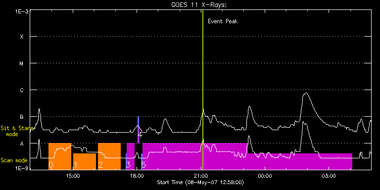 EIS Observation timeline overlay to GOES-Xray curve Code 1" 2" 40" 266" EIS Observations list for this event: STUDY ACRONYM ID DATE OBSERVED DESCRIPTION NOAA# TARGET 0 gdz_off_limb1_60 | 2595 | 2007/05/08 13:51:13 | Off limb study bottom of the ccd | | Engineering TIMELINE ID DATE OBSERVED FITS FILE XCEN (+W/-E) YCEN (+N/-S) DUR ----------------------------------------------------------------------------------------------------------------- 2595 | 2007/05/08 13:51:13.000 | eis_l0_20070508_135113.fits.gz | 985.14 | 374.45 | 1h2m51s 1 gdz_off_limb1_60 | 2596 | 2007/05/08 15:01:13 | Off limb study bottom of the ccd | | Engineering TIMELINE ID DATE OBSERVED FITS FILE XCEN (+W/-E) YCEN (+N/-S) DUR ----------------------------------------------------------------------------------------------------------------- 2596 | 2007/05/08 15:01:13.000 | eis_l0_20070508_150113.fits.gz | 985.18 | 374.42 | 1h2m52s 2 gdz_off_limb1_60 | 2597 | 2007/05/08 16:11:13 | Off limb study bottom of the ccd | | Engineering TIMELINE ID DATE OBSERVED FITS FILE XCEN (+W/-E) YCEN (+N/-S) DUR ----------------------------------------------------------------------------------------------------------------- 2597 | 2007/05/08 16:11:13.000 | eis_l0_20070508_161113.fits.gz | 985.09 | 374.42 | 1h2m52s 3 Diag_40x180_s0_30s | 2598 | 2007/05/08 17:28:20 | Detailed diagnostic study, with slot c | | Active Region TIMELINE ID DATE OBSERVED FITS FILE XCEN (+W/-E) YCEN (+N/-S) DUR ----------------------------------------------------------------------------------------------------------------- 2598 | 2007/05/08 17:28:20.000 | eis_l0_20070508_172820.fits.gz | 945.98 | 444.27 | 3m33s 2598 | 2007/05/08 17:32:09.000 | eis_l0_20070508_173209.fits.gz | 926.27 | 388.41 | 21m2s 4 SYNOP001 | 2599 | 2007/05/08 18:02:35 | SYNOP001_40arcsec_1arcsec_30s_90s | | Quiet Sun TIMELINE ID DATE OBSERVED FITS FILE XCEN (+W/-E) YCEN (+N/-S) DUR ----------------------------------------------------------------------------------------------------------------- 2599 | 2007/05/08 18:02:35.000 | eis_l0_20070508_180235.fits.gz | 0.35 | 57.13 | 2m1s 2599 | 2007/05/08 18:04:50.000 | eis_l0_20070508_180450.fits.gz | 0.43 | 57.10 | 2m1s 5 AR_velocity_map | 2600 | 2007/05/08 18:12:35 | Detailed raster to produce active regi | | Active Region TIMELINE ID DATE OBSERVED FITS FILE XCEN (+W/-E) YCEN (+N/-S) DUR ----------------------------------------------------------------------------------------------------------------- 2600 | 2007/05/08 18:12:35.000 | eis_l0_20070508_181235.fits.gz | 946.17 | 444.31 | 3m33s 2600 | 2007/05/08 18:16:24.000 | eis_l0_20070508_181624.fits.gz | 928.61 | 421.58 | 4h54m20s 2600 | 2007/05/08 23:10:59.000 | eis_l0_20070508_231059.fits.gz | 928.61 | 421.54 | 4h54m17s : Check study information : Download file : View thumbnails For this event, also check for: