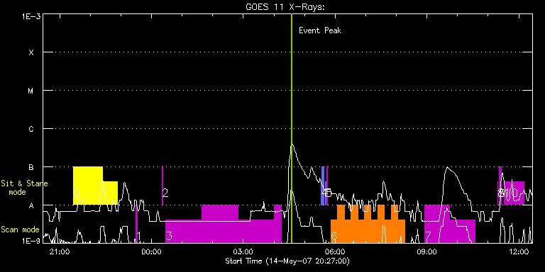 EIS Observation timeline overlay to GOES-Xray curve Code 1" 2" 40" 266" EIS Observations list for this event: STUDY ACRONYM ID DATE OBSERVED DESCRIPTION NOAA# TARGET 0 HPW014_SLOT266_MOVIE | 2698 | 2007/05/14 21:27:20 | HPW014_SLOT266_MOVIE | 955 | Active Region TIMELINE ID DATE OBSERVED FITS FILE XCEN (+W/-E) YCEN (+N/-S) DUR ----------------------------------------------------------------------------------------------------------------- 2698 | 2007/05/14 21:27:20.000 | eis_l0_20070514_212720.fits.gz | 676.82 | 374.15 | 56m18s 2698 | 2007/05/14 22:23:42.000 | eis_l0_20070514_222342.fits.gz | 681.47 | -184.19 | 29m33s 1 TW_AR110 | 2699 | 2007/05/14 23:28:34 | TW; active region study (1) | | Active Region TIMELINE ID DATE OBSERVED FITS FILE XCEN (+W/-E) YCEN (+N/-S) DUR ----------------------------------------------------------------------------------------------------------------- 2699 | 2007/05/14 23:28:34.000 | eis_l0_20070514_232834.fits.gz | 740.27 | -184.65 | 3m34s 2 SYNOP001 | 2700 | 2007/05/15 00:20:20 | SYNOP001_40arcsec_1arcsec_30s_90s | | Quiet Sun TIMELINE ID DATE OBSERVED FITS FILE XCEN (+W/-E) YCEN (+N/-S) DUR ----------------------------------------------------------------------------------------------------------------- 2700 | 2007/05/15 00:20:20.000 | eis_l0_20070515_002020.fits.gz | 0.42 | 57.06 | 2m1s 3 GAD001_AR_rast | 2701 | 2007/05/15 00:27:43 | GAD001_AR_rast | 955 | Active Region TIMELINE ID DATE OBSERVED FITS FILE XCEN (+W/-E) YCEN (+N/-S) DUR ----------------------------------------------------------------------------------------------------------------- 2701 | 2007/05/15 00:27:43.000 | eis_l0_20070515_002743.fits.gz | 690.95 | 316.69 | 1h10m41s 2701 | 2007/05/15 01:38:27.000 | eis_l0_20070515_013827.fits.gz | 698.40 | 320.27 | 1h10m40s 2701 | 2007/05/15 02:49:10.000 | eis_l0_20070515_024910.fits.gz | 705.71 | 323.62 | 1h10m42s 2701 | 2007/05/15 03:59:54.000 | eis_l0_20070515_035954.fits.gz | 810.46 | -186.39 | 15m11s 4 IUU_SLOT_cntxt_AR_01 | 2702 | 2007/05/15 05:32:46 | Active Region context SLOT images. | | Active Region TIMELINE ID DATE OBSERVED FITS FILE XCEN (+W/-E) YCEN (+N/-S) DUR ----------------------------------------------------------------------------------------------------------------- 2702 | 2007/05/15 05:32:46.000 | eis_l0_20070515_053246.fits.gz | 691.40 | 379.97 | 1m7s 2702 | 2007/05/15 05:34:05.000 | eis_l0_20070515_053405.fits.gz | 691.54 | 380.04 | 1m7s 2702 | 2007/05/15 05:35:23.000 | eis_l0_20070515_053523.fits.gz | 691.59 | 380.06 | 1m7s 2702 | 2007/05/15 05:36:42.000 | eis_l0_20070515_053642.fits.gz | 691.73 | 380.17 | 1m7s 5 SYNOP001 | 2703 | 2007/05/15 05:41:13 | SYNOP001_40arcsec_1arcsec_30s_90s | | Quiet Sun TIMELINE ID DATE OBSERVED FITS FILE XCEN (+W/-E) YCEN (+N/-S) DUR ----------------------------------------------------------------------------------------------------------------- 2703 | 2007/05/15 05:41:13.000 | eis_l0_20070515_054113.fits.gz | 0.39 | 57.05 | 2m1s 2703 | 2007/05/15 05:43:28.000 | eis_l0_20070515_054328.fits.gz | 0.40 | 57.09 | 2m2s 6 HH_AR+FLR_RAS_N03 | 2704 | 2007/05/15 05:51:27 | HH_AR+FLR_RAS_N03 (EWxNS=240"x240", 5. | | Active Region TIMELINE ID DATE OBSERVED FITS FILE XCEN (+W/-E) YCEN (+N/-S) DUR ----------------------------------------------------------------------------------------------------------------- 2704 | 2007/05/15 05:51:27.000 | eis_l0_20070515_055127.fits.gz | 730.08 | 340.81 | 13m7s 2704 | 2007/05/15 06:04:37.000 | eis_l0_20070515_060437.fits.gz | 731.40 | 341.43 | 13m6s 2704 | 2007/05/15 06:17:46.000 | eis_l0_20070515_061746.fits.gz | 732.69 | 342.03 | 13m7s 2704 | 2007/05/15 06:30:56.000 | eis_l0_20070515_063056.fits.gz | 734.67 | 342.91 | 13m7s 2704 | 2007/05/15 06:44:06.000 | eis_l0_20070515_064406.fits.gz | 735.24 | 339.66 | 13m8s 2704 | 2007/05/15 06:57:17.000 | eis_l0_20070515_065717.fits.gz | 736.64 | 343.88 | 13m6s 2704 | 2007/05/15 07:10:26.000 | eis_l0_20070515_071026.fits.gz | 737.94 | 344.47 | 13m8s 2704 | 2007/05/15 07:23:36.000 | eis_l0_20070515_072336.fits.gz | 739.20 | 345.06 | 13m6s 2704 | 2007/05/15 07:36:45.000 | eis_l0_20070515_073645.fits.gz | 740.62 | 345.77 | 13m7s 2704 | 2007/05/15 07:49:55.000 | eis_l0_20070515_074955.fits.gz | 741.83 | 346.34 | 13m7s 2704 | 2007/05/15 08:03:05.000 | eis_l0_20070515_080305.fits.gz | 743.18 | 346.91 | 13m6s 7 TW_AR111 | 2705 | 2007/05/15 08:55:27 | TW active regio iron study | | Active Region TIMELINE ID DATE OBSERVED FITS FILE XCEN (+W/-E) YCEN (+N/-S) DUR ----------------------------------------------------------------------------------------------------------------- 2705 | 2007/05/15 08:55:27.000 | eis_l0_20070515_085527.fits.gz | 744.27 | 343.27 | 49m23s 2705 | 2007/05/15 09:44:53.000 | eis_l0_20070515_094453.fits.gz | 748.97 | 345.50 | 49m23s 8 regcal014 | 2706 | 2007/05/15 11:18:41 | ADC offset | | Engineering TIMELINE ID DATE OBSERVED FITS FILE XCEN (+W/-E) YCEN (+N/-S) DUR ----------------------------------------------------------------------------------------------------------------- 2706 | 2007/05/15 11:18:41.000 | eis_l0_20070515_111841.fits.gz | 738.51 | 397.54 | 9 regcal015 | 2707 | 2007/05/15 11:21:11 | Dark current, hot pixels and column de | | Engineering TIMELINE ID DATE OBSERVED FITS FILE XCEN (+W/-E) YCEN (+N/-S) DUR ----------------------------------------------------------------------------------------------------------------- 2707 | 2007/05/15 11:21:11.000 | eis_l0_20070515_112111.fits.gz | 738.90 | 397.74 | 4m25s 10 regcal016 | 2708 | 2007/05/15 11:31:11 | Dark current, hot pixels and column de | | Engineering TIMELINE ID DATE OBSERVED FITS FILE XCEN (+W/-E) YCEN (+N/-S) DUR ----------------------------------------------------------------------------------------------------------------- 2708 | 2007/05/15 11:31:11.000 | eis_l0_20070515_113111.fits.gz | 378.69 | 217.60 | 38m32s : Check study information : Download file : View thumbnails For this event, also check for: