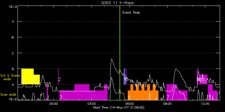 EIS Observation timeline overlay to GOES-Xray curve Code 1" 2" 40" 266" EIS Observations list for this event: STUDY ACRONYM ID DATE OBSERVED DESCRIPTION NOAA# TARGET 0 HPW014_SLOT266_MOVIE | 2698 | 2007/05/14 21:27:20 | HPW014_SLOT266_MOVIE | 955 | Active Region TIMELINE ID DATE OBSERVED FITS FILE XCEN (+W/-E) YCEN (+N/-S) DUR ----------------------------------------------------------------------------------------------------------------- 2698 | 2007/05/14 21:27:20.000 | eis_l0_20070514_212720.fits.gz | 676.82 | 374.15 | 56m18s 2698 | 2007/05/14 22:23:42.000 | eis_l0_20070514_222342.fits.gz | 681.47 | -184.19 | 29m33s 1 TW_AR110 | 2699 | 2007/05/14 23:28:34 | TW; active region study (1) | | Active Region TIMELINE ID DATE OBSERVED FITS FILE XCEN (+W/-E) YCEN (+N/-S) DUR ----------------------------------------------------------------------------------------------------------------- 2699 | 2007/05/14 23:28:34.000 | eis_l0_20070514_232834.fits.gz | 740.27 | -184.65 | 3m34s 2 SYNOP001 | 2700 | 2007/05/15 00:20:20 | SYNOP001_40arcsec_1arcsec_30s_90s | | Quiet Sun TIMELINE ID DATE OBSERVED FITS FILE XCEN (+W/-E) YCEN (+N/-S) DUR ----------------------------------------------------------------------------------------------------------------- 2700 | 2007/05/15 00:20:20.000 | eis_l0_20070515_002020.fits.gz | 0.42 | 57.06 | 2m1s 3 GAD001_AR_rast | 2701 | 2007/05/15 00:27:43 | GAD001_AR_rast | 955 | Active Region TIMELINE ID DATE OBSERVED FITS FILE XCEN (+W/-E) YCEN (+N/-S) DUR ----------------------------------------------------------------------------------------------------------------- 2701 | 2007/05/15 00:27:43.000 | eis_l0_20070515_002743.fits.gz | 690.95 | 316.69 | 1h10m41s 2701 | 2007/05/15 01:38:27.000 | eis_l0_20070515_013827.fits.gz | 698.40 | 320.27 | 1h10m40s 2701 | 2007/05/15 02:49:10.000 | eis_l0_20070515_024910.fits.gz | 705.71 | 323.62 | 1h10m42s 2701 | 2007/05/15 03:59:54.000 | eis_l0_20070515_035954.fits.gz | 810.46 | -186.39 | 15m11s 4 IUU_SLOT_cntxt_AR_01 | 2702 | 2007/05/15 05:32:46 | Active Region context SLOT images. | | Active Region TIMELINE ID DATE OBSERVED FITS FILE XCEN (+W/-E) YCEN (+N/-S) DUR ----------------------------------------------------------------------------------------------------------------- 2702 | 2007/05/15 05:32:46.000 | eis_l0_20070515_053246.fits.gz | 691.40 | 379.97 | 1m7s 2702 | 2007/05/15 05:34:05.000 | eis_l0_20070515_053405.fits.gz | 691.54 | 380.04 | 1m7s 2702 | 2007/05/15 05:35:23.000 | eis_l0_20070515_053523.fits.gz | 691.59 | 380.06 | 1m7s 2702 | 2007/05/15 05:36:42.000 | eis_l0_20070515_053642.fits.gz | 691.73 | 380.17 | 1m7s 5 SYNOP001 | 2703 | 2007/05/15 05:41:13 | SYNOP001_40arcsec_1arcsec_30s_90s | | Quiet Sun TIMELINE ID DATE OBSERVED FITS FILE XCEN (+W/-E) YCEN (+N/-S) DUR ----------------------------------------------------------------------------------------------------------------- 2703 | 2007/05/15 05:41:13.000 | eis_l0_20070515_054113.fits.gz | 0.39 | 57.05 | 2m1s 2703 | 2007/05/15 05:43:28.000 | eis_l0_20070515_054328.fits.gz | 0.40 | 57.09 | 2m2s 6 HH_AR+FLR_RAS_N03 | 2704 | 2007/05/15 05:51:27 | HH_AR+FLR_RAS_N03 (EWxNS=240"x240", 5. | | Active Region TIMELINE ID DATE OBSERVED FITS FILE XCEN (+W/-E) YCEN (+N/-S) DUR ----------------------------------------------------------------------------------------------------------------- 2704 | 2007/05/15 05:51:27.000 | eis_l0_20070515_055127.fits.gz | 730.08 | 340.81 | 13m7s 2704 | 2007/05/15 06:04:37.000 | eis_l0_20070515_060437.fits.gz | 731.40 | 341.43 | 13m6s 2704 | 2007/05/15 06:17:46.000 | eis_l0_20070515_061746.fits.gz | 732.69 | 342.03 | 13m7s 2704 | 2007/05/15 06:30:56.000 | eis_l0_20070515_063056.fits.gz | 734.67 | 342.91 | 13m7s 2704 | 2007/05/15 06:44:06.000 | eis_l0_20070515_064406.fits.gz | 735.24 | 339.66 | 13m8s 2704 | 2007/05/15 06:57:17.000 | eis_l0_20070515_065717.fits.gz | 736.64 | 343.88 | 13m6s 2704 | 2007/05/15 07:10:26.000 | eis_l0_20070515_071026.fits.gz | 737.94 | 344.47 | 13m8s 2704 | 2007/05/15 07:23:36.000 | eis_l0_20070515_072336.fits.gz | 739.20 | 345.06 | 13m6s 2704 | 2007/05/15 07:36:45.000 | eis_l0_20070515_073645.fits.gz | 740.62 | 345.77 | 13m7s 2704 | 2007/05/15 07:49:55.000 | eis_l0_20070515_074955.fits.gz | 741.83 | 346.34 | 13m7s 2704 | 2007/05/15 08:03:05.000 | eis_l0_20070515_080305.fits.gz | 743.18 | 346.91 | 13m6s 7 TW_AR111 | 2705 | 2007/05/15 08:55:27 | TW active regio iron study | | Active Region TIMELINE ID DATE OBSERVED FITS FILE XCEN (+W/-E) YCEN (+N/-S) DUR ----------------------------------------------------------------------------------------------------------------- 2705 | 2007/05/15 08:55:27.000 | eis_l0_20070515_085527.fits.gz | 744.27 | 343.27 | 49m23s 2705 | 2007/05/15 09:44:53.000 | eis_l0_20070515_094453.fits.gz | 748.97 | 345.50 | 49m23s 8 regcal014 | 2706 | 2007/05/15 11:18:41 | ADC offset | | Engineering TIMELINE ID DATE OBSERVED FITS FILE XCEN (+W/-E) YCEN (+N/-S) DUR ----------------------------------------------------------------------------------------------------------------- 2706 | 2007/05/15 11:18:41.000 | eis_l0_20070515_111841.fits.gz | 738.51 | 397.54 | 9 regcal015 | 2707 | 2007/05/15 11:21:11 | Dark current, hot pixels and column de | | Engineering TIMELINE ID DATE OBSERVED FITS FILE XCEN (+W/-E) YCEN (+N/-S) DUR ----------------------------------------------------------------------------------------------------------------- 2707 | 2007/05/15 11:21:11.000 | eis_l0_20070515_112111.fits.gz | 738.90 | 397.74 | 4m25s 10 regcal016 | 2708 | 2007/05/15 11:31:11 | Dark current, hot pixels and column de | | Engineering TIMELINE ID DATE OBSERVED FITS FILE XCEN (+W/-E) YCEN (+N/-S) DUR ----------------------------------------------------------------------------------------------------------------- 2708 | 2007/05/15 11:31:11.000 | eis_l0_20070515_113111.fits.gz | 378.69 | 217.60 | 38m32s 11 HPW013_AR_RAS_23m | 2709 | 2007/05/15 12:13:16 | HPW013_AR_RAS_23m | | Active Region TIMELINE ID DATE OBSERVED FITS FILE XCEN (+W/-E) YC