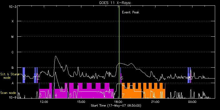 EIS Observation timeline overlay to GOES-Xray curve Code 1" 2" 40" 266" EIS Observations list for this event: STUDY ACRONYM ID DATE OBSERVED DESCRIPTION NOAA# TARGET 0 IUU_SLOT_cntxt_AR_01 | 2736 | 2007/05/17 10:16:34 | Active Region context SLOT images. | | Active Region TIMELINE ID DATE OBSERVED FITS FILE XCEN (+W/-E) YCEN (+N/-S) DUR ----------------------------------------------------------------------------------------------------------------- 2736 | 2007/05/17 10:16:34.000 | eis_l0_20070517_101634.fits.gz | -452.26 | -90.24 | 1m7s 2736 | 2007/05/17 10:17:53.000 | eis_l0_20070517_101753.fits.gz | -452.00 | -90.13 | 1m7s 2736 | 2007/05/17 10:19:11.000 | eis_l0_20070517_101911.fits.gz | -451.83 | -90.09 | 1m7s 2736 | 2007/05/17 10:20:30.000 | eis_l0_20070517_102030.fits.gz | -451.65 | -89.98 | 1m7s 2736 | 2007/05/17 10:21:49.000 | eis_l0_20070517_102149.fits.gz | -451.49 | -89.86 | 1m7s 2736 | 2007/05/17 10:23:08.000 | eis_l0_20070517_102308.fits.gz | -451.29 | -89.81 | 1m7s 2736 | 2007/05/17 10:24:26.000 | eis_l0_20070517_102426.fits.gz | -451.16 | -89.67 | 1m7s 1 IUU_SLOT_cntxt_AR_01 | 2737 | 2007/05/17 11:11:43 | Active Region context SLOT images. | | Active Region TIMELINE ID DATE OBSERVED FITS FILE XCEN (+W/-E) YCEN (+N/-S) DUR ----------------------------------------------------------------------------------------------------------------- 2737 | 2007/05/17 11:11:43.000 | eis_l0_20070517_111143.fits.gz | -445.00 | -86.56 | 1m7s 2737 | 2007/05/17 11:13:02.000 | eis_l0_20070517_111302.fits.gz | -444.81 | -86.45 | 1m7s 2737 | 2007/05/17 11:14:21.000 | eis_l0_20070517_111421.fits.gz | -444.66 | -86.34 | 1m6s 2737 | 2007/05/17 11:15:39.000 | eis_l0_20070517_111539.fits.gz | -444.37 | -86.21 | 1m7s 2737 | 2007/05/17 11:16:58.000 | eis_l0_20070517_111658.fits.gz | -444.30 | -85.96 | 1m7s 2737 | 2007/05/17 11:18:17.000 | eis_l0_20070517_111817.fits.gz | -444.08 | -85.95 | 1m7s 2737 | 2007/05/17 11:19:36.000 | eis_l0_20070517_111936.fits.gz | -443.81 | -85.92 | 1m7s 2 SYNOP001 | 2738 | 2007/05/17 11:24:43 | SYNOP001_40arcsec_1arcsec_30s_90s | | Quiet Sun TIMELINE ID DATE OBSERVED FITS FILE XCEN (+W/-E) YCEN (+N/-S) DUR ----------------------------------------------------------------------------------------------------------------- 2738 | 2007/05/17 11:24:43.000 | eis_l0_20070517_112443.fits.gz | 0.46 | 57.10 | 2m2s 2738 | 2007/05/17 11:26:58.000 | eis_l0_20070517_112658.fits.gz | 0.49 | 57.12 | 2m2s 3 COMSCI_AR2 | 2739 | 2007/05/17 11:35:05 | Active Region Scan for Global Changes | | Active Region TIMELINE ID DATE OBSERVED FITS FILE XCEN (+W/-E) YCEN (+N/-S) DUR ----------------------------------------------------------------------------------------------------------------- 2739 | 2007/05/17 11:35:05.000 | eis_l0_20070517_113505.fits.gz | -421.58 | -129.23 | 1m7s 2739 | 2007/05/17 11:36:23.000 | eis_l0_20070517_113623.fits.gz | -437.49 | -136.84 | 49m25s 2739 | 2007/05/17 12:25:50.000 | eis_l0_20070517_122550.fits.gz | -433.28 | -135.21 | 11m34s 2739 | 2007/05/17 12:37:49.000 | eis_l0_20070517_123749.fits.gz | -412.89 | -124.53 | 1m8s 4 COMSCI_AR2 | 2740 | 2007/05/17 12:50:13 | Active Region Scan for Global Changes | | Active Region TIMELINE ID DATE OBSERVED FITS FILE XCEN (+W/-E) YCEN (+N/-S) DUR ----------------------------------------------------------------------------------------------------------------- 2740 | 2007/05/17 12:50:13.000 | eis_l0_20070517_125013.fits.gz | -411.27 | -124.08 | 1m8s 2740 | 2007/05/17 12:51:32.000 | eis_l0_20070517_125132.fits.gz | -427.23 | -132.07 | 49m23s 2740 | 2007/05/17 13:40:58.000 | eis_l0_20070517_134058.fits.gz | -422.98 | -129.44 | 11m34s 2740 | 2007/05/17 13:52:57.000 | eis_l0_20070517_135257.fits.gz | -402.62 | -119.25 | 1m8s 5 HPW013_AR_RAS_23m | 2741 | 2007/05/17 14:01:20 | HPW013_AR_RAS_23m | | Active Region TIMELINE ID DATE OBSERVED FITS FILE XCEN (+W/-E) YCEN (+N/-S) DUR ----------------------------------------------------------------------------------------------------------------- 2741 | 2007/05/17 14:01:20.000 | eis_l0_20070517_140120.fits.gz | -419.54 | -102.15 | 21m37s 2741 | 2007/05/17 14:23:01.000 | eis_l0_20070517_142301.fits.gz | -416.49 | -100.67 | 21m37s 2741 | 2007/05/17 14:44:42.000 | eis_l0_20070517_144442.fits.gz | -413.51 | -99.10 | 21m36s 2741 | 2007/05/17 15:06:22.000 | eis_l0_20070517_150622.fits.gz | -410.54 | -97.61 | 21m37s 2741 | 2007/05/17 15:28:02.000 | eis_l0_20070517_152802.fits.gz | -407.53 | -96.04 | 21m37s 2741 | 2007/05/17 15:49:43.000 | eis_l0_20070517_154943.fits.gz | -404.47 | -94.54 | 21m37s 2741 | 2007/05/17 16:11:23.000 | eis_l0_20070517_161123.fits.gz | -401.44 | -93.08 | 21m37s 2741 | 2007/05/17 16:33:04.000 | eis_l0_20070517_163304.fits.gz | -398.45 | -91.49 | 21m36s 2741 | 2007/05/17 16:54:44.000 | eis_l0_20070517_165444.fits.gz | -395.42 | -89.98 | 21m37s 2741 | 2007/05/17 17:16:25.000 | eis_l0_20070517_171625.fits.gz | -392.38 | -88.48 | 21m36s 6 SYNOP001 | 2742 | 2007/05/17 18:10:34 | SYNOP001_40arcsec_1arcsec_30s_90s | | Quiet Sun TIMELINE ID DATE OBSERVED FITS FILE XCEN (+W/-E) YCEN (+N/-S) DUR ----------------------------------------------------------------------------------------------------------------- 2742 | 2007/05/17 18:10:34.000 | eis_l0_20070517_181034.fits.gz | 0.54 | 57.12 | 2m1s 2742 | 2007/05/17 18:12:49.000 | eis_l0_20070517_181249.fits.gz | 0.47 | 57.12 | 2m2s 7 HH_AR+FLR_RAS_N03 | 2743 | 2007/05/17 18:17:27 | HH_AR+FLR_RAS_N03 (EWxNS=240"x240", 5. | | Active Region TIMELINE ID DATE OBSERVED FITS FILE XCEN (+W/-E) YCEN (+N/-S) DUR ----------------------------------------------------------------------------------------------------------------- 2743 | 2007/05/17 18:17:27.000 | eis_l0_20070517_181727.fits.gz | -383.84 | -114.07 | 13m7s 2743 | 2007/05/17 18:30:37.000 | eis_l0_20070517_183037.fits.gz | -382.01 | -113.20 | 13m6s 2743 | 2007/05/17 18:43:46.000 | eis_l0_20070517_184346.fits.gz | -380.20 | -112.29 | 13m8s 2743 | 2007/05/17 18:56:57.000 | eis_l0_20070517_185657.fits.gz | -