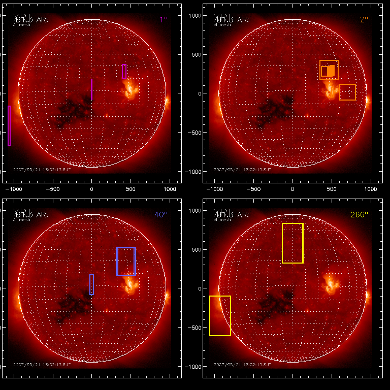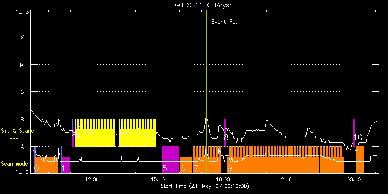 EIS Observation timeline overlay to GOES-Xray curve Code 1" 2" 40" 266" EIS Observations list for this event: STUDY ACRONYM ID DATE OBSERVED DESCRIPTION NOAA# TARGET 0 AR_spectral_atlas_3 | 2791 | 2007/05/21 09:20:19 | Spectral Atlas 3, with slot context ra | | Active Region TIMELINE ID DATE OBSERVED FITS FILE XCEN (+W/-E) YCEN (+N/-S) DUR ----------------------------------------------------------------------------------------------------------------- 2791 | 2007/05/21 09:20:19.000 | eis_l0_20070521_092019.fits.gz | 447.77 | 337.20 | 3m32s 2791 | 2007/05/21 09:24:22.000 | eis_l0_20070521_092422.fits.gz | 433.73 | 279.20 | 1h1m14s 1 Diag_40x180_s0_30s | 2794 | 2007/05/21 10:33:20 | Detailed diagnostic study, with slot c | | Active Region TIMELINE ID DATE OBSERVED FITS FILE XCEN (+W/-E) YCEN (+N/-S) DUR ----------------------------------------------------------------------------------------------------------------- 2794 | 2007/05/21 10:33:20.000 | eis_l0_20070521_103320.fits.gz | 430.66 | 342.58 | 3m33s 2794 | 2007/05/21 10:37:10.000 | eis_l0_20070521_103710.fits.gz | 417.00 | 281.72 | 21m1s 2 SYNOP001 | 2795 | 2007/05/21 11:03:35 | SYNOP001_40arcsec_1arcsec_30s_90s | | Quiet Sun TIMELINE ID DATE OBSERVED FITS FILE XCEN (+W/-E) YCEN (+N/-S) DUR ----------------------------------------------------------------------------------------------------------------- 2795 | 2007/05/21 11:03:35.000 | eis_l0_20070521_110335.fits.gz | 0.45 | 45.53 | 2m1s 2795 | 2007/05/21 11:05:50.000 | eis_l0_20070521_110550.fits.gz | 0.41 | 45.58 | 2m2s 3 Alignment_266 | 2796 | 2007/05/21 11:13:21 | Alignment slot 266 | | Quiet Sun TIMELINE ID DATE OBSERVED FITS FILE XCEN (+W/-E) YCEN (+N/-S) DUR ----------------------------------------------------------------------------------------------------------------- 2796 | 2007/05/21 11:13:21.000 | eis_l0_20070521_111321.fits.gz | 0.42 | 574.55 | 1m22s 2796 | 2007/05/21 11:15:25.000 | eis_l0_20070521_111525.fits.gz | 0.39 | 574.51 | 1m22s 2796 | 2007/05/21 11:17:28.000 | eis_l0_20070521_111728.fits.gz | 0.39 | 574.46 | 1m22s 2796 | 2007/05/21 11:19:32.000 | eis_l0_20070521_111932.fits.gz | 0.48 | 574.51 | 1m22s 2796 | 2007/05/21 11:21:36.000 | eis_l0_20070521_112136.fits.gz | 0.44 | 574.52 | 1m22s 2796 | 2007/05/21 11:23:40.000 | eis_l0_20070521_112340.fits.gz | 0.41 | 574.51 | 1m22s 2796 | 2007/05/21 11:25:43.000 | eis_l0_20070521_112543.fits.gz | 0.45 | 574.52 | 1m23s 2796 | 2007/05/21 11:27:47.000 | eis_l0_20070521_112747.fits.gz | 0.47 | 574.62 | 1m22s 2796 | 2007/05/21 11:29:51.000 | eis_l0_20070521_112951.fits.gz | 0.47 | 574.54 | 1m22s 2796 | 2007/05/21 11:31:55.000 | eis_l0_20070521_113155.fits.gz | 0.42 | 574.52 | 1m22s 2796 | 2007/05/21 11:33:59.000 | eis_l0_20070521_113359.fits.gz | 0.50 | 574.51 | 1m22s 2796 | 2007/05/21 11:36:03.000 | eis_l0_20070521_113603.fits.gz | 0.44 | 574.50 | 1m21s 2796 | 2007/05/21 11:38:06.000 | eis_l0_20070521_113806.fits.gz | 0.49 | 574.51 | 1m22s 2796 | 2007/05/21 11:40:10.000 | eis_l0_20070521_114010.fits.gz | 0.40 | 574.51 | 1m22s 2796 | 2007/05/21 11:42:14.000 | eis_l0_20070521_114214.fits.gz | 0.48 | 574.54 | 1m22s 2796 | 2007/05/21 11:44:18.000 | eis_l0_20070521_114418.fits.gz | 0.40 | 574.51 | 1m22s 2796 | 2007/05/21 11:46:21.000 | eis_l0_20070521_114621.fits.gz | 0.43 | 574.52 | 1m22s 2796 | 2007/05/21 11:48:25.000 | eis_l0_20070521_114825.fits.gz | 0.40 | 574.56 | 1m22s 2796 | 2007/05/21 11:50:29.000 | eis_l0_20070521_115029.fits.gz | 0.41 | 574.47 | 1m22s 2796 | 2007/05/21 11:52:33.000 | eis_l0_20070521_115233.fits.gz | 0.46 | 574.52 | 1m22s 2796 | 2007/05/21 11:54:36.000 | eis_l0_20070521_115436.fits.gz | 0.42 | 574.47 | 1m23s 2796 | 2007/05/21 11:56:41.000 | eis_l0_20070521_115641.fits.gz | 0.48 | 574.53 | 1m21s 2796 | 2007/05/21 11:58:44.000 | eis_l0_20070521_115844.fits.gz | 0.39 | 574.50 | 1m22s 2796 | 2007/05/21 12:00:48.000 | eis_l0_20070521_120048.fits.gz | 0.47 | 574.49 | 1m22s 2796 | 2007/05/21 12:02:52.000 | eis_l0_20070521_120252.fits.gz | 0.48 | 574.47 | 1m22s 2796 | 2007/05/21 12:04:56.000 | eis_l0_20070521_120456.fits.gz | 0.40 | 574.50 | 1m22s 2796 | 2007/05/21 12:06:59.000 | eis_l0_20070521_120659.fits.gz | 0.40 | 574.46 | 1m22s 2796 | 2007/05/21 12:09:03.000 | eis_l0_20070521_120903.fits.gz | 0.38 | 574.52 | 1m22s 2796 | 2007/05/21 12:11:07.000 | eis_l0_20070521_121107.fits.gz | 0.46 | 574.48 | 1m22s 2796 | 2007/05/21 12:13:11.000 | eis_l0_20070521_121311.fits.gz | 0.46 | 574.52 | 1m22s 2796 | 2007/05/21 12:15:14.000 | eis_l0_20070521_121514.fits.gz | 0.45 | 574.53 | 1m23s 2796 | 2007/05/21 12:17:18.000 | eis_l0_20070521_121718.fits.gz | 0.49 | 574.53 | 1m22s 2796 | 2007/05/21 12:19:22.000 | eis_l0_20070521_121922.fits.gz | 0.48 | 574.54 | 1m22s 2796 | 2007/05/21 12:21:26.000 | eis_l0_20070521_122126.fits.gz | 0.44 | 574.48 | 1m22s 2796 | 2007/05/21 12:23:30.000 | eis_l0_20070521_122330.fits.gz | 0.44 | 574.52 | 1m22s 2796 | 2007/05/21 12:25:33.000 | eis_l0_20070521_122533.fits.gz | 0.44 | 574.49 | 1m22s 2796 | 2007/05/21 12:27:37.000 | eis_l0_20070521_122737.fits.gz | 0.40 | 574.52 | 1m22s 2796 | 2007/05/21 12:29:41.000 | eis_l0_20070521_122941.fits.gz | 0.51 | 574.45 | 1m22s 2796 | 2007/05/21 12:31:45.000 | eis_l0_20070521_123145.fits.gz | 0.42 | 574.53 | 1m22s 2796 | 2007/05/21 12:33:49.000 | eis_l0_20070521_123349.fits.gz | 0.44 | 574.46 | 1m22s 2796 | 2007/05/21 12:35:52.000 | eis_l0_20070521_123552.fits.gz | 0.44 | 574.51 | 1m22s 2796 | 2007/05/21 12:37:56.000 | eis_l0_20070521_123756.fits.gz | 0.47 | 574.49 | 1m22s 2796 | 2007/05/21 12:40:00.000 | eis_l0_20070521_124000.fits.gz | 0.37 | 574.49 | 1m22s 2796 | 2007/05/21 12:42:04.000 | eis_l0_20070521_124204.fits.gz | 0.43 | 574.52 | 1m22s 2796 | 2007/05/21 12:44:07.000 | eis_l0_20070521_124407.fits.gz | 0.43 | 574.52 | 1m23s 2796 | 2007/05/21 12:46:11.000 | eis_l0_20070521_124611.fits.gz | 0.40 | 574.50 | 1m22s 2796 | 2007/05/21 12:48:15.000 | eis_l0_20070521_124815.fits.gz | 0.44 | 574.49 | 1m22s 2796 | 2007/05/21 12:50:19.000 | eis_l0_20070521_125019