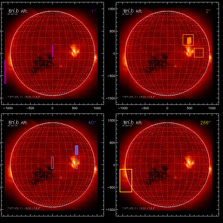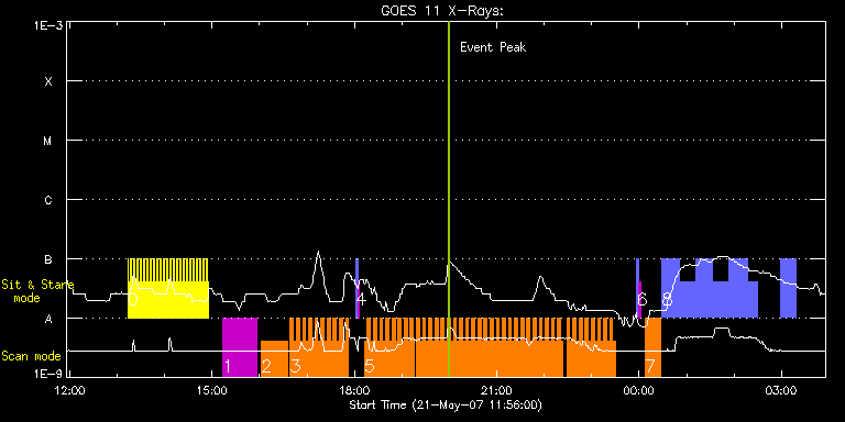 EIS Observation timeline overlay to GOES-Xray curve Code 1" 2" 40" 266" EIS Observations list for this event: STUDY ACRONYM ID DATE OBSERVED DESCRIPTION NOAA# TARGET 0 Alignment_266 | 2797 | 2007/05/21 13:13:13 | Alignment slot 266 | | Quiet Sun TIMELINE ID DATE OBSERVED FITS FILE XCEN (+W/-E) YCEN (+N/-S) DUR ----------------------------------------------------------------------------------------------------------------- 2797 | 2007/05/21 13:13:13.000 | eis_l0_20070521_131313.fits.gz | -929.35 | -355.20 | 1m22s 2797 | 2007/05/21 13:15:17.000 | eis_l0_20070521_131517.fits.gz | -929.31 | -355.27 | 1m22s 2797 | 2007/05/21 13:17:21.000 | eis_l0_20070521_131721.fits.gz | -929.35 | -355.27 | 1m22s 2797 | 2007/05/21 13:19:25.000 | eis_l0_20070521_131925.fits.gz | -929.42 | -355.29 | 1m22s 2797 | 2007/05/21 13:21:29.000 | eis_l0_20070521_132129.fits.gz | -929.41 | -355.31 | 1m22s 2797 | 2007/05/21 13:23:32.000 | eis_l0_20070521_132332.fits.gz | -929.38 | -355.34 | 1m22s 2797 | 2007/05/21 13:25:36.000 | eis_l0_20070521_132536.fits.gz | -929.36 | -355.33 | 1m22s 2797 | 2007/05/21 13:27:40.000 | eis_l0_20070521_132740.fits.gz | -929.46 | -355.31 | 1m22s 2797 | 2007/05/21 13:29:44.000 | eis_l0_20070521_132944.fits.gz | -929.43 | -355.36 | 1m22s 2797 | 2007/05/21 13:31:47.000 | eis_l0_20070521_133147.fits.gz | -929.39 | -355.35 | 1m22s 2797 | 2007/05/21 13:33:51.000 | eis_l0_20070521_133351.fits.gz | -929.43 | -355.36 | 1m22s 2797 | 2007/05/21 13:35:55.000 | eis_l0_20070521_133555.fits.gz | -929.36 | -355.28 | 1m22s 2797 | 2007/05/21 13:37:59.000 | eis_l0_20070521_133759.fits.gz | -929.43 | -355.32 | 1m22s 2797 | 2007/05/21 13:40:03.000 | eis_l0_20070521_134003.fits.gz | -929.46 | -355.34 | 1m22s 2797 | 2007/05/21 13:42:06.000 | eis_l0_20070521_134206.fits.gz | -929.42 | -355.31 | 1m22s 2797 | 2007/05/21 13:44:10.000 | eis_l0_20070521_134410.fits.gz | -929.40 | -355.29 | 1m22s 2797 | 2007/05/21 13:46:14.000 | eis_l0_20070521_134614.fits.gz | -929.45 | -355.34 | 1m22s 2797 | 2007/05/21 13:48:18.000 | eis_l0_20070521_134818.fits.gz | -929.47 | -355.31 | 1m22s 2797 | 2007/05/21 13:50:22.000 | eis_l0_20070521_135022.fits.gz | -929.42 | -355.33 | 1m22s 2797 | 2007/05/21 13:52:25.000 | eis_l0_20070521_135225.fits.gz | -929.43 | -355.32 | 1m22s 2797 | 2007/05/21 13:54:29.000 | eis_l0_20070521_135429.fits.gz | -929.40 | -355.33 | 1m22s 2797 | 2007/05/21 13:56:33.000 | eis_l0_20070521_135633.fits.gz | -929.33 | -355.39 | 1m22s 2797 | 2007/05/21 13:58:37.000 | eis_l0_20070521_135837.fits.gz | -929.39 | -355.32 | 1m22s 2797 | 2007/05/21 14:00:40.000 | eis_l0_20070521_140040.fits.gz | -929.35 | -355.35 | 1m22s 2797 | 2007/05/21 14:02:44.000 | eis_l0_20070521_140244.fits.gz | -929.44 | -355.33 | 1m22s 2797 | 2007/05/21 14:04:48.000 | eis_l0_20070521_140448.fits.gz | -929.37 | -355.33 | 1m22s 2797 | 2007/05/21 14:06:52.000 | eis_l0_20070521_140652.fits.gz | -929.39 | -355.34 | 1m22s 2797 | 2007/05/21 14:08:56.000 | eis_l0_20070521_140856.fits.gz | -929.39 | -355.35 | 1m22s 2797 | 2007/05/21 14:10:59.000 | eis_l0_20070521_141059.fits.gz | -929.37 | -355.34 | 1m22s 2797 | 2007/05/21 14:13:03.000 | eis_l0_20070521_141303.fits.gz | -929.43 | -355.40 | 1m22s 2797 | 2007/05/21 14:15:07.000 | eis_l0_20070521_141507.fits.gz | -929.48 | -355.38 | 1m22s 2797 | 2007/05/21 14:17:11.000 | eis_l0_20070521_141711.fits.gz | -929.41 | -355.33 | 1m22s 2797 | 2007/05/21 14:19:14.000 | eis_l0_20070521_141914.fits.gz | -929.38 | -355.35 | 1m22s 2797 | 2007/05/21 14:21:18.000 | eis_l0_20070521_142118.fits.gz | -929.42 | -355.32 | 1m22s 2797 | 2007/05/21 14:23:22.000 | eis_l0_20070521_142322.fits.gz | -929.38 | -355.34 | 1m22s 2797 | 2007/05/21 14:25:26.000 | eis_l0_20070521_142526.fits.gz | -929.43 | -355.33 | 1m22s 2797 | 2007/05/21 14:27:29.000 | eis_l0_20070521_142729.fits.gz | -929.39 | -355.30 | 1m23s 2797 | 2007/05/21 14:29:34.000 | eis_l0_20070521_142934.fits.gz | -929.42 | -355.36 | 1m22s 2797 | 2007/05/21 14:31:37.000 | eis_l0_20070521_143137.fits.gz | -929.42 | -355.33 | 1m22s 2797 | 2007/05/21 14:33:41.000 | eis_l0_20070521_143341.fits.gz | -929.46 | -355.34 | 1m22s 2797 | 2007/05/21 14:35:45.000 | eis_l0_20070521_143545.fits.gz | -929.46 | -355.33 | 1m22s 2797 | 2007/05/21 14:37:49.000 | eis_l0_20070521_143749.fits.gz | -929.32 | -355.32 | 1m22s 2797 | 2007/05/21 14:39:53.000 | eis_l0_20070521_143953.fits.gz | -929.39 | -355.32 | 1m22s 2797 | 2007/05/21 14:41:56.000 | eis_l0_20070521_144156.fits.gz | -929.39 | -355.31 | 1m22s 2797 | 2007/05/21 14:44:00.000 | eis_l0_20070521_144400.fits.gz | -929.42 | -355.35 | 1m22s 2797 | 2007/05/21 14:46:04.000 | eis_l0_20070521_144604.fits.gz | -929.42 | -355.30 | 1m22s 2797 | 2007/05/21 14:48:08.000 | eis_l0_20070521_144808.fits.gz | -929.43 | -355.36 | 1m22s 2797 | 2007/05/21 14:50:11.000 | eis_l0_20070521_145011.fits.gz | -929.43 | -355.37 | 1m22s 2797 | 2007/05/21 14:52:15.000 | eis_l0_20070521_145215.fits.gz | -929.41 | -355.30 | 1m22s 2797 | 2007/05/21 14:54:19.000 | eis_l0_20070521_145419.fits.gz | -929.30 | -355.31 | 1m22s 1 QS_atlas_offlimb | 2798 | 2007/05/21 15:13:34 | Off-limb quiet Sun spectral atlas; ste | | Quiet Sun TIMELINE ID DATE OBSERVED FITS FILE XCEN (+W/-E) YCEN (+N/-S) DUR ----------------------------------------------------------------------------------------------------------------- 2798 | 2007/05/21 15:13:34.000 | eis_l0_20070521_151334.fits.gz | -1058.71 | -419.97 | 43m40s 2 CAM_ARTB_RHESSI_a_1 | 2800 | 2007/05/21 16:02:28 | AR microflares and TR response - joint | | Active Region TIMELINE ID DATE OBSERVED FITS FILE XCEN (+W/-E) YCEN (+N/-S) DUR ----------------------------------------------------------------------------------------------------------------- 2800 | 2007/05/21 16:02:28.000 | eis_l0_20070521_160228.fits.gz | 468.81 | 300.44 | 33m7s 3 CAM_ARTB_RHESSI_b_1 | 2801 | 2007/05/21 16:39:01 | AR microflares and TR response - joint | | Active Region TIMELINE ID DATE OBSERVED FITS FILE XCEN (+W/-E) YCEN (+N/-S) DUR -----------------------------------------
