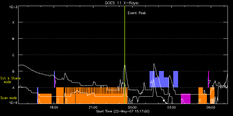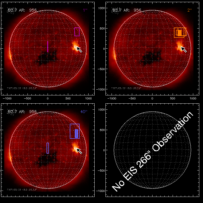 EIS Observation timeline overlay to GOES-Xray curve Code 1" 2" 40" 266" EIS Observations list for this event: STUDY ACRONYM ID DATE OBSERVED DESCRIPTION NOAA# TARGET 0 AR_spectral_atlas_3 | 2820 | 2007/05/22 16:43:34 | Spectral Atlas 3, with slot context ra | | Active Region TIMELINE ID DATE OBSERVED FITS FILE XCEN (+W/-E) YCEN (+N/-S) DUR ----------------------------------------------------------------------------------------------------------------- 2820 | 2007/05/22 16:43:34.000 | eis_l0_20070522_164334.fits.gz | 667.28 | 459.13 | 3m33s 2820 | 2007/05/22 16:47:38.000 | eis_l0_20070522_164738.fits.gz | 654.69 | 390.34 | 1h1m13s 1 SYNOP001 | 2815 | 2007/05/22 18:01:20 | SYNOP001_40arcsec_1arcsec_30s_90s | | Quiet Sun TIMELINE ID DATE OBSERVED FITS FILE XCEN (+W/-E) YCEN (+N/-S) DUR ----------------------------------------------------------------------------------------------------------------- 2815 | 2007/05/22 18:01:20.000 | eis_l0_20070522_180120.fits.gz | 0.27 | 45.49 | 2m1s 2815 | 2007/05/22 18:03:35.000 | eis_l0_20070522_180335.fits.gz | 0.47 | 45.60 | 2m1s 2 CAM_ARTB_RHESSI_a_1 | 2821 | 2007/05/22 18:11:27 | AR microflares and TR response - joint | | Active Region TIMELINE ID DATE OBSERVED FITS FILE XCEN (+W/-E) YCEN (+N/-S) DUR ----------------------------------------------------------------------------------------------------------------- 2821 | 2007/05/22 18:11:27.000 | eis_l0_20070522_181127.fits.gz | 661.25 | 388.54 | 33m7s 3 CAM_ARTB_RHESSI_b_1 | 2822 | 2007/05/22 18:49:12 | AR microflares and TR response - joint | 956 | Active Region TIMELINE ID DATE OBSERVED FITS FILE XCEN (+W/-E) YCEN (+N/-S) DUR ----------------------------------------------------------------------------------------------------------------- 2822 | 2007/05/22 18:49:12.000 | eis_l0_20070522_184912.fits.gz | 664.16 | 375.24 | 3m50s 2822 | 2007/05/22 18:53:05.000 | eis_l0_20070522_185305.fits.gz | 664.43 | 375.47 | 3m50s 2822 | 2007/05/22 18:56:58.000 | eis_l0_20070522_185658.fits.gz | 664.91 | 375.68 | 3m50s 2822 | 2007/05/22 19:00:50.000 | eis_l0_20070522_190050.fits.gz | 665.30 | 375.81 | 3m50s 2822 | 2007/05/22 19:04:43.000 | eis_l0_20070522_190443.fits.gz | 665.65 | 376.06 | 3m50s 2822 | 2007/05/22 19:08:36.000 | eis_l0_20070522_190836.fits.gz | 666.19 | 376.36 | 3m50s 2822 | 2007/05/22 19:12:29.000 | eis_l0_20070522_191229.fits.gz | 666.65 | 376.49 | 3m50s 2822 | 2007/05/22 19:16:21.000 | eis_l0_20070522_191621.fits.gz | 667.05 | 376.73 | 3m50s 2822 | 2007/05/22 19:20:14.000 | eis_l0_20070522_192014.fits.gz | 668.35 | 375.87 | 3m50s 2822 | 2007/05/22 19:24:07.000 | eis_l0_20070522_192407.fits.gz | 667.85 | 377.06 | 3m50s 2822 | 2007/05/22 19:27:59.000 | eis_l0_20070522_192759.fits.gz | 668.35 | 377.37 | 3m50s 2822 | 2007/05/22 19:31:52.000 | eis_l0_20070522_193152.fits.gz | 668.81 | 377.48 | 3m50s 2822 | 2007/05/22 19:35:45.000 | eis_l0_20070522_193545.fits.gz | 681.01 | 26.64 | 1m31s 2822 | 2007/05/22 19:39:38.000 | eis_l0_20070522_193938.fits.gz | 669.63 | 377.88 | 3m50s 2822 | 2007/05/22 19:43:30.000 | eis_l0_20070522_194330.fits.gz | 670.01 | 378.07 | 3m50s 2822 | 2007/05/22 19:47:23.000 | eis_l0_20070522_194723.fits.gz | 670.42 | 378.27 | 3m50s 2822 | 2007/05/22 19:51:15.000 | eis_l0_20070522_195115.fits.gz | 670.86 | 378.46 | 3m51s 2822 | 2007/05/22 19:55:08.000 | eis_l0_20070522_195508.fits.gz | 671.22 | 378.64 | 3m50s 2822 | 2007/05/22 19:59:01.000 | eis_l0_20070522_195901.fits.gz | 671.64 | 378.91 | 3m50s 2822 | 2007/05/22 20:02:53.000 | eis_l0_20070522_200253.fits.gz | 672.14 | 379.10 | 3m50s 2822 | 2007/05/22 20:06:46.000 | eis_l0_20070522_200646.fits.gz | 672.56 | 379.31 | 3m50s 2822 | 2007/05/22 20:10:39.000 | eis_l0_20070522_201039.fits.gz | 673.01 | 379.52 | 3m50s 2822 | 2007/05/22 20:14:31.000 | eis_l0_20070522_201431.fits.gz | 673.41 | 379.75 | 3m50s 2822 | 2007/05/22 20:18:24.000 | eis_l0_20070522_201824.fits.gz | 673.81 | 379.91 | 3m50s 2822 | 2007/05/22 20:22:17.000 | eis_l0_20070522_202217.fits.gz | 674.24 | 380.12 | 3m50s 2822 | 2007/05/22 20:26:09.000 | eis_l0_20070522_202609.fits.gz | 674.64 | 380.36 | 3m51s 2822 | 2007/05/22 20:30:02.000 | eis_l0_20070522_203002.fits.gz | 675.10 | 380.50 | 3m50s 2822 | 2007/05/22 20:33:55.000 | eis_l0_20070522_203355.fits.gz | 675.46 | 380.67 | 3m50s 2822 | 2007/05/22 20:37:48.000 | eis_l0_20070522_203748.fits.gz | 675.89 | 380.90 | 3m50s 2822 | 2007/05/22 20:41:40.000 | eis_l0_20070522_204140.fits.gz | 676.30 | 381.11 | 3m51s 2822 | 2007/05/22 20:45:33.000 | eis_l0_20070522_204533.fits.gz | 676.75 | 381.27 | 3m50s 2822 | 2007/05/22 20:49:26.000 | eis_l0_20070522_204926.fits.gz | 677.20 | 381.56 | 3m50s 2822 | 2007/05/22 20:53:18.000 | eis_l0_20070522_205318.fits.gz | 677.56 | 381.75 | 3m51s 2822 | 2007/05/22 20:57:11.000 | eis_l0_20070522_205711.fits.gz | 678.02 | 381.89 | 3m50s 2822 | 2007/05/22 21:01:04.000 | eis_l0_20070522_210104.fits.gz | 678.42 | 382.13 | 3m50s 2822 | 2007/05/22 21:04:56.000 | eis_l0_20070522_210456.fits.gz | 678.86 | 382.36 | 3m51s 2822 | 2007/05/22 21:08:49.000 | eis_l0_20070522_210849.fits.gz | 679.23 | 382.55 | 3m50s 2822 | 2007/05/22 21:12:42.000 | eis_l0_20070522_211242.fits.gz | 679.71 | 382.66 | 3m50s 2822 | 2007/05/22 21:16:35.000 | eis_l0_20070522_211635.fits.gz | 680.11 | 382.92 | 3m50s 2822 | 2007/05/22 21:20:27.000 | eis_l0_20070522_212027.fits.gz | 680.52 | 383.09 | 3m51s 2822 | 2007/05/22 21:24:20.000 | eis_l0_20070522_212420.fits.gz | 680.97 | 383.34 | 3m50s 2822 | 2007/05/22 21:28:13.000 | eis_l0_20070522_212813.fits.gz | 681.33 | 383.51 | 3m50s 2822 | 2007/05/22 21:32:05.000 | eis_l0_20070522_213205.fits.gz | 681.80 | 383.70 | 3m51s 2822 | 2007/05/22 21:35:58.000 | eis_l0_20070522_213558.fits.gz | 682.18 | 383.92 | 3m50s 2822 | 2007/05/22 21:39:51.000 | eis_l0_20070522_213951.fits.gz | 682.57 | 384.05 | 3m50s 2822 | 2007/05/22 21:43:44.000 | eis_l0_20070522_214344.fits.gz | 682.95 | 384.24 | 3m50s 2822 | 2007/05/22 21:47:36.000 | eis_l0_20070522_214736.fits.gz | 683.42 | 384.54 | 3m51s 2822 | 2007/05/22