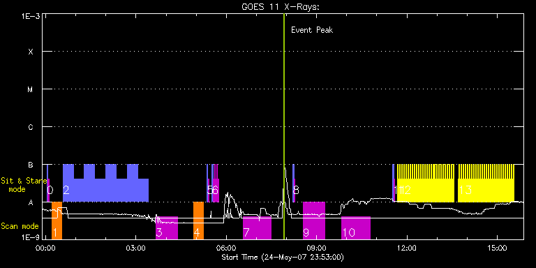 EIS Observation timeline overlay to GOES-Xray curve Code 1" 2" 40" 266" EIS Observations list for this event: STUDY ACRONYM ID DATE OBSERVED DESCRIPTION NOAA# TARGET 0 SYNOP001 | 2854 | 2007/05/25 00:02:34 | SYNOP001_40arcsec_1arcsec_30s_90s | | Quiet Sun TIMELINE ID DATE OBSERVED FITS FILE XCEN (+W/-E) YCEN (+N/-S) DUR ----------------------------------------------------------------------------------------------------------------- 2854 | 2007/05/25 00:02:34.000 | eis_l0_20070525_000234.fits.gz | 0.40 | 45.51 | 2m1s 2854 | 2007/05/25 00:04:49.000 | eis_l0_20070525_000449.fits.gz | 0.40 | 45.56 | 2m2s 1 cam_artb_cds_a | 2855 | 2007/05/25 00:12:27 | Active Region Transient Brightenings | | Active Region TIMELINE ID DATE OBSERVED FITS FILE XCEN (+W/-E) YCEN (+N/-S) DUR ----------------------------------------------------------------------------------------------------------------- 2855 | 2007/05/25 00:12:27.000 | eis_l0_20070525_001227.fits.gz | 909.36 | 526.43 | 19m17s 2 cam_artb_cds_b | 2856 | 2007/05/25 00:34:20 | Active Region Transient Brightenings ( | | Active Region TIMELINE ID DATE OBSERVED FITS FILE XCEN (+W/-E) YCEN (+N/-S) DUR ----------------------------------------------------------------------------------------------------------------- 2856 | 2007/05/25 00:34:20.000 | eis_l0_20070525_003420.fits.gz | 911.96 | 524.62 | 21m10s 2856 | 2007/05/25 00:55:33.000 | eis_l0_20070525_005533.fits.gz | 912.83 | 525.01 | 21m10s 2856 | 2007/05/25 01:16:47.000 | eis_l0_20070525_011647.fits.gz | 913.70 | 525.37 | 21m10s 2856 | 2007/05/25 01:38:00.000 | eis_l0_20070525_013800.fits.gz | 914.54 | 525.79 | 21m10s 2856 | 2007/05/25 01:59:14.000 | eis_l0_20070525_015914.fits.gz | 915.40 | 526.14 | 21m32s 2856 | 2007/05/25 02:20:50.000 | eis_l0_20070525_022050.fits.gz | 916.23 | 526.56 | 21m10s 2856 | 2007/05/25 02:42:03.000 | eis_l0_20070525_024203.fits.gz | 917.03 | 526.88 | 21m10s 2856 | 2007/05/25 03:03:16.000 | eis_l0_20070525_030316.fits.gz | 920.92 | 528.77 | 21m10s 3 cam_artb_cds_c | 2857 | 2007/05/25 03:39:19 | Active_Region_Transient_Brightenings_v | | Active Region TIMELINE ID DATE OBSERVED FITS FILE XCEN (+W/-E) YCEN (+N/-S) DUR ----------------------------------------------------------------------------------------------------------------- 2857 | 2007/05/25 03:39:19.000 | eis_l0_20070525_033919.fits.gz | 920.06 | 530.79 | 43m9s 4 cam_artb_cds_a | 2858 | 2007/05/25 04:54:26 | Active Region Transient Brightenings | | Active Region TIMELINE ID DATE OBSERVED FITS FILE XCEN (+W/-E) YCEN (+N/-S) DUR ----------------------------------------------------------------------------------------------------------------- 2858 | 2007/05/25 04:54:26.000 | eis_l0_20070525_045426.fits.gz | 920.20 | 530.62 | 19m17s 5 SYNOP001 | 2859 | 2007/05/25 05:21:20 | SYNOP001_40arcsec_1arcsec_30s_90s | | Quiet Sun TIMELINE ID DATE OBSERVED FITS FILE XCEN (+W/-E) YCEN (+N/-S) DUR ----------------------------------------------------------------------------------------------------------------- 2859 | 2007/05/25 05:21:20.000 | eis_l0_20070525_052120.fits.gz | 0.33 | 45.56 | 2m1s 2859 | 2007/05/25 05:23:35.000 | eis_l0_20070525_052335.fits.gz | 0.34 | 45.48 | 2m1s 6 SYNOP001 | 2865 | 2007/05/25 05:31:34 | SYNOP001_40arcsec_1arcsec_30s_90s | | Quiet Sun TIMELINE ID DATE OBSERVED FITS FILE XCEN (+W/-E) YCEN (+N/-S) DUR ----------------------------------------------------------------------------------------------------------------- 2865 | 2007/05/25 05:31:34.000 | eis_l0_20070525_053134.fits.gz | 923.92 | 560.01 | 2m1s 2865 | 2007/05/25 05:33:49.000 | eis_l0_20070525_053349.fits.gz | 915.20 | 555.67 | 2m2s 2865 | 2007/05/25 05:36:05.000 | eis_l0_20070525_053605.fits.gz | 915.30 | 555.65 | 2m1s 2865 | 2007/05/25 05:38:20.000 | eis_l0_20070525_053820.fits.gz | 915.41 | 555.65 | 2m2s 2865 | 2007/05/25 05:40:36.000 | eis_l0_20070525_054036.fits.gz | 915.51 | 555.68 | 2m1s 2865 | 2007/05/25 05:42:51.000 | eis_l0_20070525_054251.fits.gz | 915.57 | 555.75 | 2m1s 7 HPW008_FULLCCD_RAST | 2861 | 2007/05/25 06:33:12 | HPW008_FULLCCD_RAST_128x128_25s_SLIT1 | | Active Region TIMELINE ID DATE OBSERVED FITS FILE XCEN (+W/-E) YCEN (+N/-S) DUR ----------------------------------------------------------------------------------------------------------------- 2861 | 2007/05/25 06:33:12.000 | eis_l0_20070525_063312.fits.gz | 926.68 | 517.67 | 56m41s 8 SYNOP001 | 2862 | 2007/05/25 08:12:33 | SYNOP001_40arcsec_1arcsec_30s_90s | | Quiet Sun TIMELINE ID DATE OBSERVED FITS FILE XCEN (+W/-E) YCEN (+N/-S) DUR ----------------------------------------------------------------------------------------------------------------- 2862 | 2007/05/25 08:12:33.000 | eis_l0_20070525_081233.fits.gz | 928.90 | 562.05 | 2m2s 2862 | 2007/05/25 08:14:49.000 | eis_l0_20070525_081449.fits.gz | 920.43 | 557.90 | 2m1s 9 QS_atlas_offlimb | 2863 | 2007/05/25 08:33:12 | Off-limb quiet Sun spectral atlas; ste | | Quiet Sun TIMELINE ID DATE OBSERVED FITS FILE XCEN (+W/-E) YCEN (+N/-S) DUR ----------------------------------------------------------------------------------------------------------------- 2863 | 2007/05/25 08:33:12.000 | eis_l0_20070525_083312.fits.gz | 921.69 | 572.90 | 43m40s 10 HPW008_FULLCCD_RAST | 2864 | 2007/05/25 09:50:12 | HPW008_FULLCCD_RAST_128x128_25s_SLIT1 | | Active Region TIMELINE ID DATE OBSERVED FITS FILE XCEN (+W/-E) YCEN (+N/-S) DUR ----------------------------------------------------------------------------------------------------------------- 2864 | 2007/05/25 09:50:12.000 | eis_l0_20070525_095012.fits.gz | 932.41 | 520.14 | 56m40s 11 SYNOP001 | 2870 | 2007/05/25 11:31:34 | SYNOP001_40arcsec_1arcsec_30s_90s | | Quiet Sun TIMELINE ID DATE OBSERVED FITS FILE XCEN (+W/-E) YCEN (+N/-S) DUR ----------------------------------------------------------------------------------------------------------------- 2870 | 2007/05/25 11:31:34.000 | eis_l0_20070525_113134.fits.gz | 0.36 | 45.53 | 2m2s 2870 | 2007/05/25 11:33:50.000 | eis_l0_20070525_113350.fits.gz | 0.39