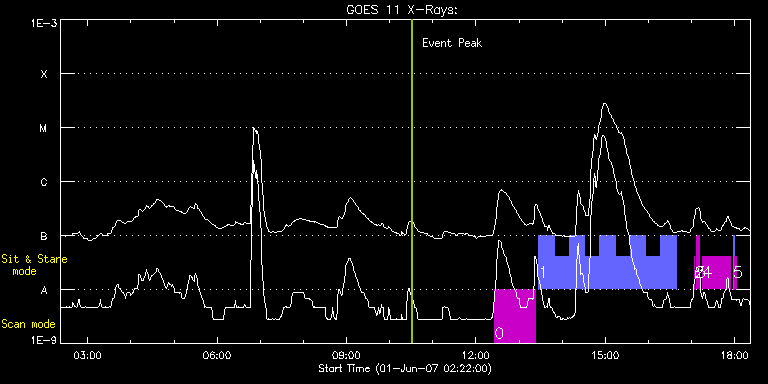 EIS Observation timeline overlay to GOES-Xray curve Code 1" 2" 40" 266" EIS Observations list for this event: STUDY ACRONYM ID DATE OBSERVED DESCRIPTION NOAA# TARGET 0 HPW008_FULLCCD_RAST | 2989 | 2007/06/01 12:25:51 | HPW008_FULLCCD_RAST_128x128_25s_SLIT1 | | Active Region TIMELINE ID DATE OBSERVED FITS FILE XCEN (+W/-E) YCEN (+N/-S) DUR ----------------------------------------------------------------------------------------------------------------- 2989 | 2007/06/01 12:25:51.000 | eis_l0_20070601_122551.fits.gz | -18.82 | -70.48 | 56m40s 1 cam_artb_cds_b | 2990 | 2007/06/01 13:27:34 | Active Region Transient Brightenings ( | | Active Region TIMELINE ID DATE OBSERVED FITS FILE XCEN (+W/-E) YCEN (+N/-S) DUR ----------------------------------------------------------------------------------------------------------------- 2990 | 2007/06/01 13:27:34.000 | eis_l0_20070601_132734.fits.gz | -13.01 | -49.74 | 21m10s 2990 | 2007/06/01 13:48:48.000 | eis_l0_20070601_134848.fits.gz | -9.81 | -48.07 | 21m10s 2990 | 2007/06/01 14:10:01.000 | eis_l0_20070601_141001.fits.gz | -6.66 | -46.48 | 21m10s 2990 | 2007/06/01 14:31:14.000 | eis_l0_20070601_143114.fits.gz | -3.53 | -44.90 | 21m10s 2990 | 2007/06/01 14:52:28.000 | eis_l0_20070601_145228.fits.gz | -0.39 | -43.32 | 21m10s 2990 | 2007/06/01 15:13:41.000 | eis_l0_20070601_151341.fits.gz | 2.72 | -41.79 | 21m10s 2990 | 2007/06/01 15:34:55.000 | eis_l0_20070601_153455.fits.gz | 5.92 | -40.18 | 21m9s 2990 | 2007/06/01 15:56:08.000 | eis_l0_20070601_155608.fits.gz | 9.12 | -38.65 | 21m10s 2990 | 2007/06/01 16:17:21.000 | eis_l0_20070601_161721.fits.gz | 12.26 | -37.09 | 21m10s 2 regcal014 | 2998 | 2007/06/01 17:04:22 | ADC offset | | Engineering TIMELINE ID DATE OBSERVED FITS FILE XCEN (+W/-E) YCEN (+N/-S) DUR ----------------------------------------------------------------------------------------------------------------- 2998 | 2007/06/01 17:04:22.000 | eis_l0_20070601_170422.fits.gz | 32.24 | 25.86 | 3 regcal015 | 3001 | 2007/06/01 17:06:12 | Dark current, hot pixels and column de | | Engineering TIMELINE ID DATE OBSERVED FITS FILE XCEN (+W/-E) YCEN (+N/-S) DUR ----------------------------------------------------------------------------------------------------------------- 3001 | 2007/06/01 17:06:12.000 | eis_l0_20070601_170612.fits.gz | 32.78 | 26.17 | 4m24s 4 regcal016 | 3002 | 2007/06/01 17:15:12 | Dark current, hot pixels and column de | | Engineering TIMELINE ID DATE OBSERVED FITS FILE XCEN (+W/-E) YCEN (+N/-S) DUR ----------------------------------------------------------------------------------------------------------------- 3002 | 2007/06/01 17:15:12.000 | eis_l0_20070601_171512.fits.gz | 36.04 | 27.78 | 38m32s 5 SYNOP001 | 2979 | 2007/06/01 17:57:43 | SYNOP001_40arcsec_1arcsec_30s_90s | | Quiet Sun TIMELINE ID DATE OBSERVED FITS FILE XCEN (+W/-E) YCEN (+N/-S) DUR ----------------------------------------------------------------------------------------------------------------- 2979 | 2007/06/01 17:57:43.000 | eis_l0_20070601_175743.fits.gz | 0.30 | 45.54 | 2m2s 2979 | 2007/06/01 17:59:59.000 | eis_l0_20070601_175959.fits.gz | 0.34 | 45.56 | 2m1s : Check study information : Download file : View thumbnails For this event, also check for: