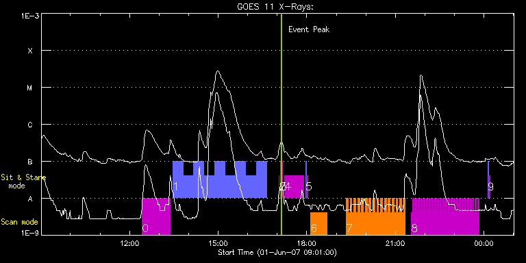 EIS Observation timeline overlay to GOES-Xray curve Code 1" 2" 40" 266" EIS Observations list for this event: STUDY ACRONYM ID DATE OBSERVED DESCRIPTION NOAA# TARGET 0 HPW008_FULLCCD_RAST | 2989 | 2007/06/01 12:25:51 | HPW008_FULLCCD_RAST_128x128_25s_SLIT1 | | Active Region TIMELINE ID DATE OBSERVED FITS FILE XCEN (+W/-E) YCEN (+N/-S) DUR ----------------------------------------------------------------------------------------------------------------- 2989 | 2007/06/01 12:25:51.000 | eis_l0_20070601_122551.fits.gz | -18.82 | -70.48 | 56m40s 1 cam_artb_cds_b | 2990 | 2007/06/01 13:27:34 | Active Region Transient Brightenings ( | | Active Region TIMELINE ID DATE OBSERVED FITS FILE XCEN (+W/-E) YCEN (+N/-S) DUR ----------------------------------------------------------------------------------------------------------------- 2990 | 2007/06/01 13:27:34.000 | eis_l0_20070601_132734.fits.gz | -13.01 | -49.74 | 21m10s 2990 | 2007/06/01 13:48:48.000 | eis_l0_20070601_134848.fits.gz | -9.81 | -48.07 | 21m10s 2990 | 2007/06/01 14:10:01.000 | eis_l0_20070601_141001.fits.gz | -6.66 | -46.48 | 21m10s 2990 | 2007/06/01 14:31:14.000 | eis_l0_20070601_143114.fits.gz | -3.53 | -44.90 | 21m10s 2990 | 2007/06/01 14:52:28.000 | eis_l0_20070601_145228.fits.gz | -0.39 | -43.32 | 21m10s 2990 | 2007/06/01 15:13:41.000 | eis_l0_20070601_151341.fits.gz | 2.72 | -41.79 | 21m10s 2990 | 2007/06/01 15:34:55.000 | eis_l0_20070601_153455.fits.gz | 5.92 | -40.18 | 21m9s 2990 | 2007/06/01 15:56:08.000 | eis_l0_20070601_155608.fits.gz | 9.12 | -38.65 | 21m10s 2990 | 2007/06/01 16:17:21.000 | eis_l0_20070601_161721.fits.gz | 12.26 | -37.09 | 21m10s 2 regcal014 | 2998 | 2007/06/01 17:04:22 | ADC offset | | Engineering TIMELINE ID DATE OBSERVED FITS FILE XCEN (+W/-E) YCEN (+N/-S) DUR ----------------------------------------------------------------------------------------------------------------- 2998 | 2007/06/01 17:04:22.000 | eis_l0_20070601_170422.fits.gz | 32.24 | 25.86 | 3 regcal015 | 3001 | 2007/06/01 17:06:12 | Dark current, hot pixels and column de | | Engineering TIMELINE ID DATE OBSERVED FITS FILE XCEN (+W/-E) YCEN (+N/-S) DUR ----------------------------------------------------------------------------------------------------------------- 3001 | 2007/06/01 17:06:12.000 | eis_l0_20070601_170612.fits.gz | 32.78 | 26.17 | 4m24s 4 regcal016 | 3002 | 2007/06/01 17:15:12 | Dark current, hot pixels and column de | | Engineering TIMELINE ID DATE OBSERVED FITS FILE XCEN (+W/-E) YCEN (+N/-S) DUR ----------------------------------------------------------------------------------------------------------------- 3002 | 2007/06/01 17:15:12.000 | eis_l0_20070601_171512.fits.gz | 36.04 | 27.78 | 38m32s 5 SYNOP001 | 2979 | 2007/06/01 17:57:43 | SYNOP001_40arcsec_1arcsec_30s_90s | | Quiet Sun TIMELINE ID DATE OBSERVED FITS FILE XCEN (+W/-E) YCEN (+N/-S) DUR ----------------------------------------------------------------------------------------------------------------- 2979 | 2007/06/01 17:57:43.000 | eis_l0_20070601_175743.fits.gz | 0.30 | 45.54 | 2m2s 2979 | 2007/06/01 17:59:59.000 | eis_l0_20070601_175959.fits.gz | 0.34 | 45.56 | 2m1s 6 CAM_ARTB_RHESSI_a_1 | 2987 | 2007/06/01 18:07:58 | AR microflares and TR response - joint | 958 | Active Region TIMELINE ID DATE OBSERVED FITS FILE XCEN (+W/-E) YCEN (+N/-S) DUR ----------------------------------------------------------------------------------------------------------------- 2987 | 2007/06/01 18:07:58.000 | eis_l0_20070601_180758.fits.gz | -462.13 | -278.21 | 33m7s 7 CAM_ARTB_RHESSI_b_1 | 3003 | 2007/06/01 19:20:13 | AR microflares and TR response - joint | | Active Region TIMELINE ID DATE OBSERVED FITS FILE XCEN (+W/-E) YCEN (+N/-S) DUR ----------------------------------------------------------------------------------------------------------------- 3003 | 2007/06/01 19:20:13.000 | eis_l0_20070601_192013.fits.gz | -454.85 | -329.43 | 3m50s 3003 | 2007/06/01 19:24:06.000 | eis_l0_20070601_192406.fits.gz | -454.34 | -329.18 | 3m50s 3003 | 2007/06/01 19:27:58.000 | eis_l0_20070601_192758.fits.gz | -453.85 | -328.97 | 3m51s 3003 | 2007/06/01 19:31:51.000 | eis_l0_20070601_193151.fits.gz | -453.33 | -328.71 | 3m50s 3003 | 2007/06/01 19:35:44.000 | eis_l0_20070601_193544.fits.gz | -452.82 | -328.48 | 3m50s 3003 | 2007/06/01 19:39:36.000 | eis_l0_20070601_193936.fits.gz | -452.33 | -328.17 | 3m50s 3003 | 2007/06/01 19:43:29.000 | eis_l0_20070601_194329.fits.gz | -451.84 | -327.93 | 3m50s 3003 | 2007/06/01 19:47:21.000 | eis_l0_20070601_194721.fits.gz | -451.35 | -327.73 | 3m50s 3003 | 2007/06/01 19:51:14.000 | eis_l0_20070601_195114.fits.gz | -450.85 | -327.49 | 3m50s 3003 | 2007/06/01 19:55:06.000 | eis_l0_20070601_195506.fits.gz | -450.32 | -327.21 | 3m50s 3003 | 2007/06/01 19:58:59.000 | eis_l0_20070601_195859.fits.gz | -449.79 | -326.98 | 3m50s 3003 | 2007/06/01 20:02:51.000 | eis_l0_20070601_200251.fits.gz | -449.32 | -326.73 | 3m51s 3003 | 2007/06/01 20:06:44.000 | eis_l0_20070601_200644.fits.gz | -448.87 | -326.40 | 3m50s 3003 | 2007/06/01 20:10:37.000 | eis_l0_20070601_201037.fits.gz | -448.31 | -326.17 | 3m50s 3003 | 2007/06/01 20:14:29.000 | eis_l0_20070601_201429.fits.gz | -447.83 | -325.99 | 3m50s 3003 | 2007/06/01 20:18:22.000 | eis_l0_20070601_201822.fits.gz | -447.39 | -325.69 | 3m50s 3003 | 2007/06/01 20:22:15.000 | eis_l0_20070601_202215.fits.gz | -446.85 | -325.43 | 3m50s 3003 | 2007/06/01 20:26:07.000 | eis_l0_20070601_202607.fits.gz | -446.32 | -325.15 | 3m50s 3003 | 2007/06/01 20:30:00.000 | eis_l0_20070601_203000.fits.gz | -445.75 | -324.89 | 3m50s 3003 | 2007/06/01 20:33:53.000 | eis_l0_20070601_203353.fits.gz | -445.34 | -324.67 | 3m50s 3003 | 2007/06/01 20:37:45.000 | eis_l0_20070601_203745.fits.gz | -444.88 | -324.51 | 3m50s 3003 | 2007/06/01 20:41:38.000 | eis_l0_20070601_204138.fits.gz | -444.48 | -324.09 | 3m50s 3003 | 2007/06/01 20:45:31.000 | eis_l0_20070601_204531.fits.gz | -443.89 | -323.95 | 3m50s 3003 | 2007/06/01 20:49:23.000 | eis_l0_20070601_204923.fits.gz